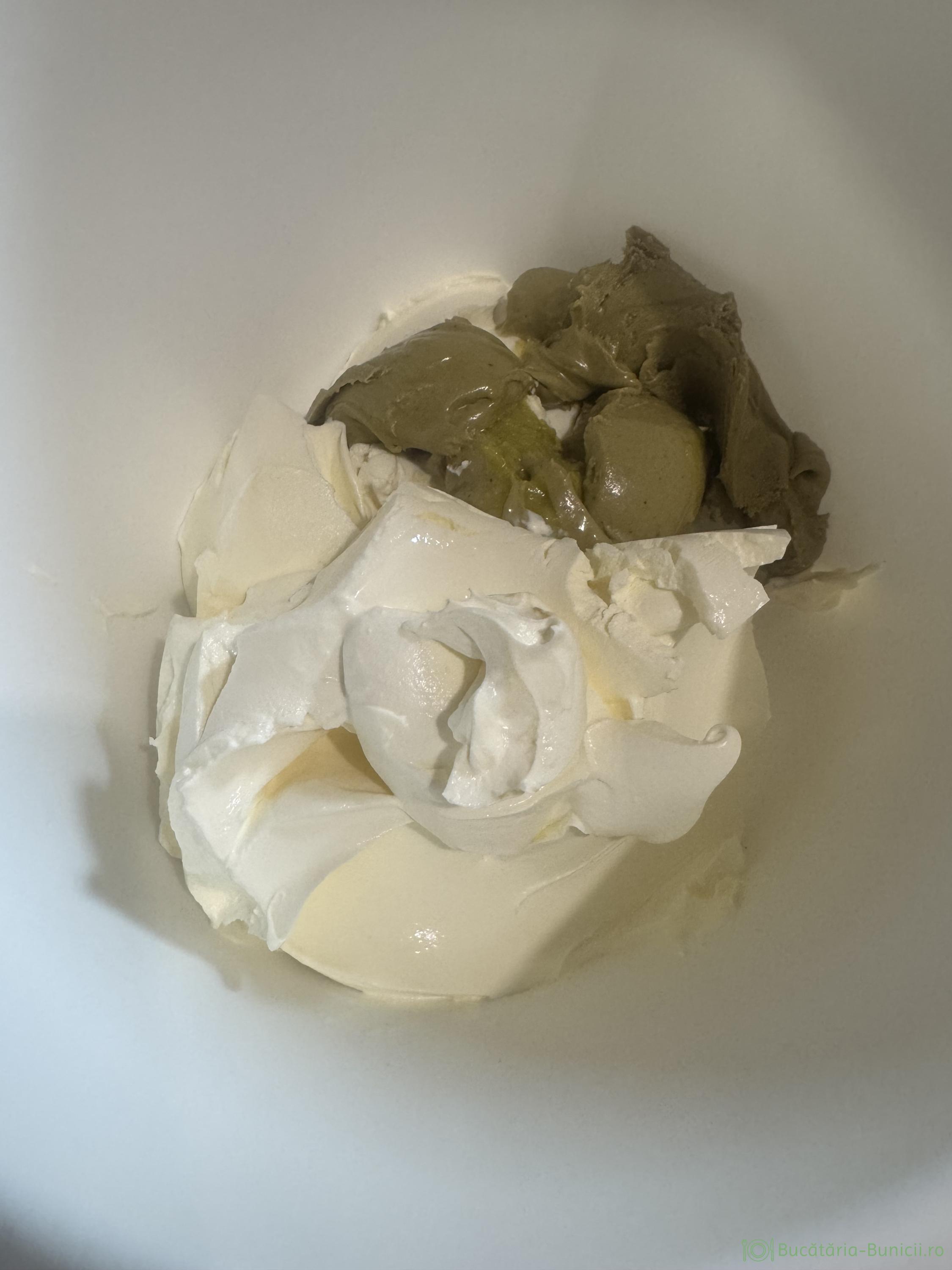 - Într-un bol se pun mascarpone, cremă de fistic și smântână, toate reci. Se mixează, cat să le omogenizăm, apoi gustăm crema și decidem cat zahăr pudră, vom adăuga, ținând cont de crema de fistic, aceasta fiind dulce.