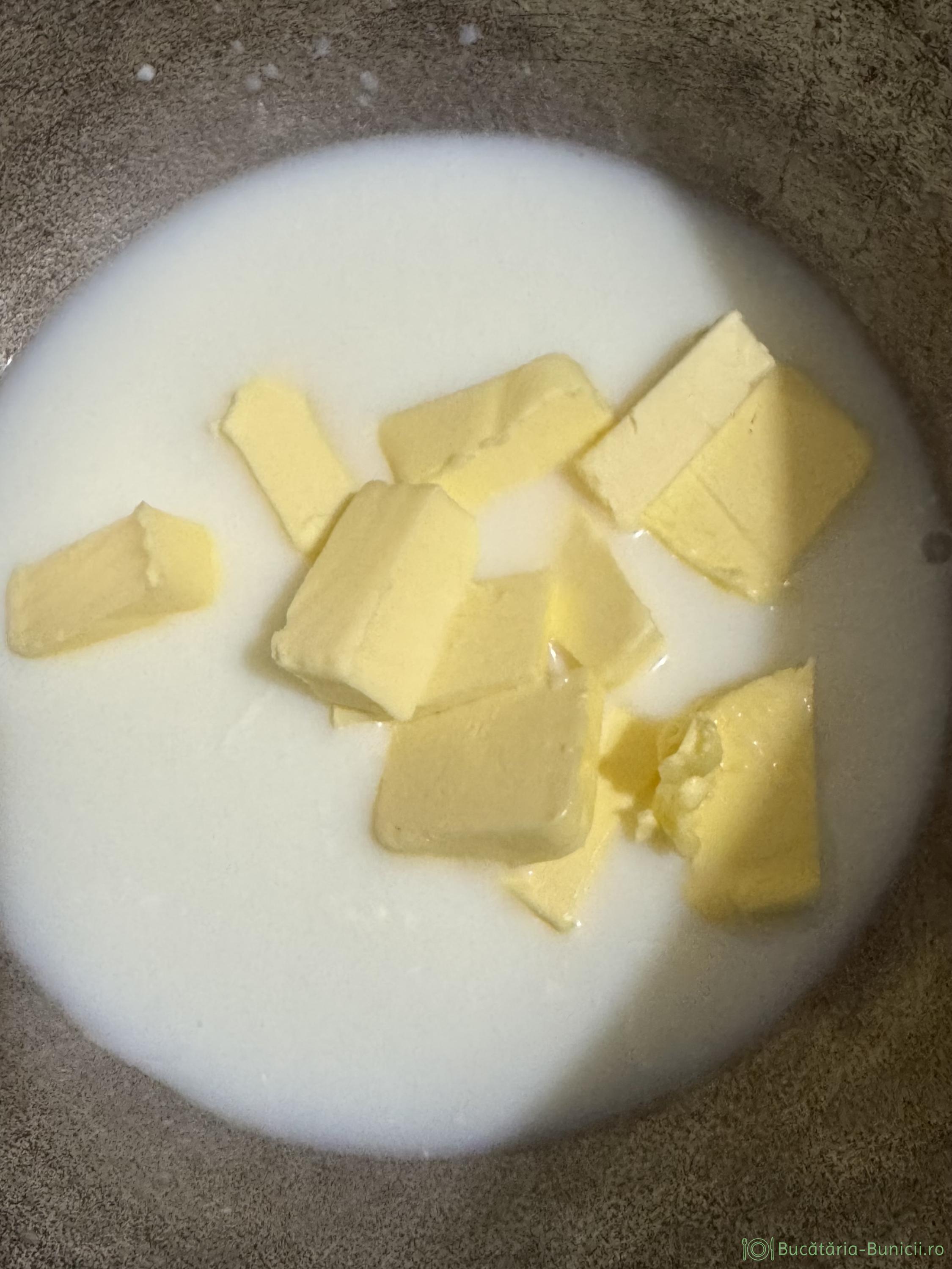 - Într-un vas antiaderent (eu am folosit un ceaun micuț de tuci) se pun apă, laptele, un praf de sare și untul. Se încălzesc, până la punctul de fierbere, când se adaugă toată făina, se amestecă și se fierbe, până absoarbe tot lichidul și obținem un aluat.