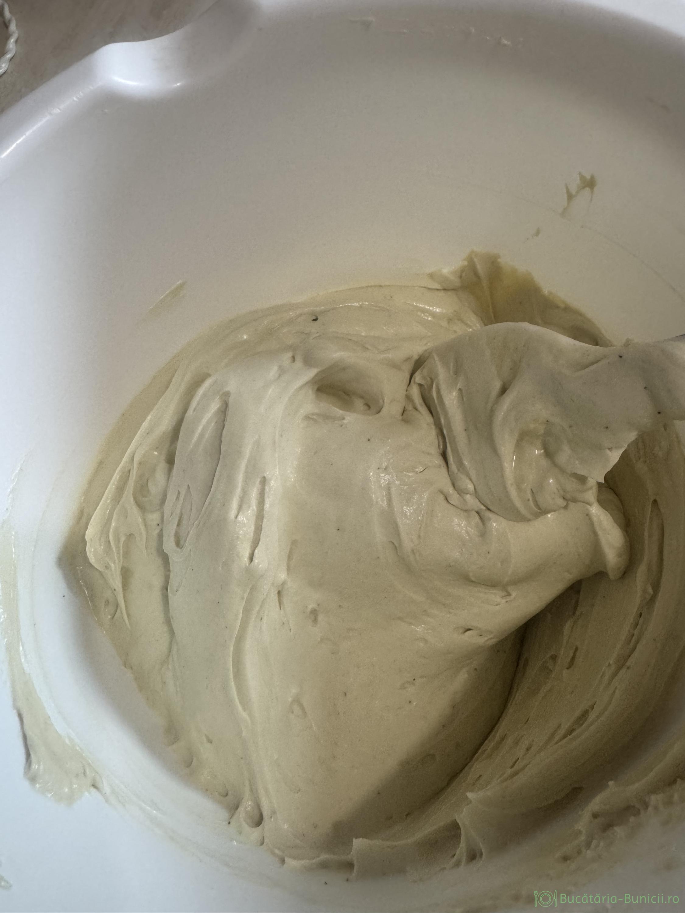- Adăugăm zahărul pudră și mixam, până obținem o cremă pufoasă, fermă și netedă. În timp ce mixam crema, încorporăm și esență de fistic.