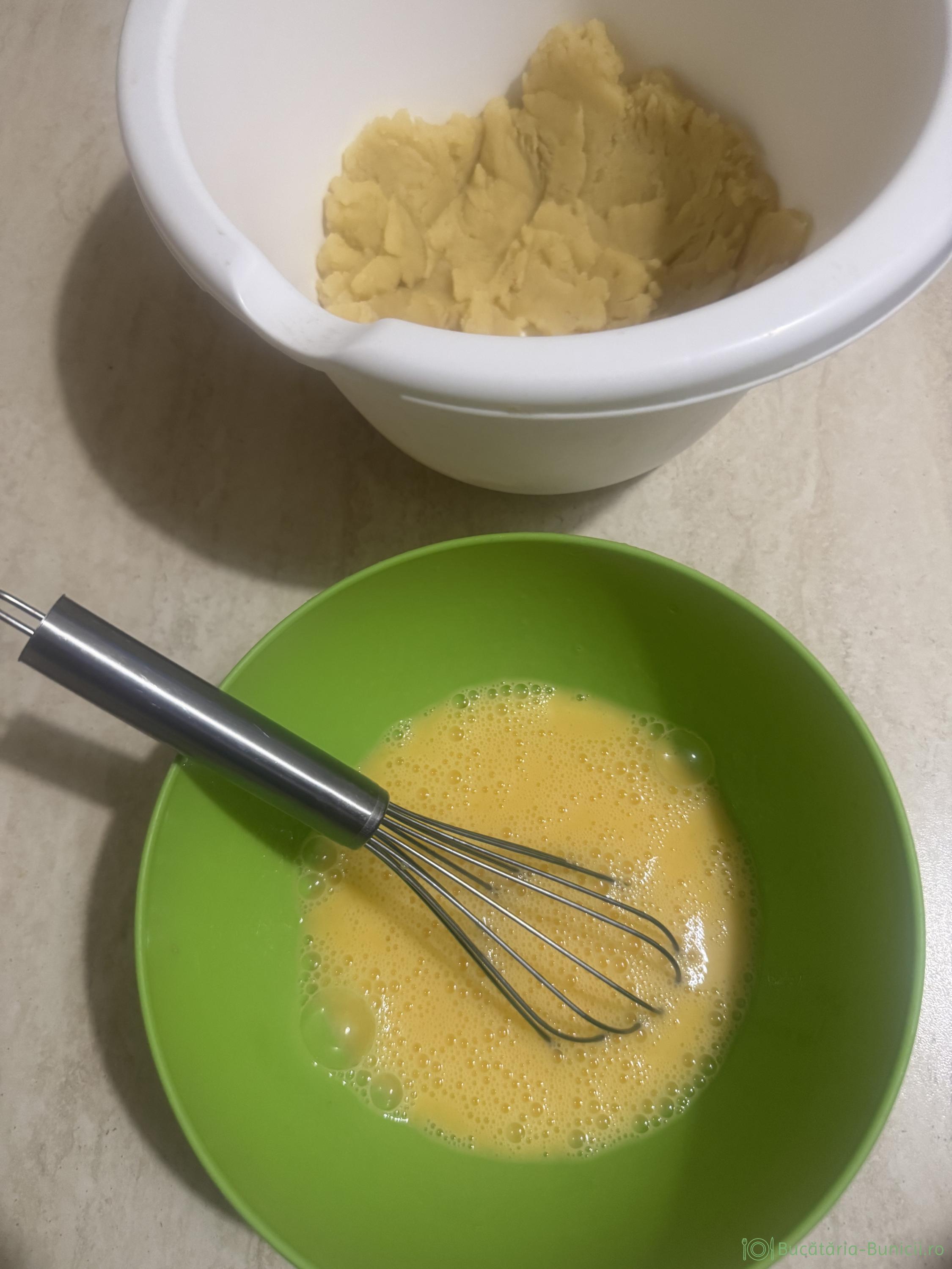 - Transferăm aluatul într-un bol, lăsăm să se răcorească puțin, timp în care batem cu o furculița, cele patru ouă într-un bol.