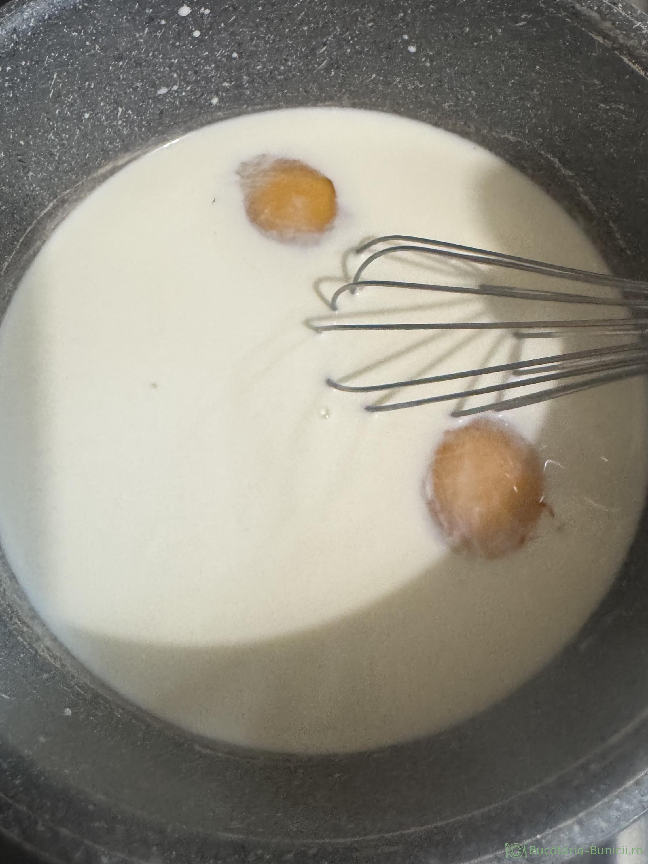 - Într-un vas încăpător punem laptele cald, smântână de gătit, ouăle, zahărul și drojdia. Se amestecă cu telul.