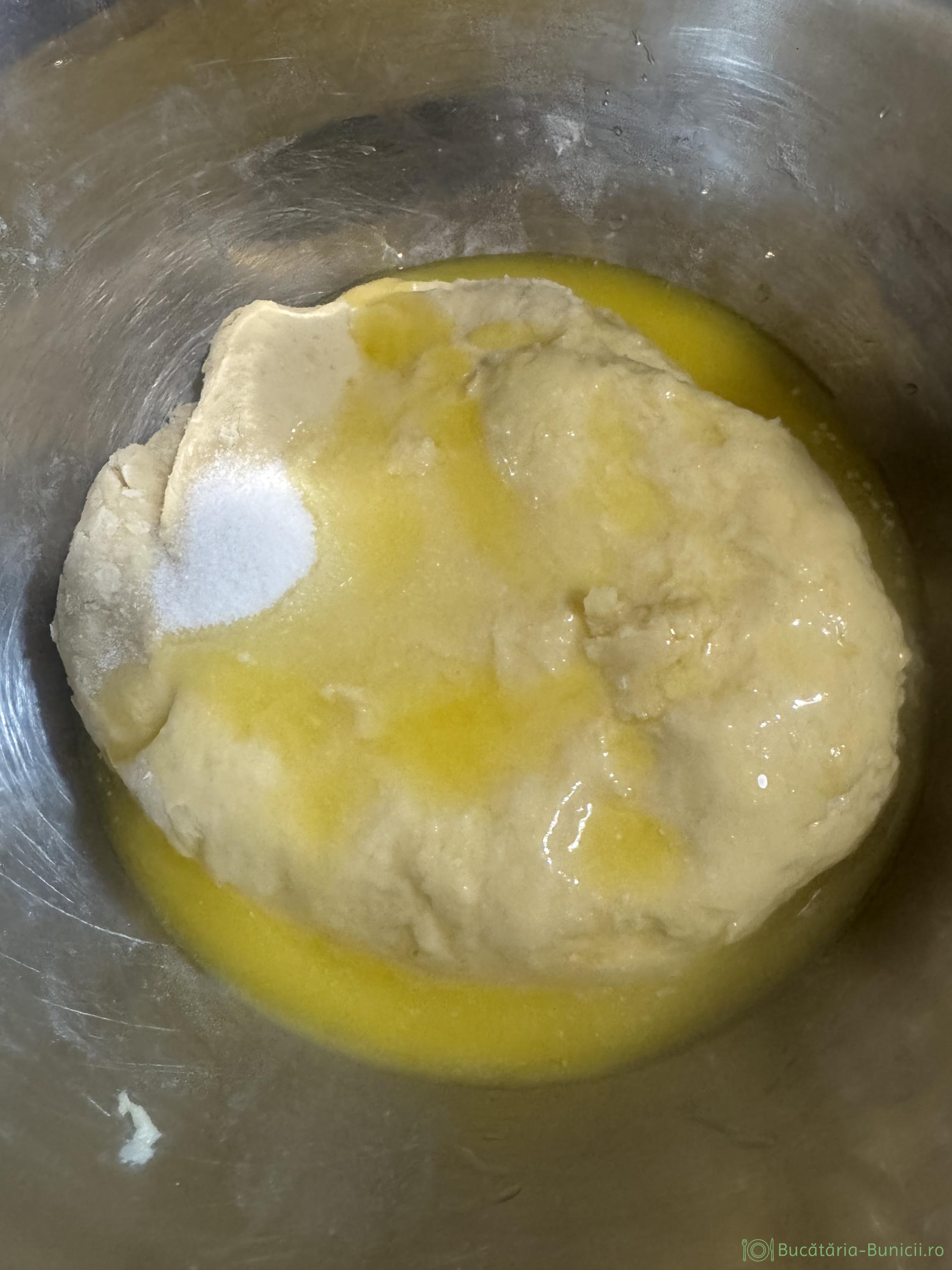 - Se pune făina și se frământă 4 minute, apoi peste aluatul obținut punem untul moale și sarea. Frământăm 6-7 minute, până obținem un aluat neted.