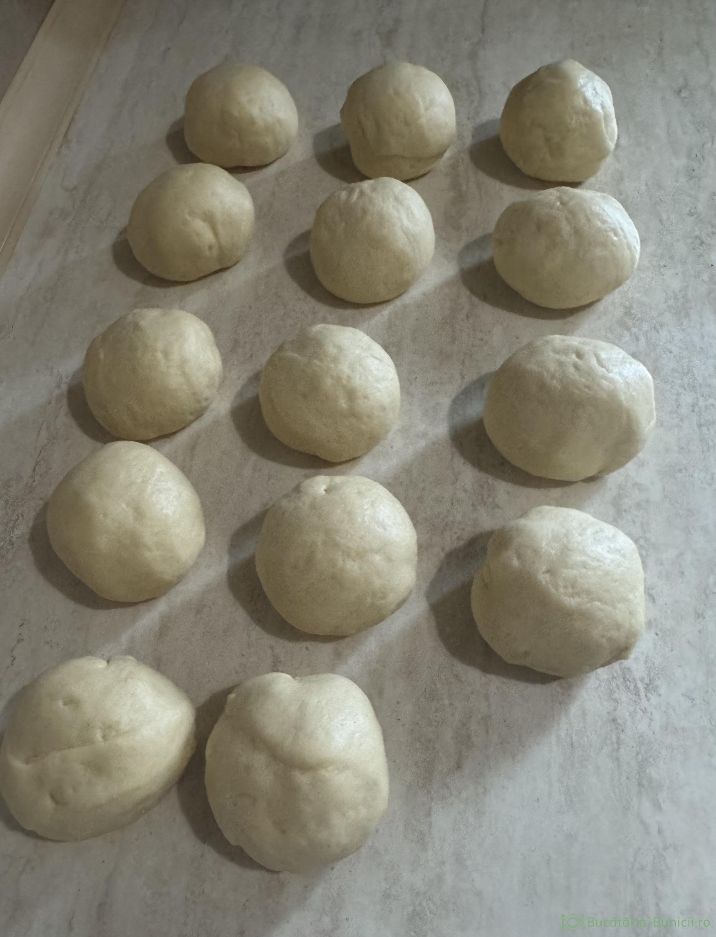 - Aluatul dospit se împarte în 14 bucăți egale, iar fiecare bucată se lucreaza, dand forma de bilă, iar la final cele 14 bile se acoperă și se lasă la dospit 15 minute.