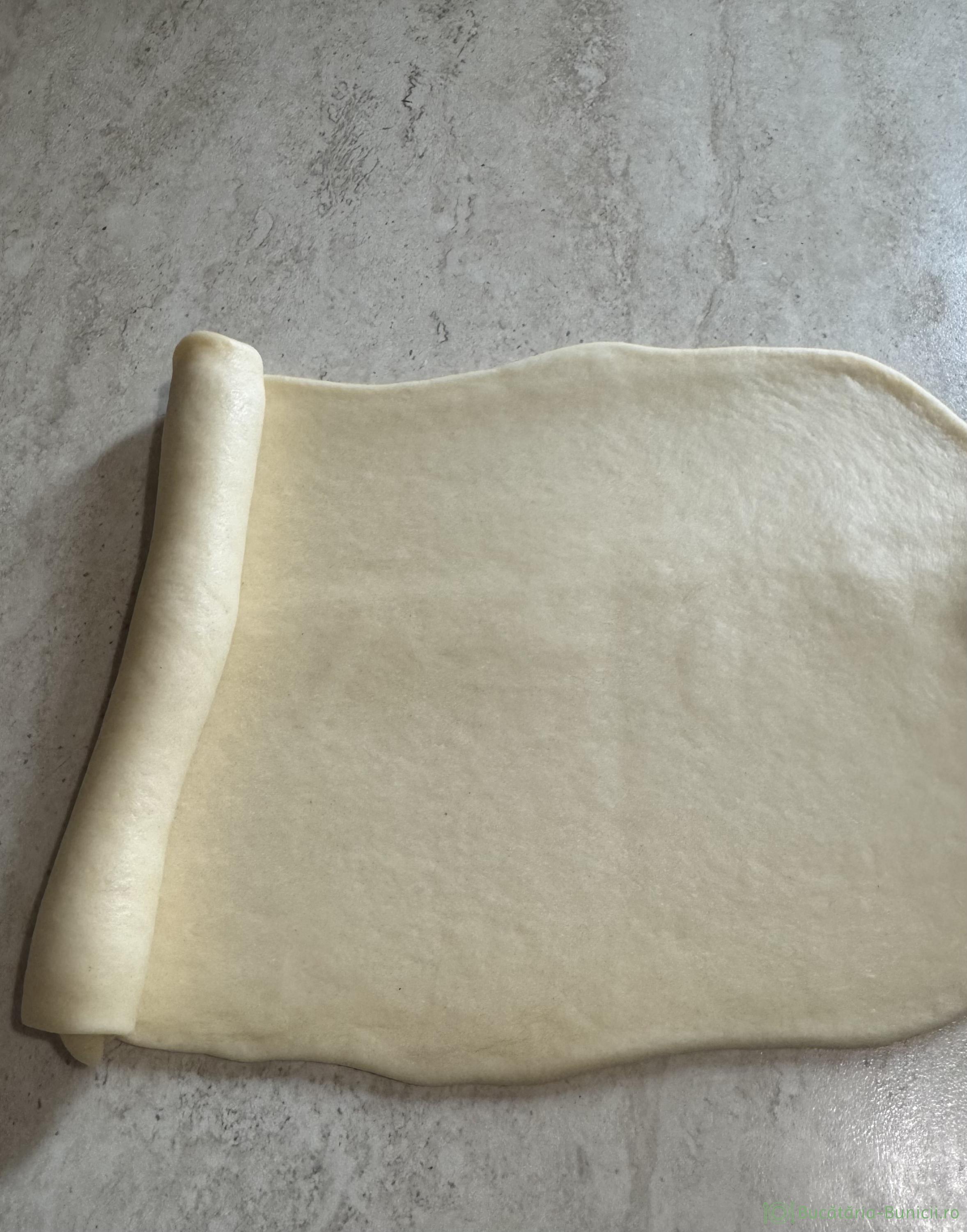 - Fiecare bilă se întinde cu sucitorul, sub forma unui dreptunghi de 25 cm lungime și 14 cm lățime. Se rulează, formând un rulou de 14 cm.