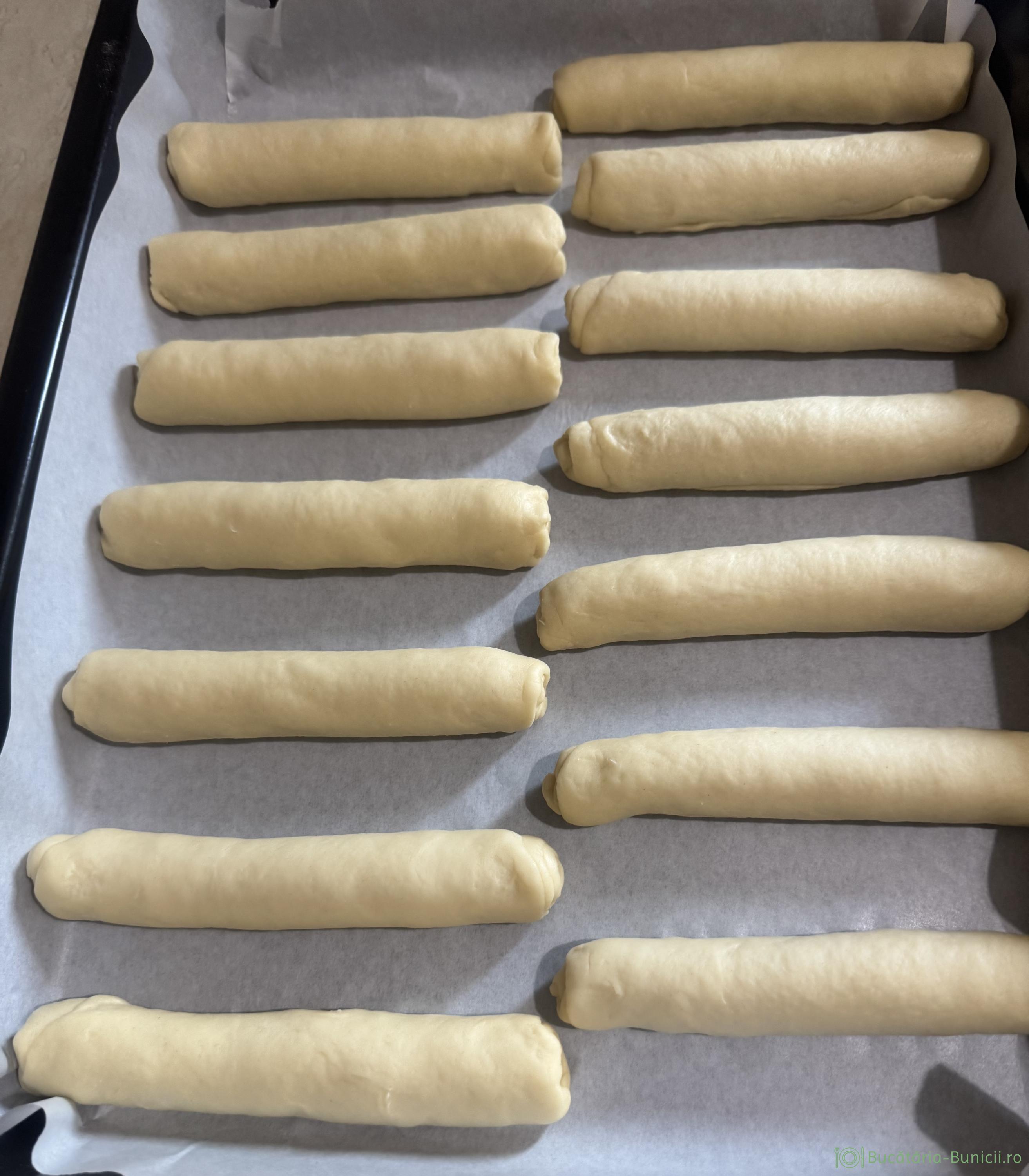 - Se așază rulourile în tavă, cu distanța între ele, se acoperă și se lasă la dospit 60 minute, sau până își dublează volumul.