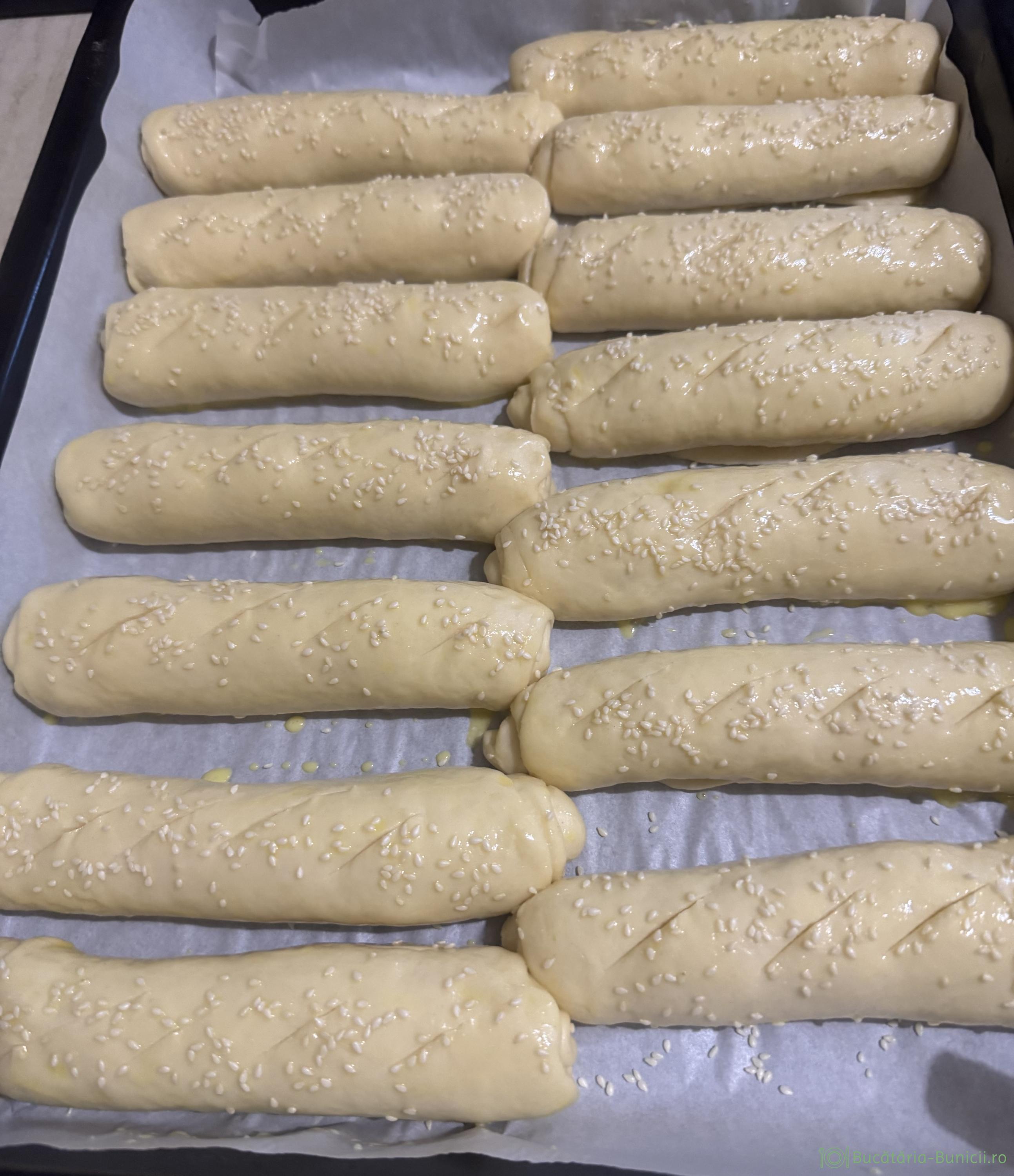 - Rulourile se ung cu gălbenuș amestecat cu lapte, se presară semințe de susan, iar opțional se crestează.