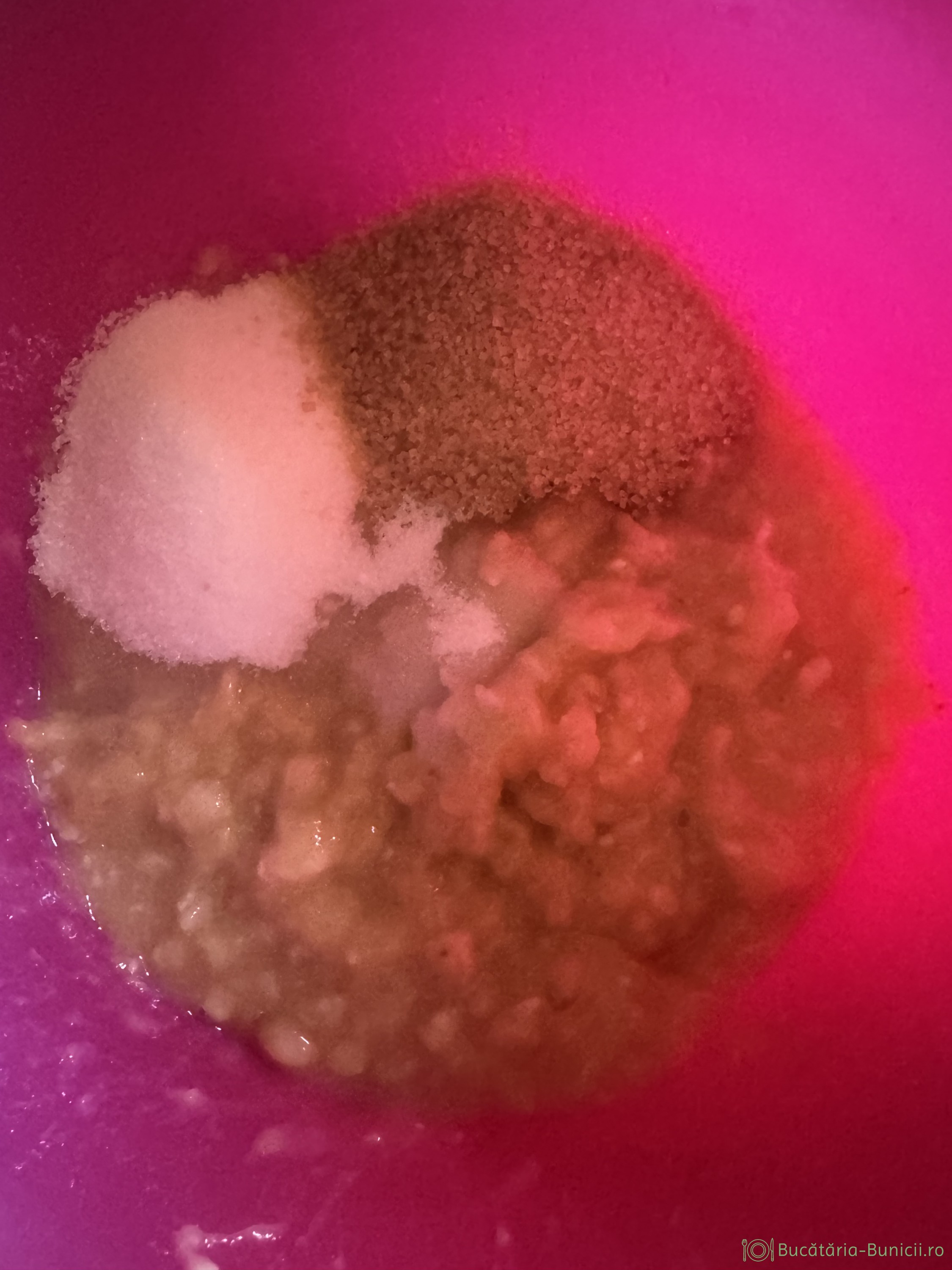 - Peste bananele pasate se pune sarea, alături de cele două tipuri de zahăr. Se amestecă cu un tel.