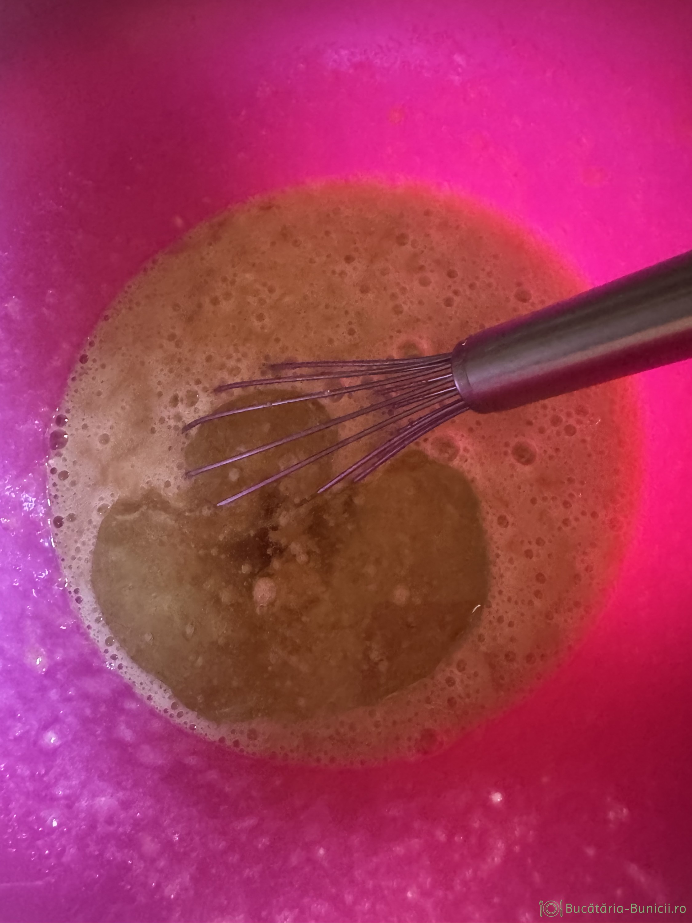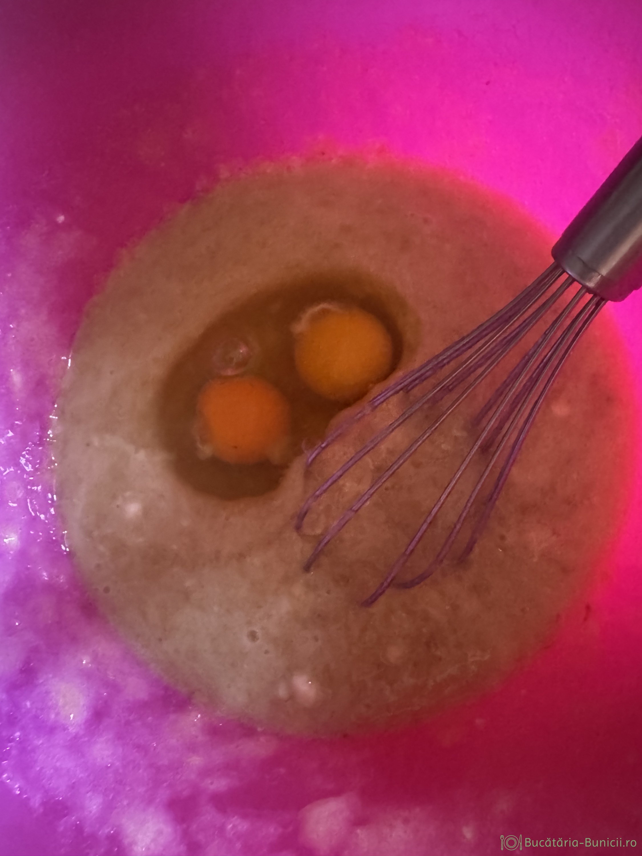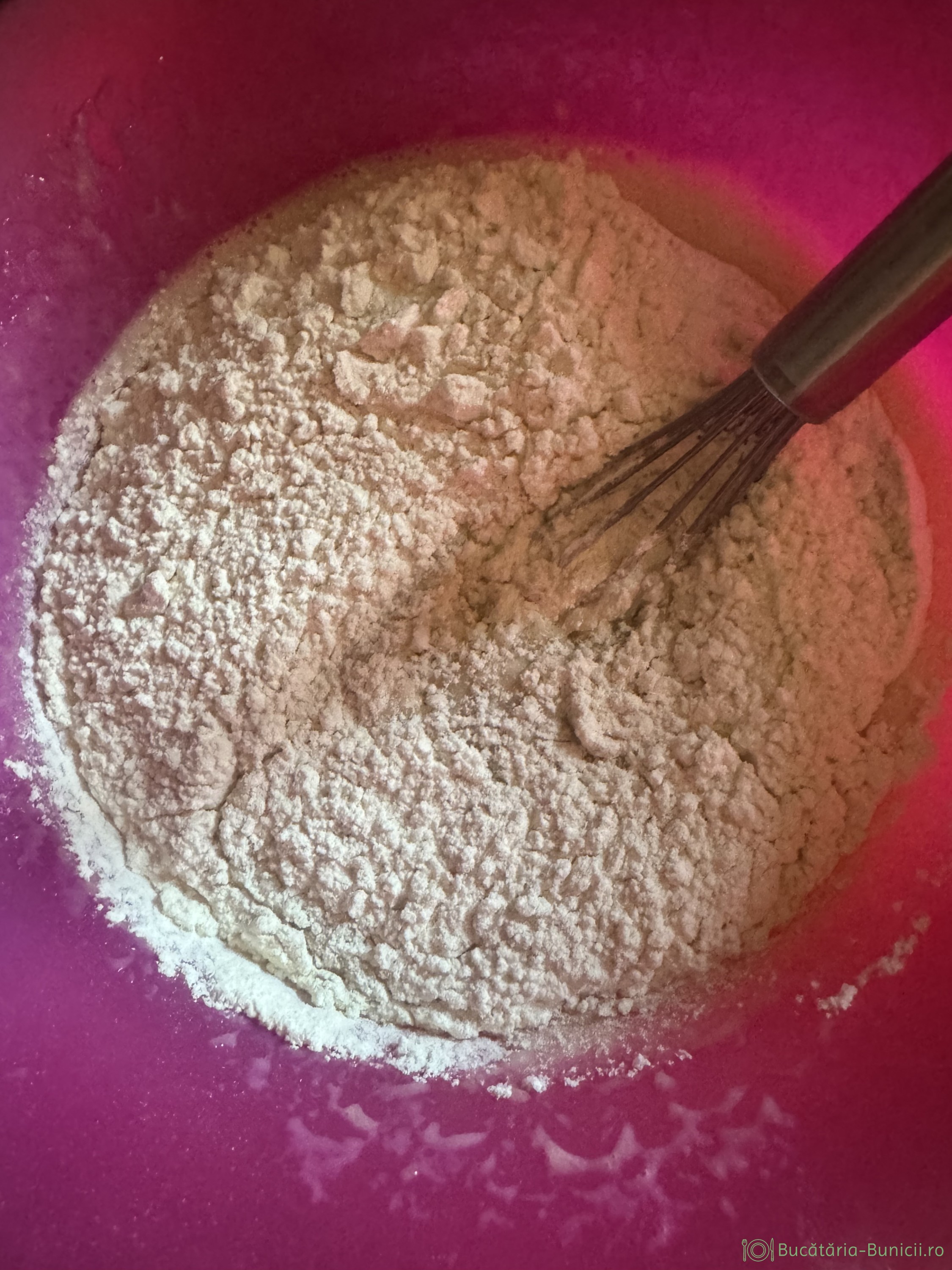 - La final se pune făina cernuta cu bicarbonatul de sodiu, amestecând cu telul.
