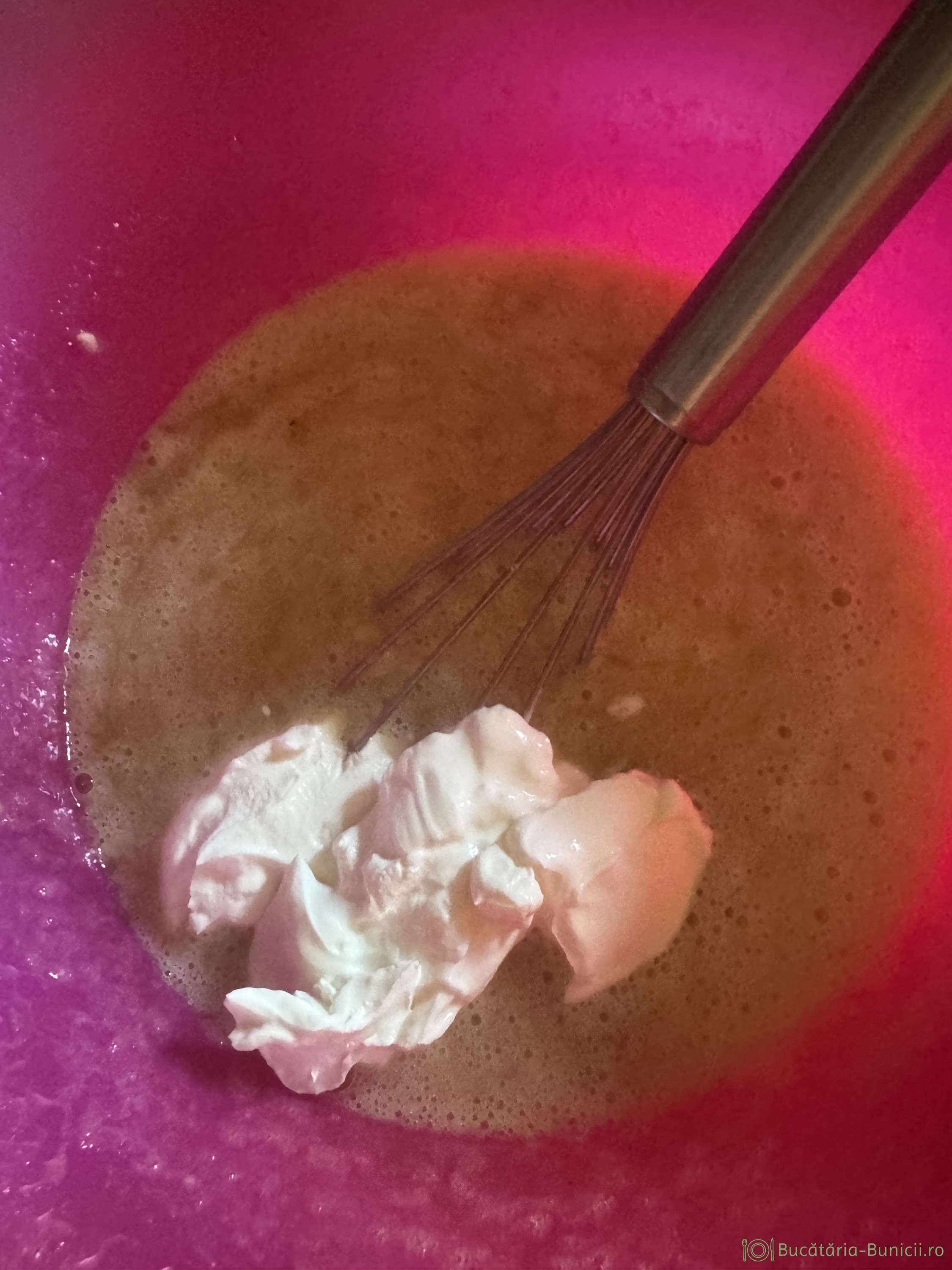 - Pe rând se încorporează ouăle, uleiul și iaurtul grecesc, amestecând după fiecare ingredient, până se încorporează în compoziție.