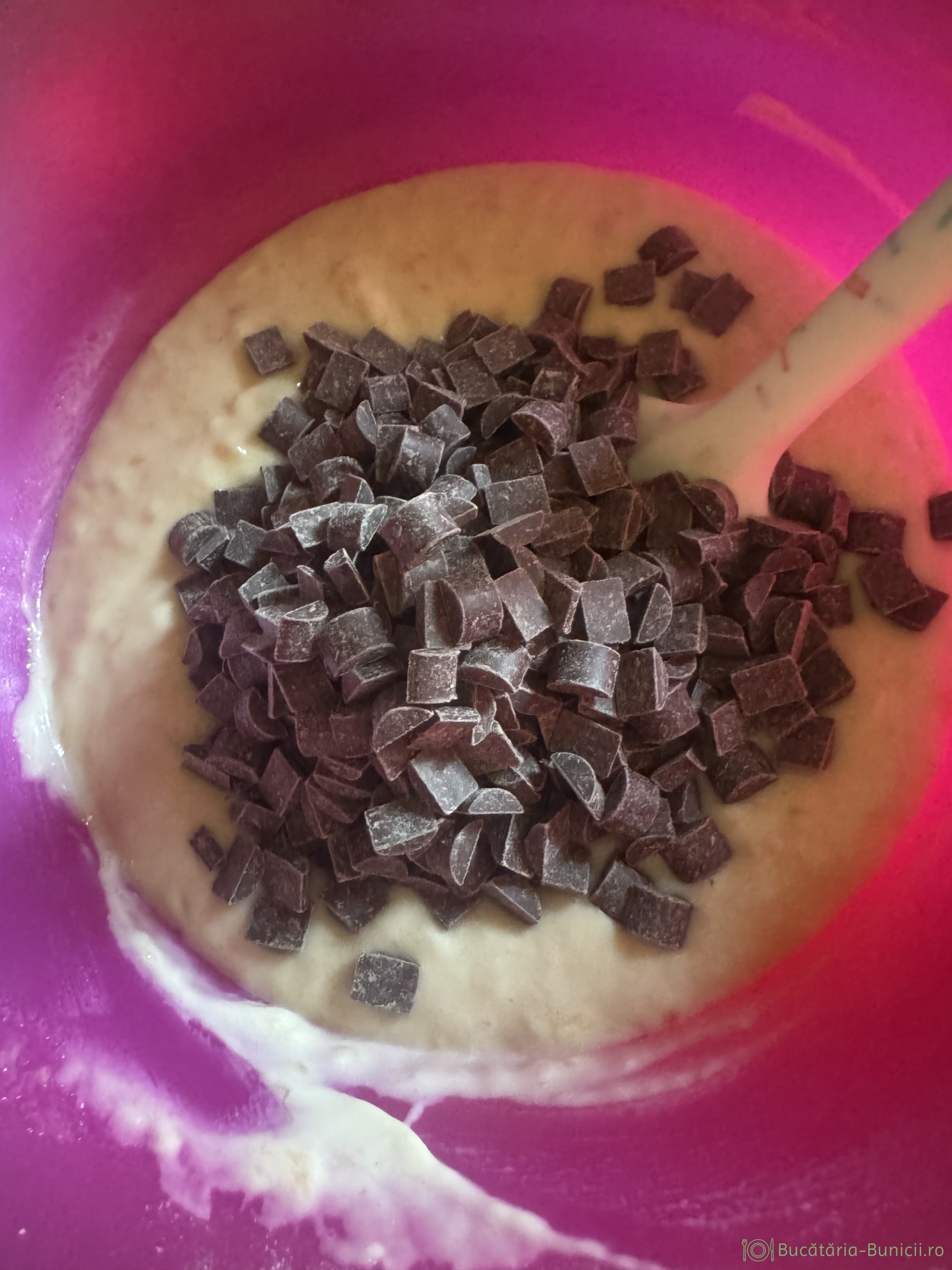 - Cu spatula încorporăm aproape toate chipsurile de ciocolată și esență de vanilie.