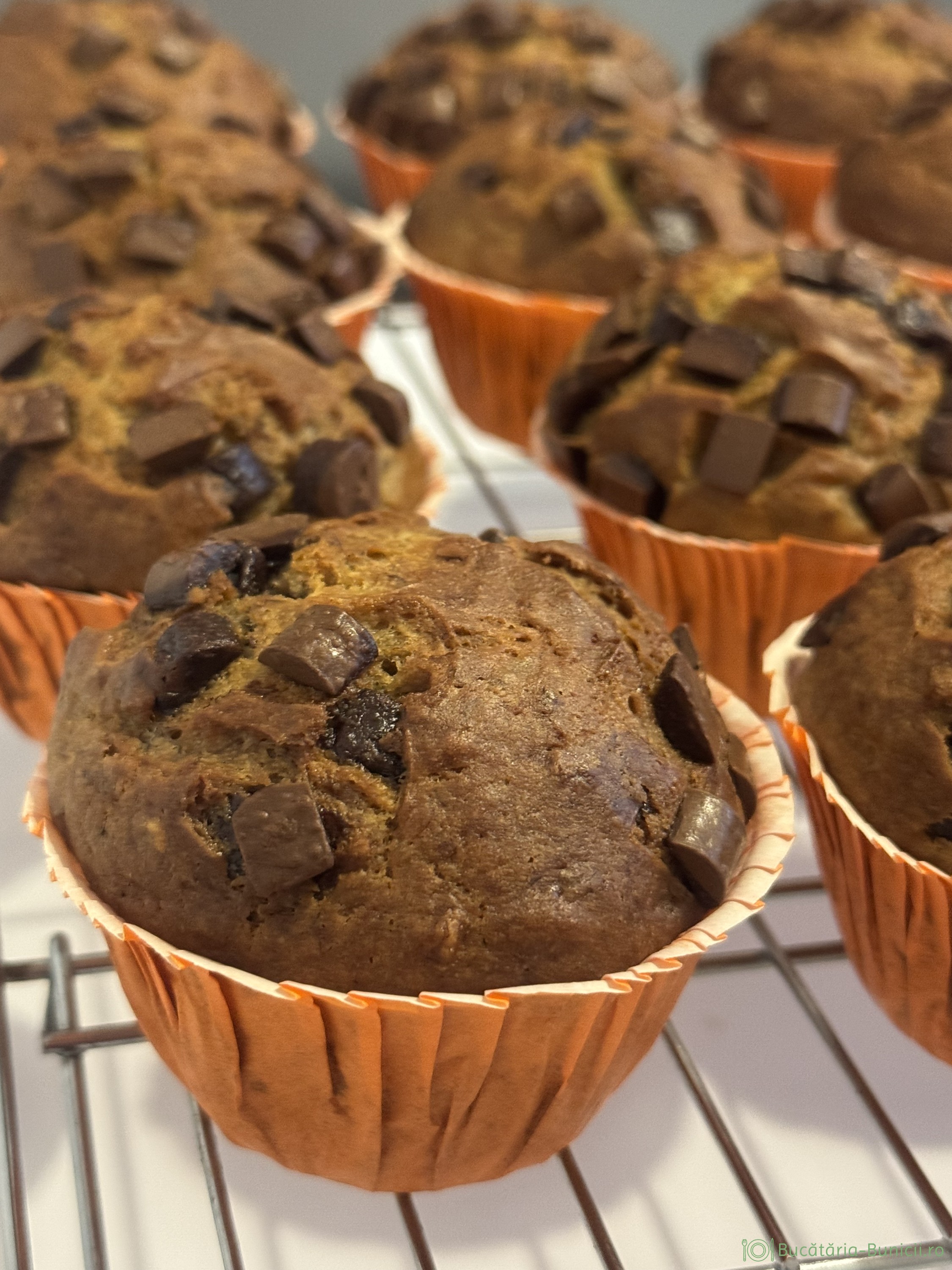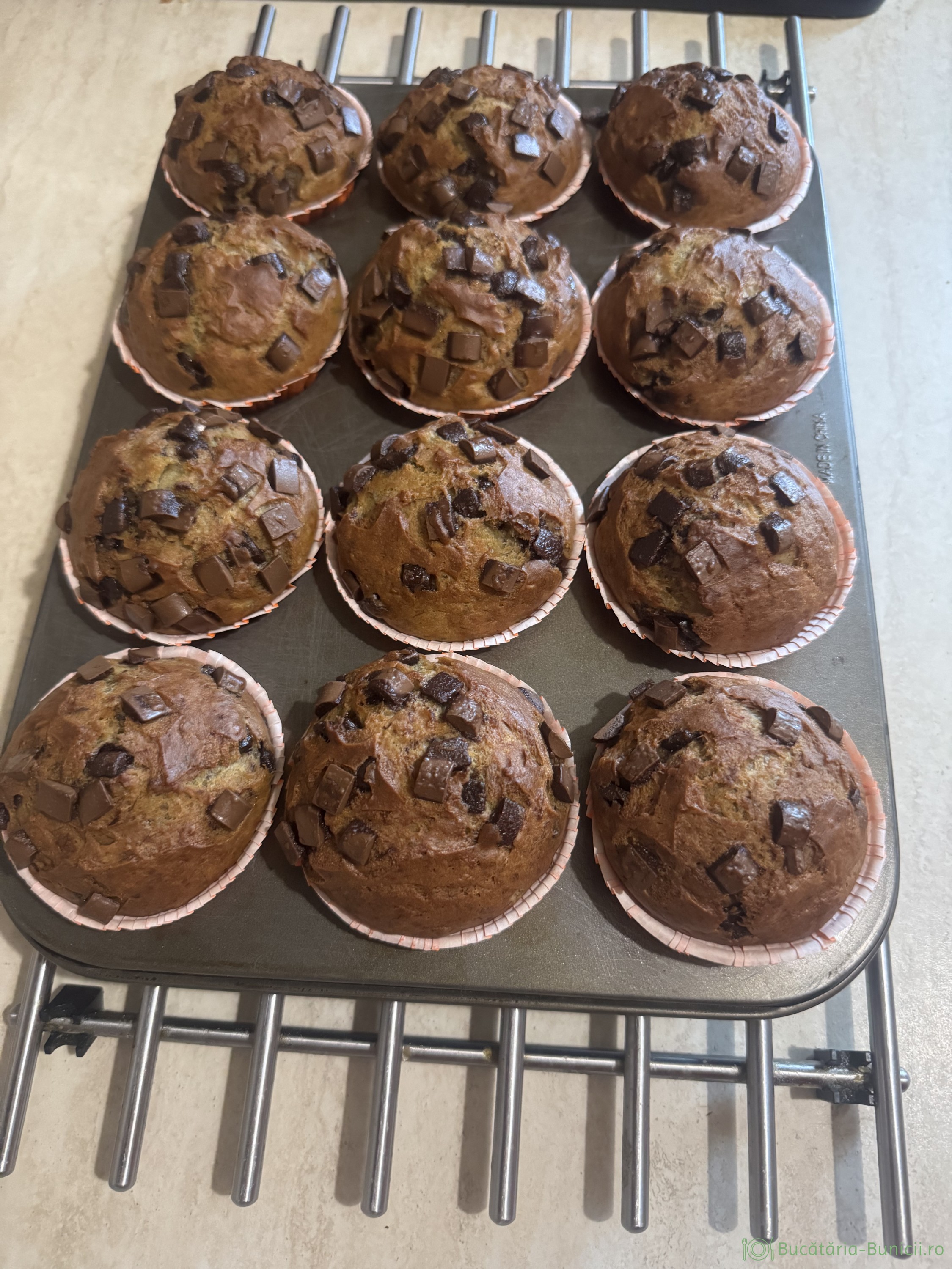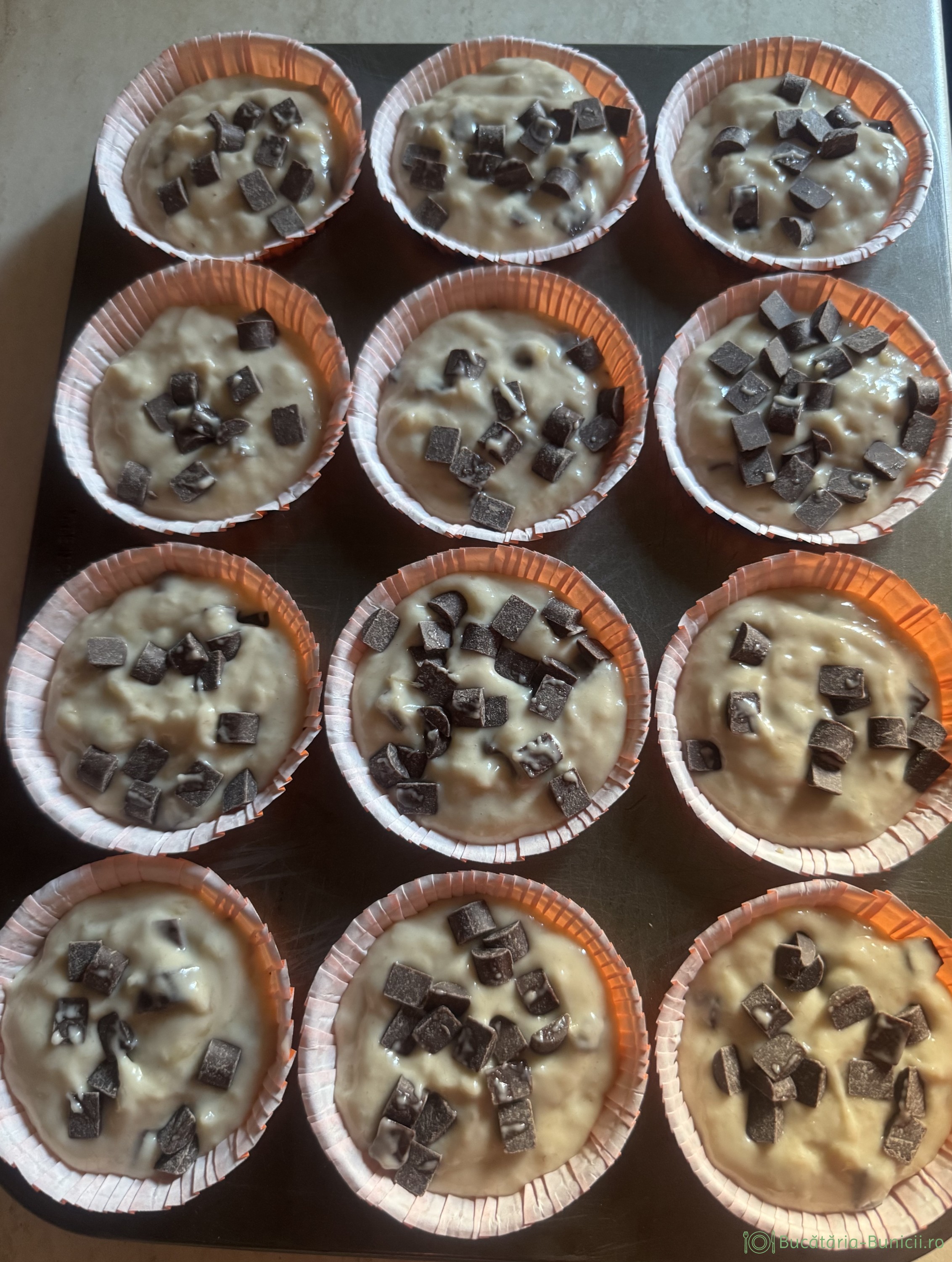 - Se împarte compoziția în cele 12 forme, să fie pline mai bine de 3/4, iar deasupra se presară chipsuri de ciocolată.