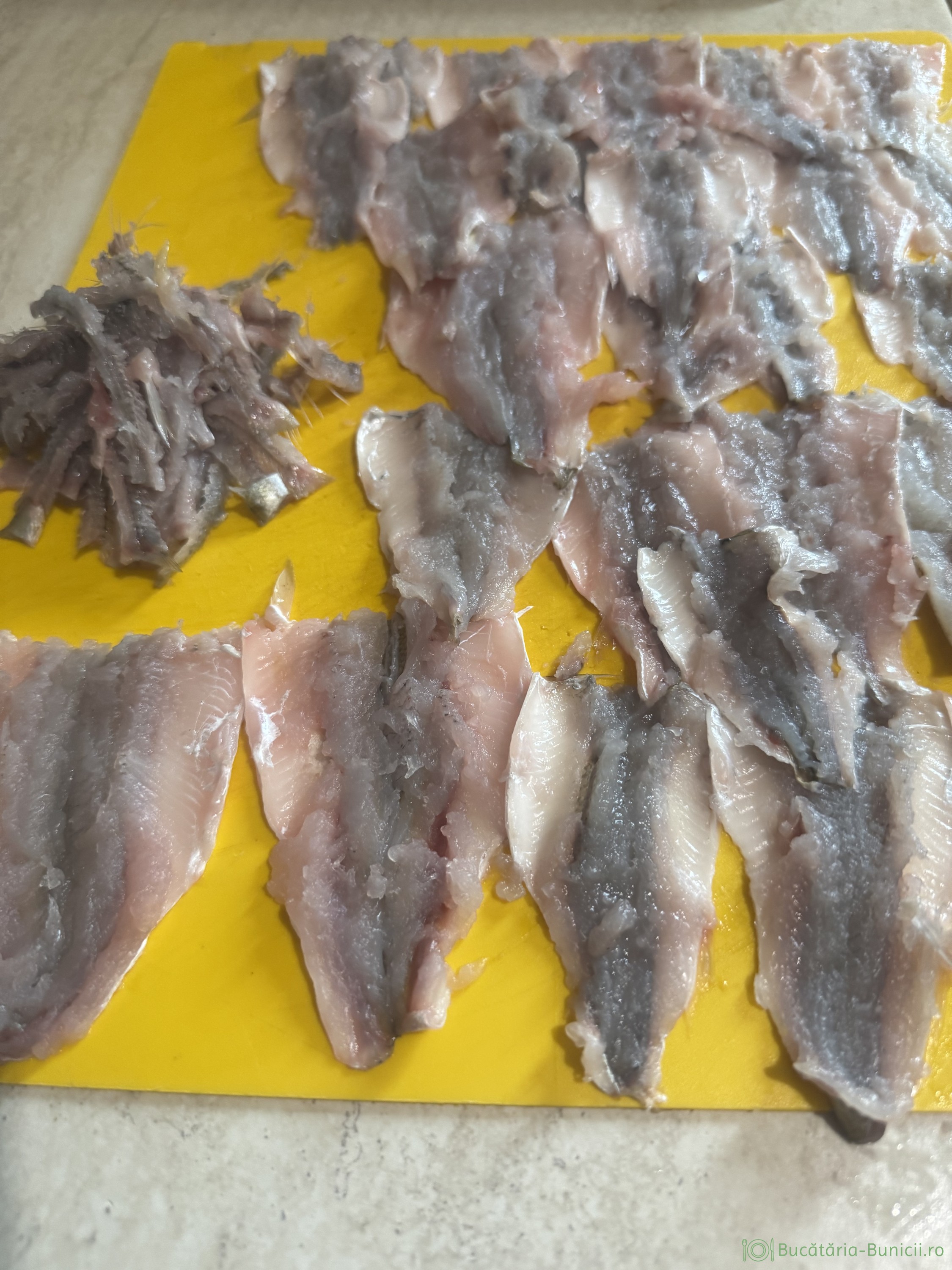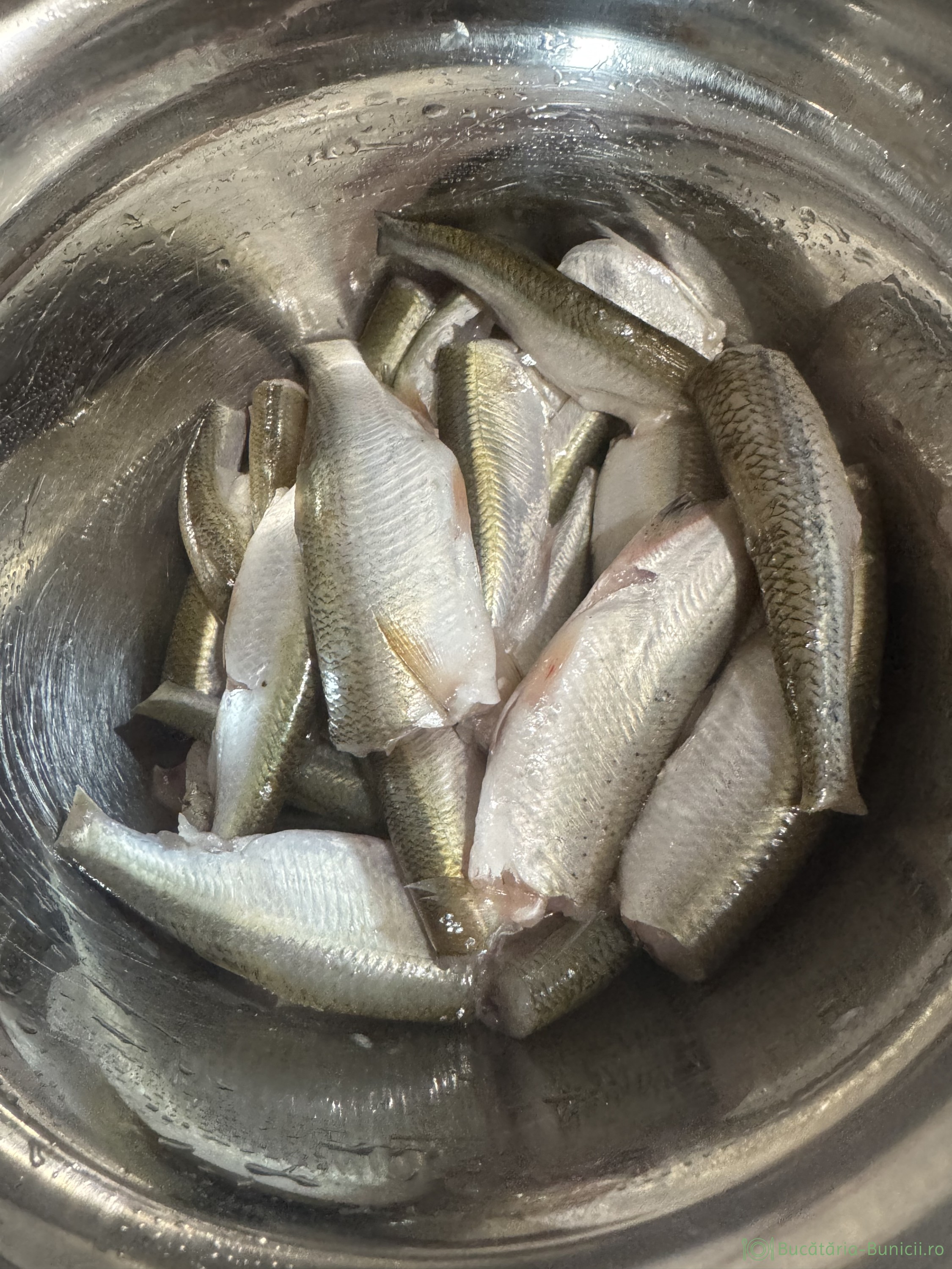 - Pentru început se curăță peștii de solzi, se îndepărtează capul, intestinele, coada și eventual aripioarele, dacă sunt mai mari. Se spală bine și se șterg de excesul de apă.