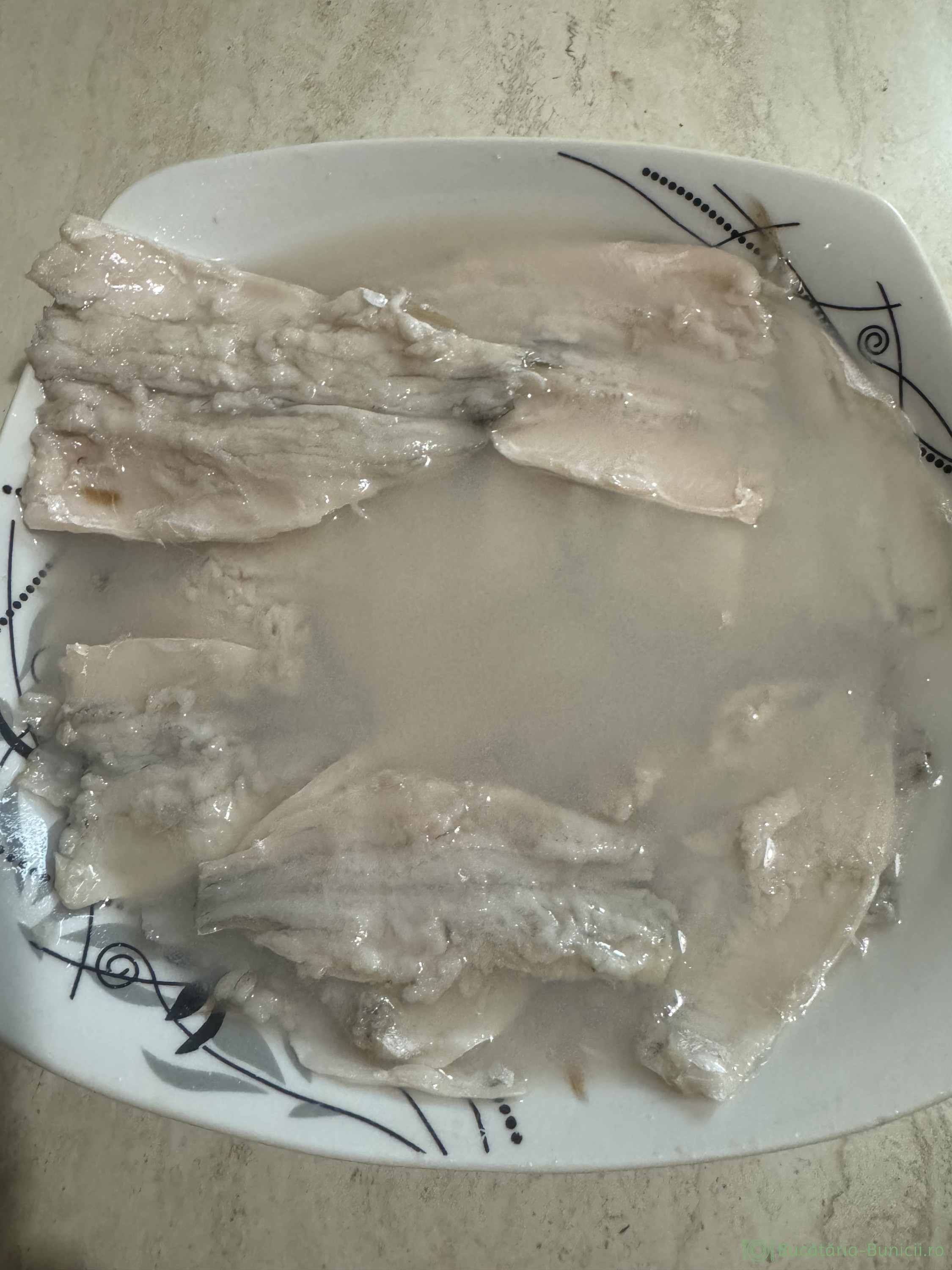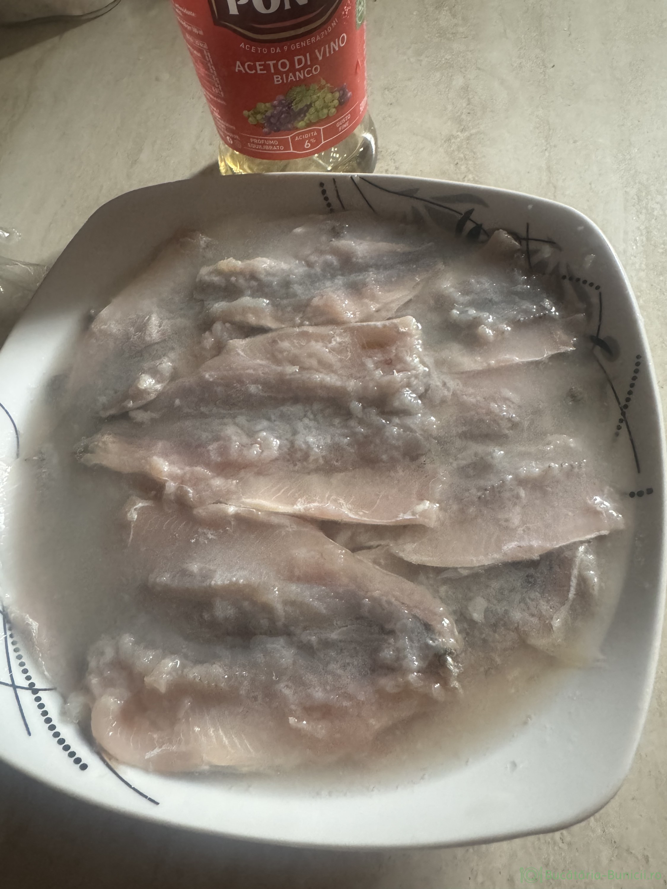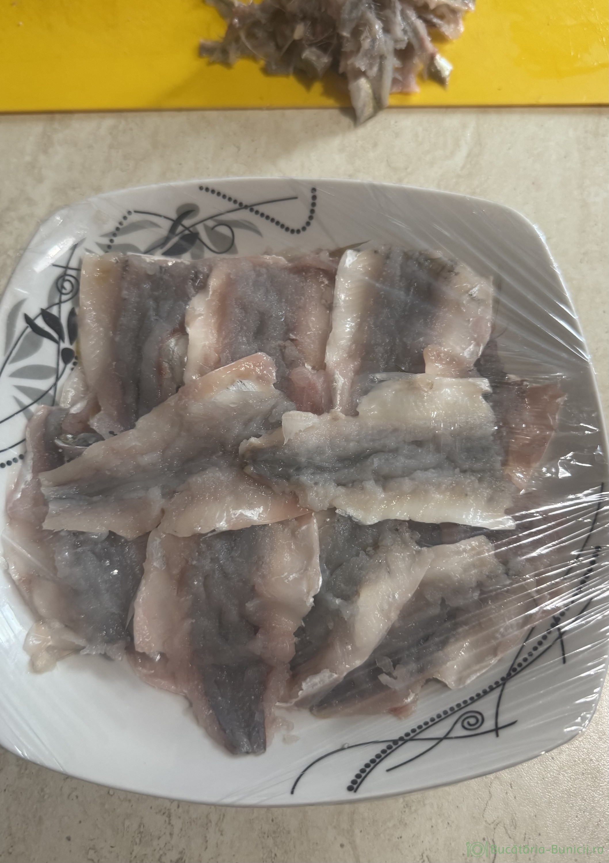 - A doua zi peștele se scurge de oțet și se spală foarte bine cu apă rece, apoi se șterg de surplusul de apă, folosind prosoape de hârtie.