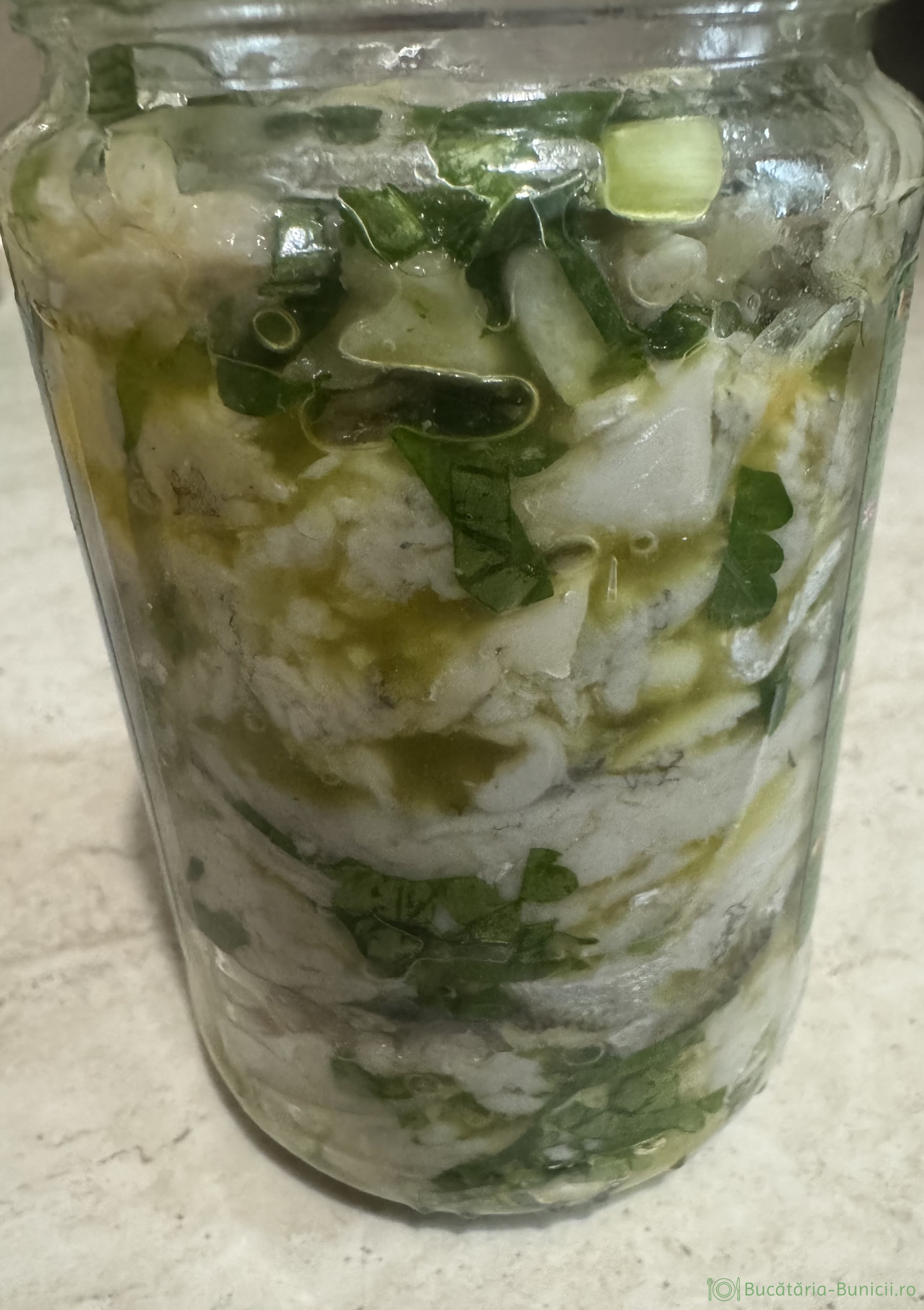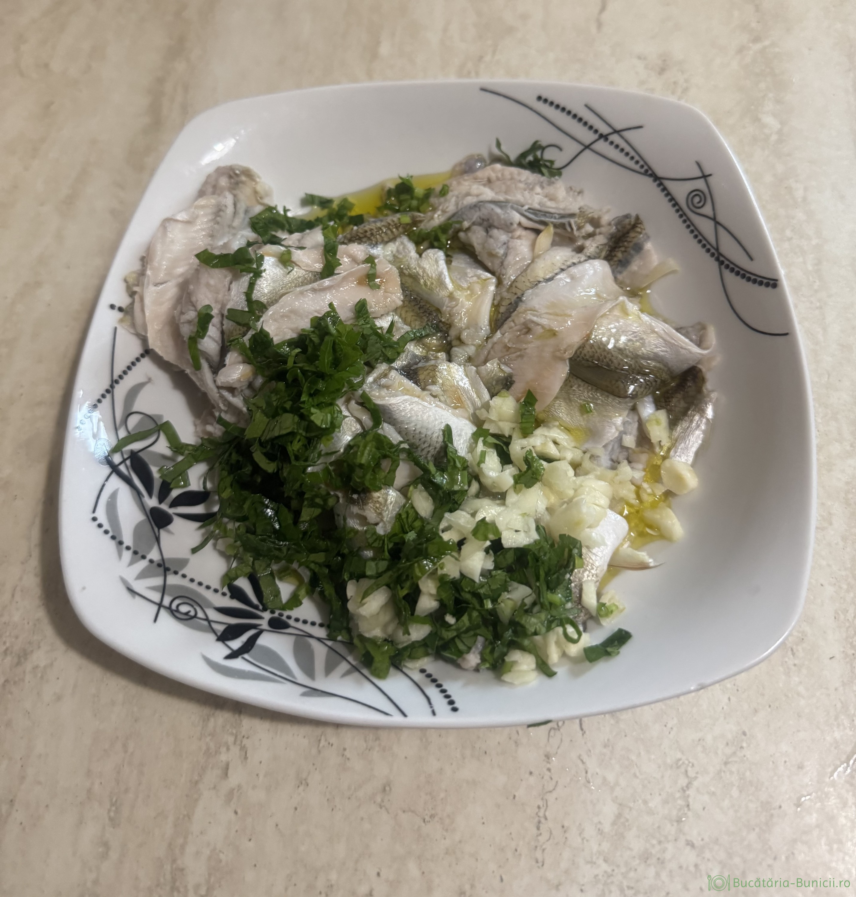 - Se pune peștele într-o farfurie adâncă, se adauga usturoiul și pătrunjelul tocat mărunt, uleiul de măsline și se amestecă bine, apoi se așază în borcan de sticlă, presând bine, să nu fie goluri prin borcan.