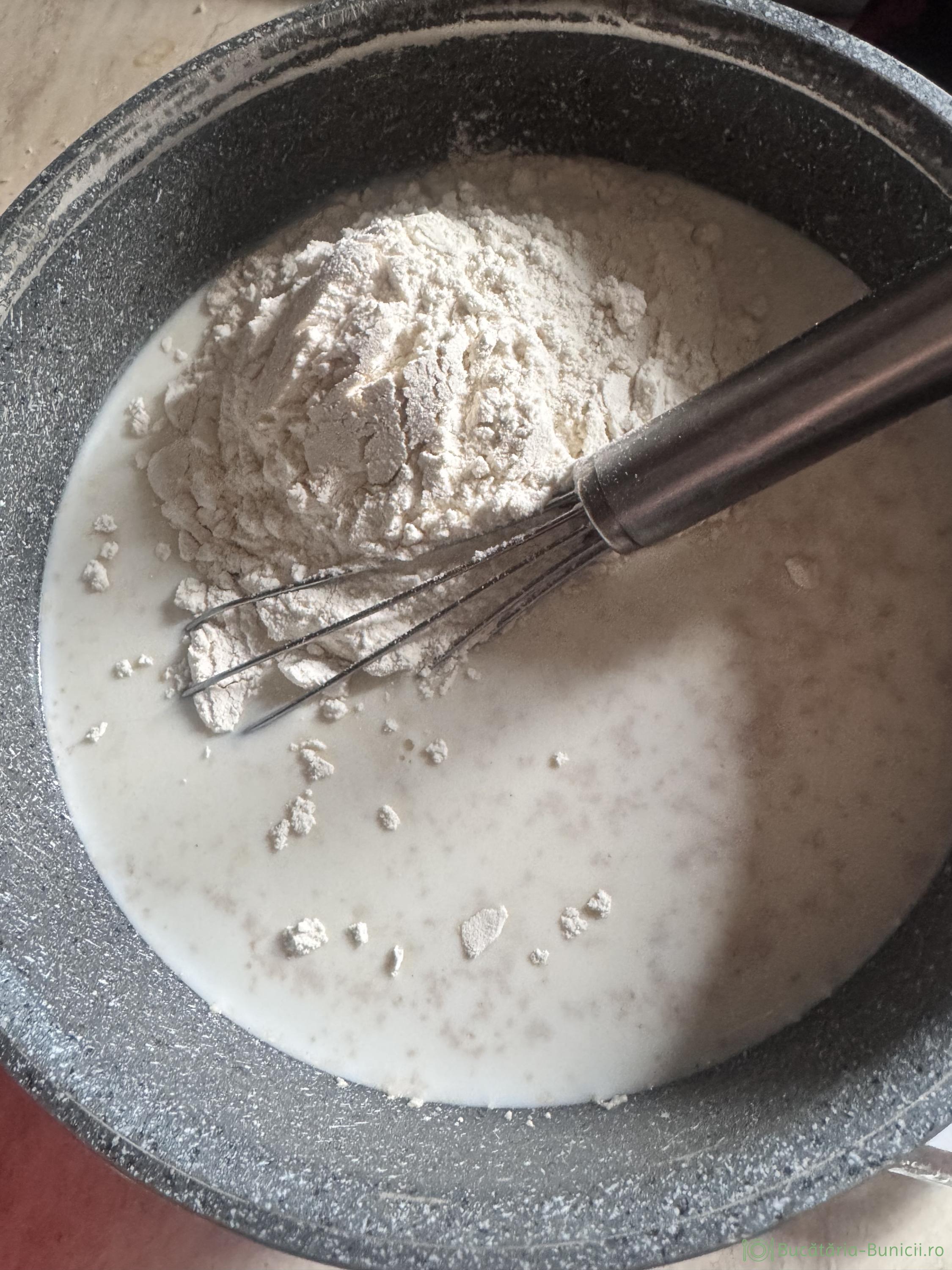 - Într-un bol se pune laptele călduț și drojdia. Dacă folosim zahăr, adăugăm în lapte o linguriță zahăr. Eu am renunțat demult, la zahăr pus în aluatul de paine. Chiar dacă are rolul lui, am observat ca, aluatul dospește frumos și fără zahăr adăugat. Se omogenizează, apoi se încorporează 2-3 linguri de făină (din totalul de 420 grame), se amestecă cu telul și se lasă 20-30 minute, să dospească.