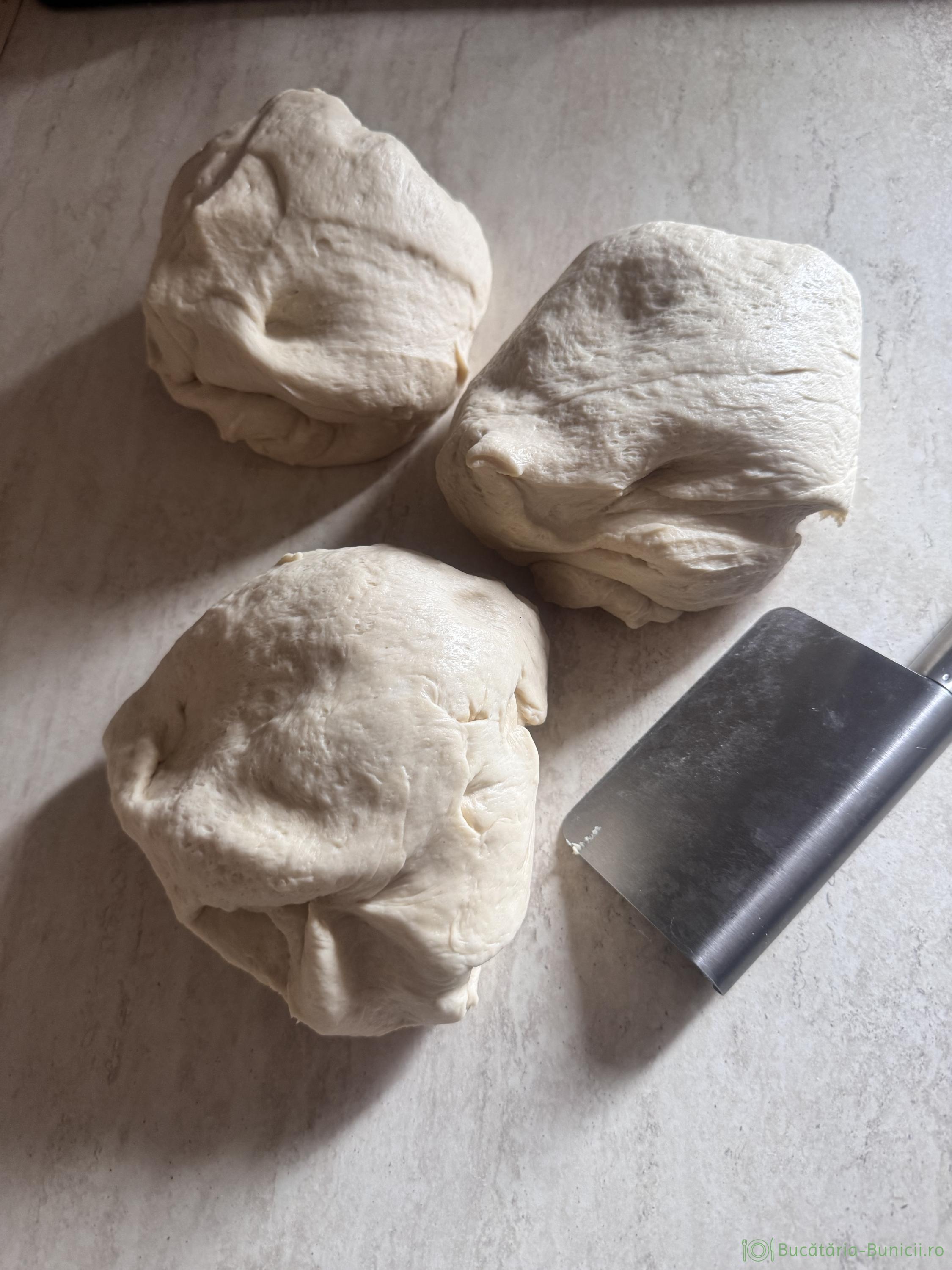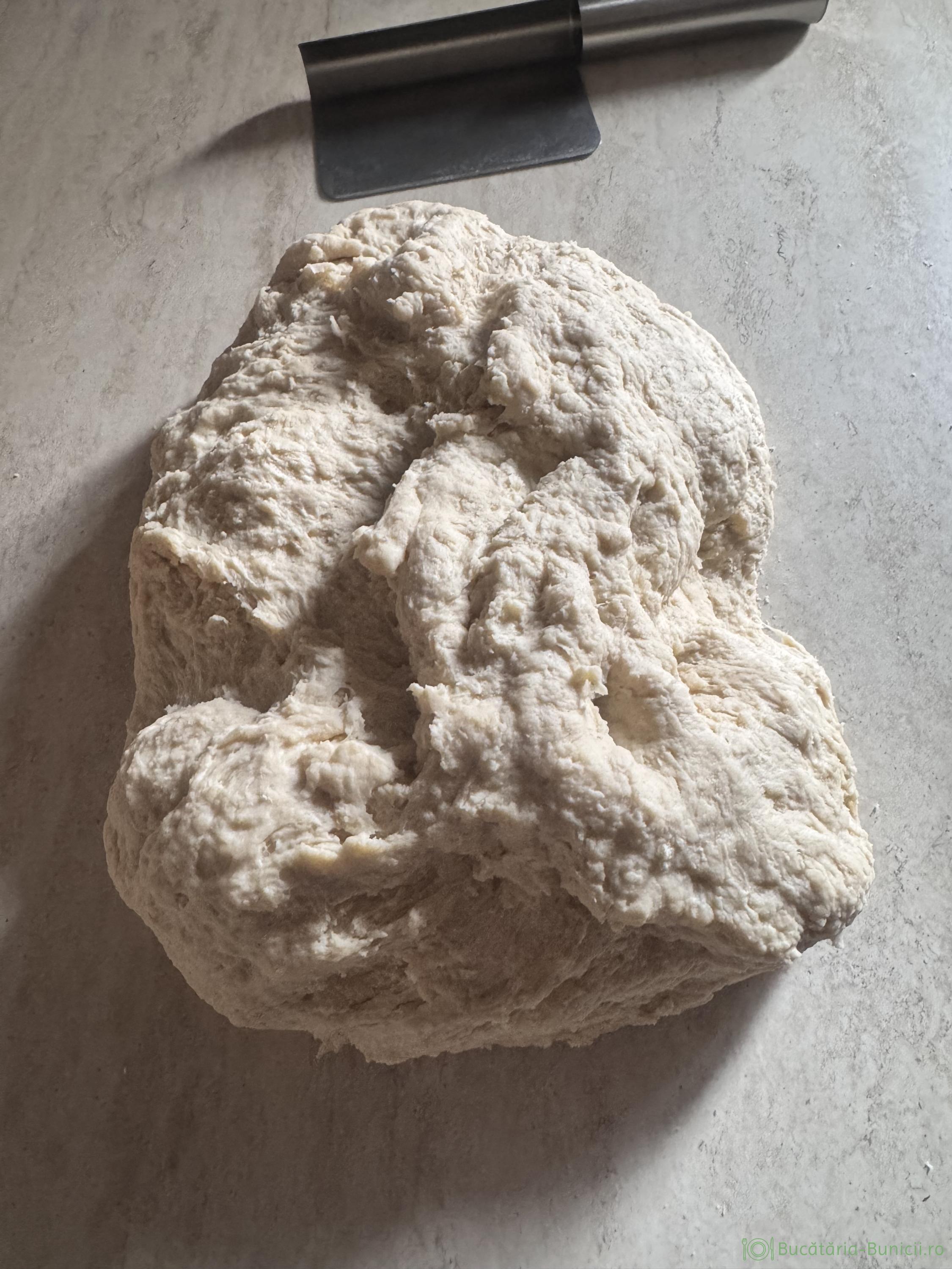 - Într-un bol mai mare se pune restul de făină, maiaua și uleiul de măsline. Se frământă, cat se formează aluatul, apoi se adaugă sarea. Se pune aluatul pe blatul de lucru și se frământă, până obținem un aluat uniform, care nu se lipește de mâini. La început, vom observa ca, aluatul este lipicios și vom avea tendința, să mai punem făină, însă nu este necesar, aluatul va deveni nelipicios, după 4-5 minute de frământat.