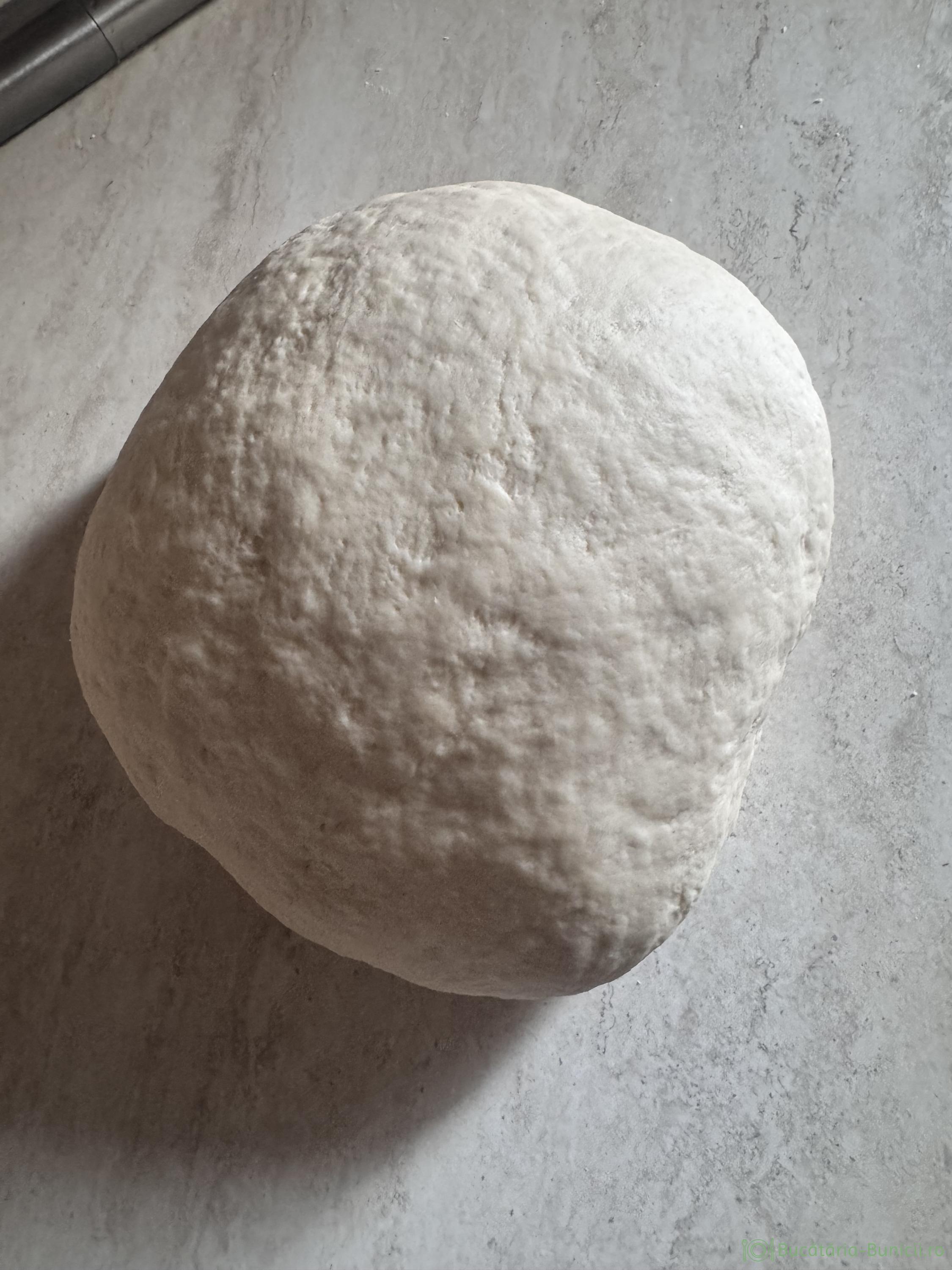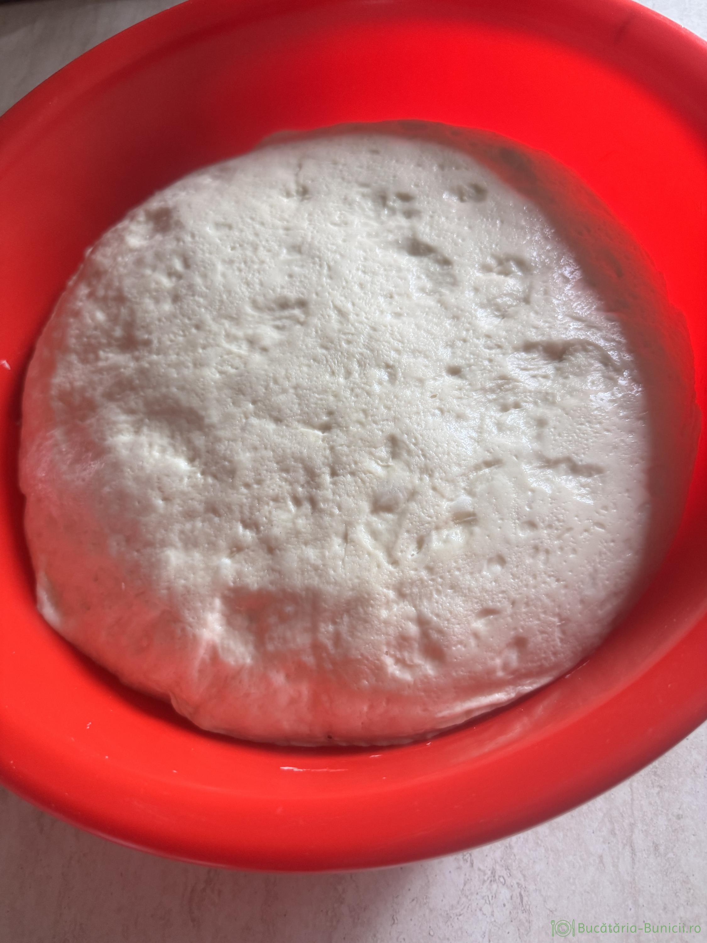 - Se acoperă aluatul cu folie alimentară, apoi cu un prosop și se lasă la dospit, până își dublează, chiar triplează volumul.