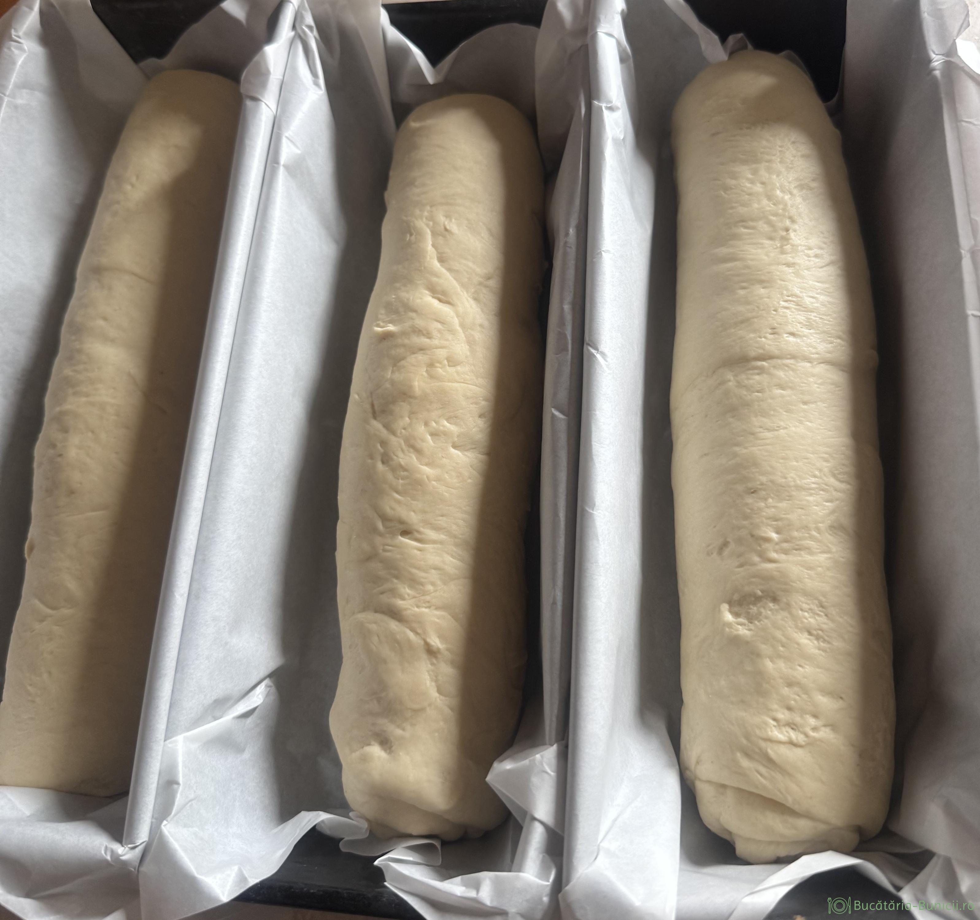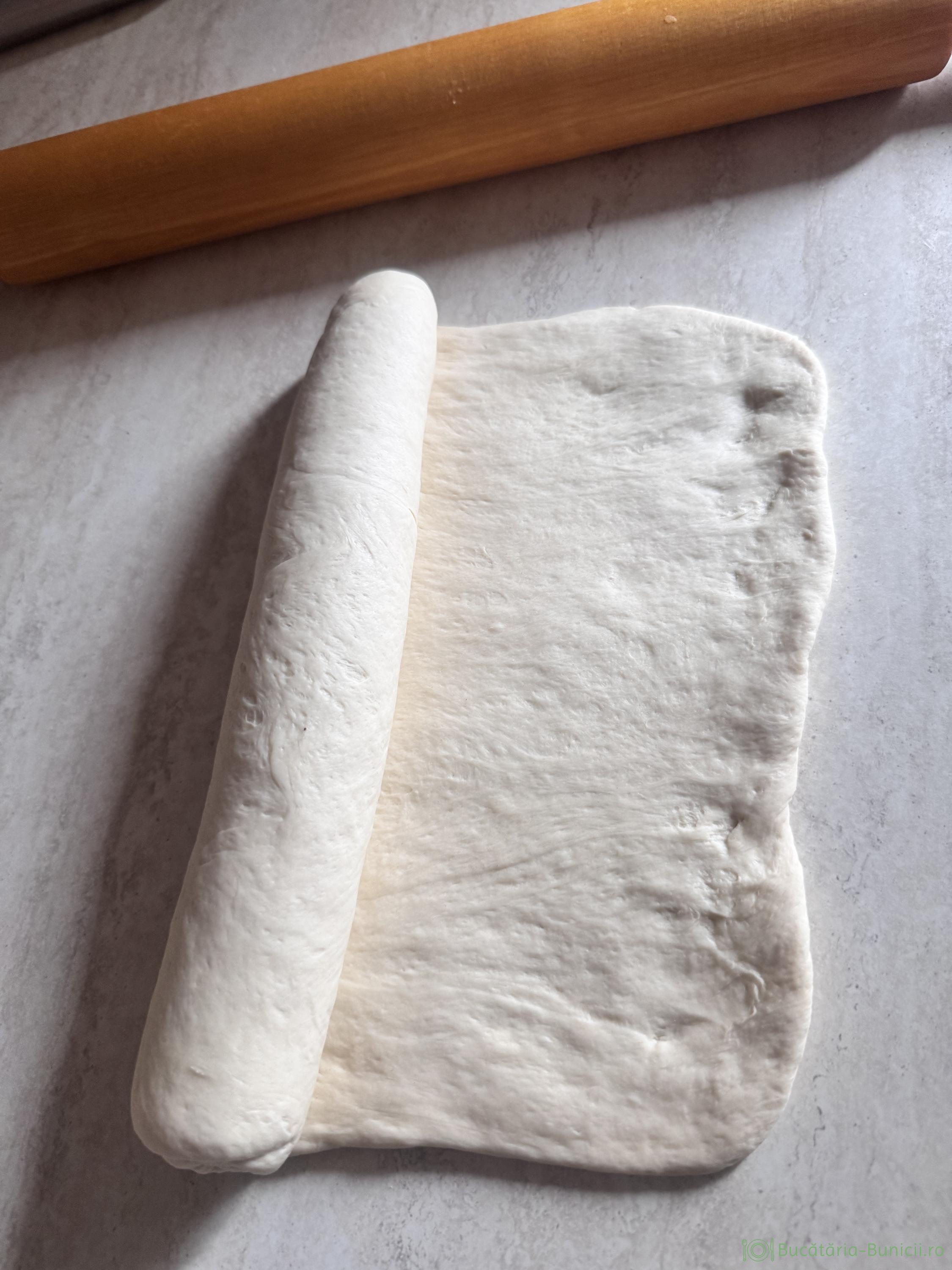 - Aluatul dospit se întinde cu sucitorul, într-o foaie de 3-4 mm grosime, apoi se rulează foarte strâns și se pune în tavă. Se acoperă cu folie și prosop și se lasă la dospit, până când aluatul umple tava.