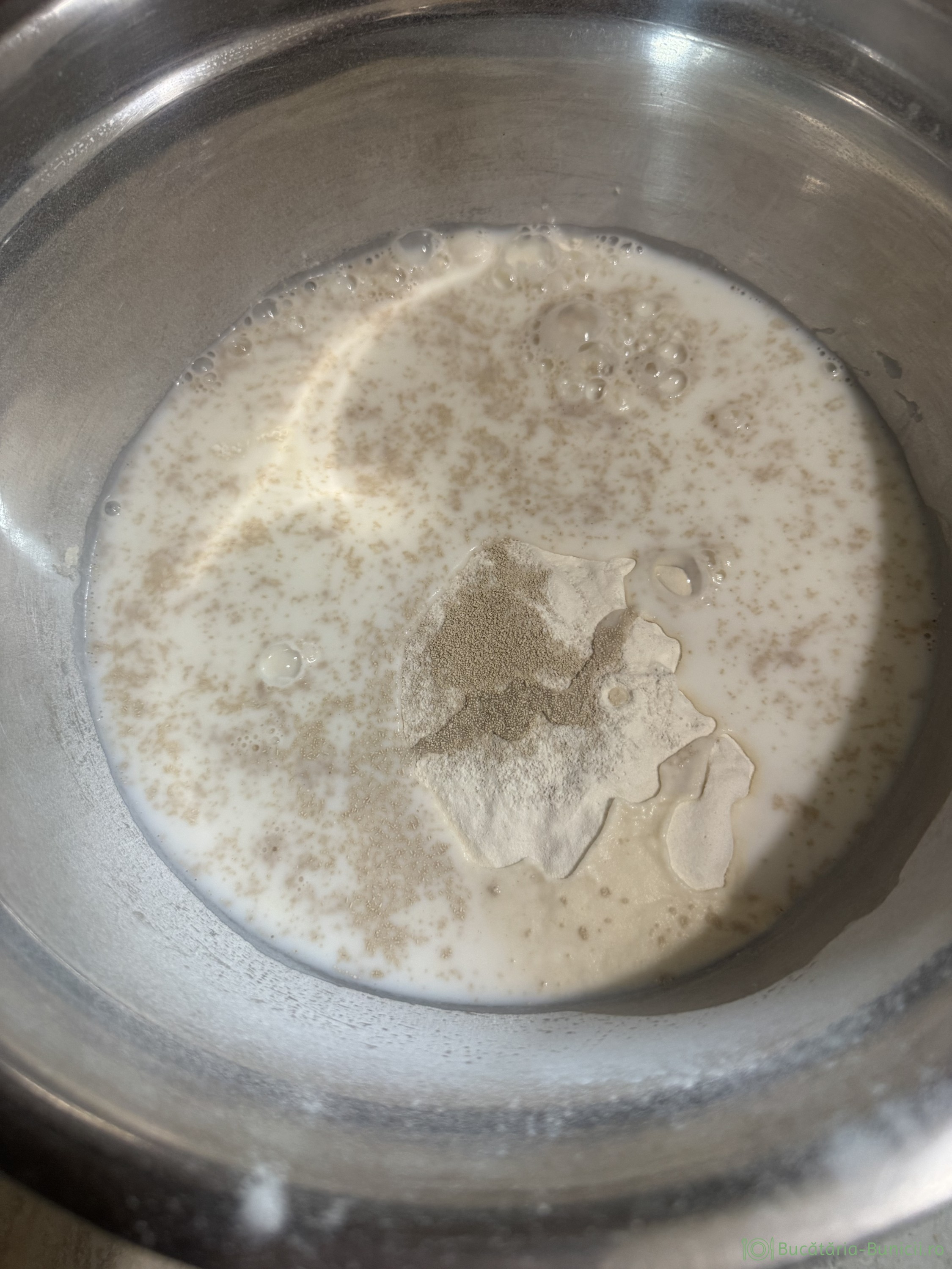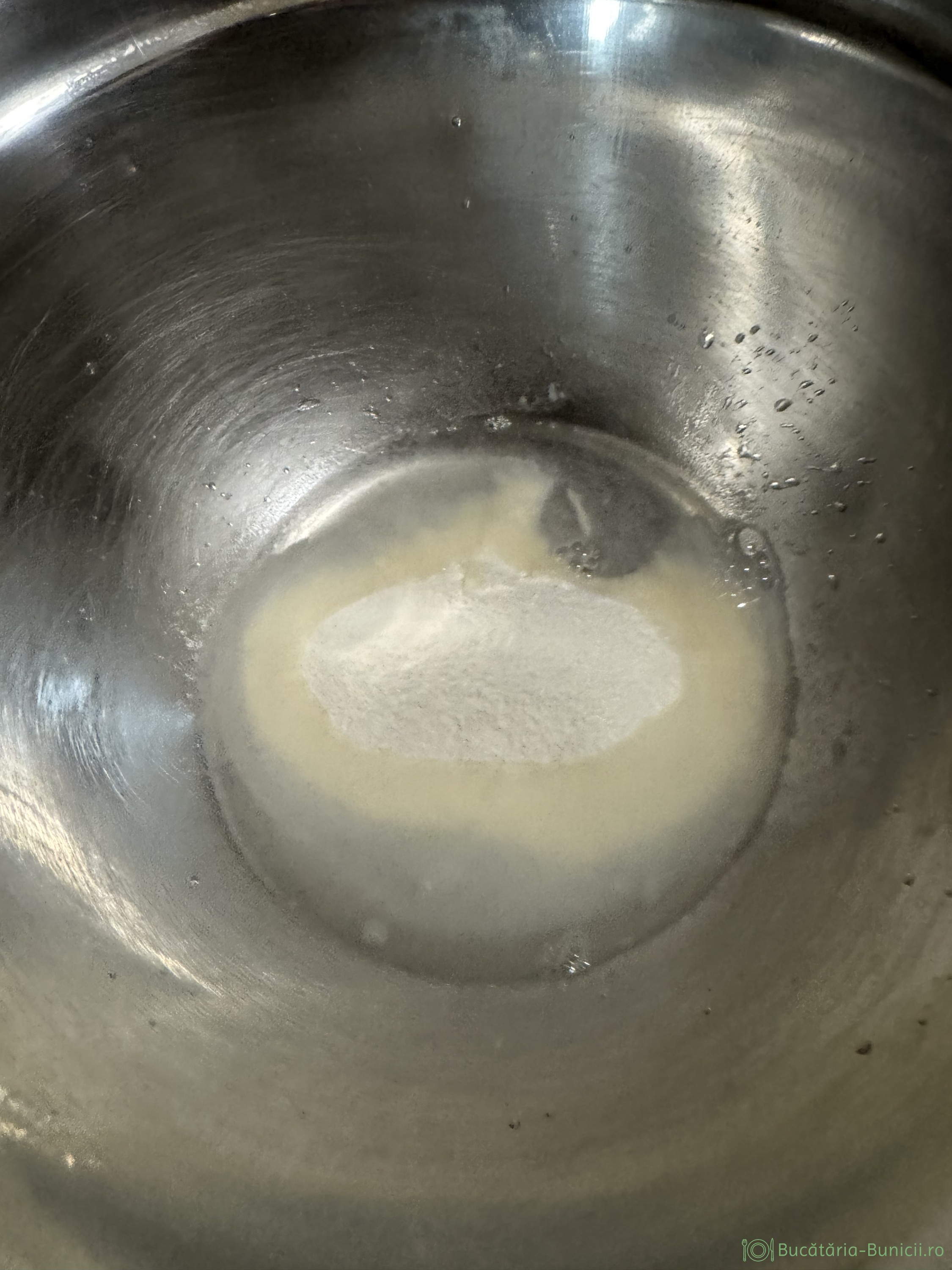 - Peste făină opărită se cerne făină, se adaugă zahărul, drojdia și laptele cu apa, ambele călduțe.