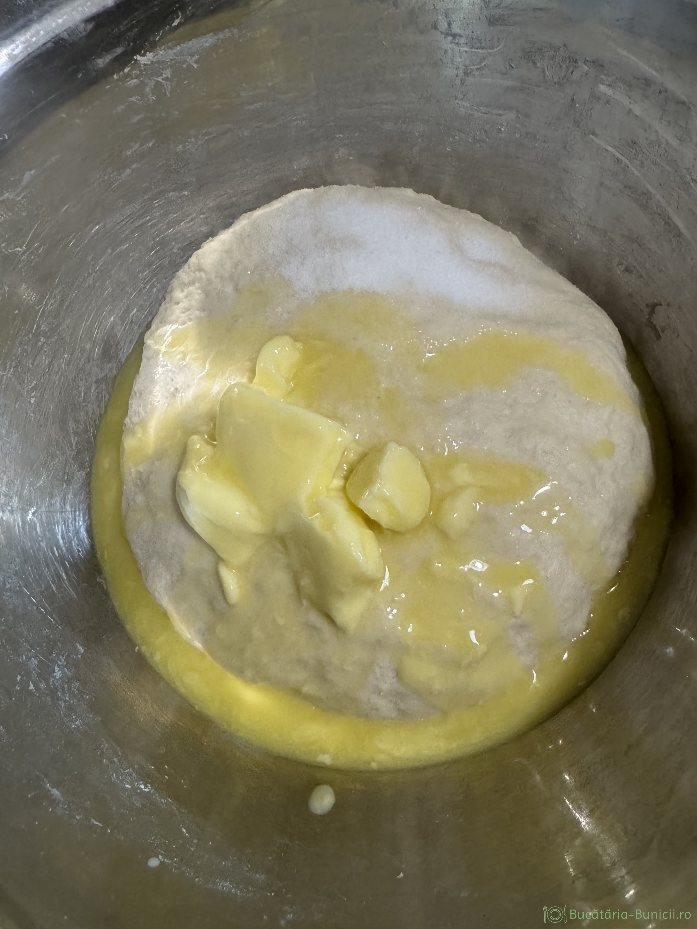 - După ce a stat la odihnă, peste aluat se pune sare și se încorporează untul topit, apoi se transferă pe blatul de lucru și se frământă, până devine neted, omogen și nelipicios.