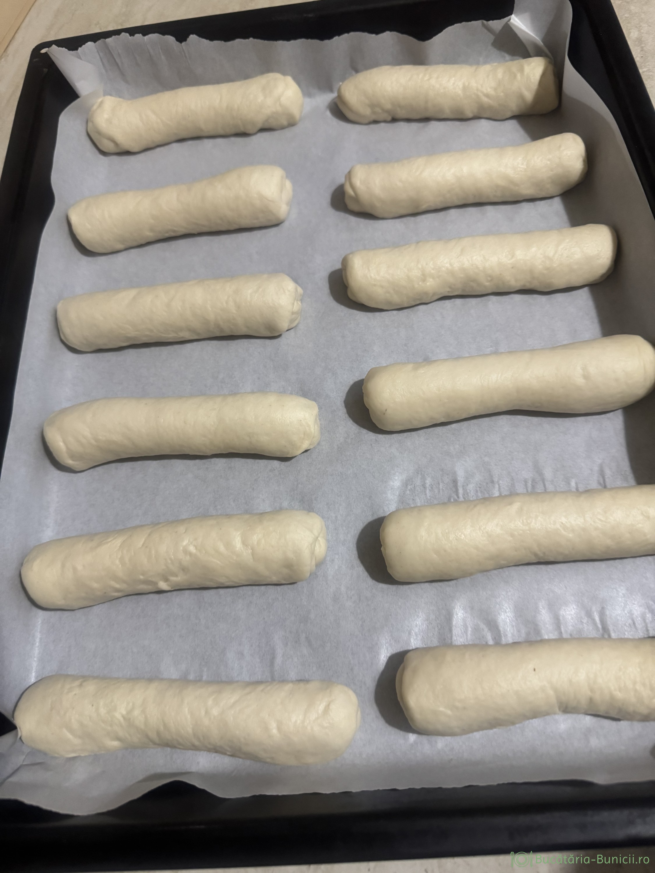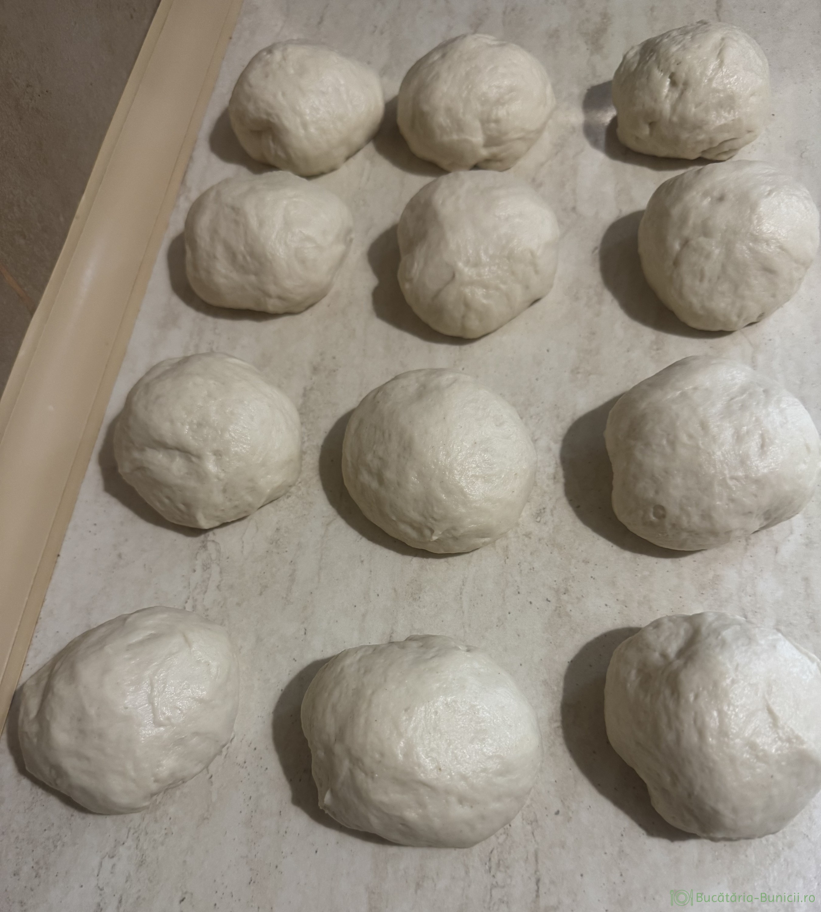 - Aluatul se împarte în 12 bucăți egale, iar fiecare se lucrează, dând forma unor bile, se acoperă și se lasă la dospit 25 minute.