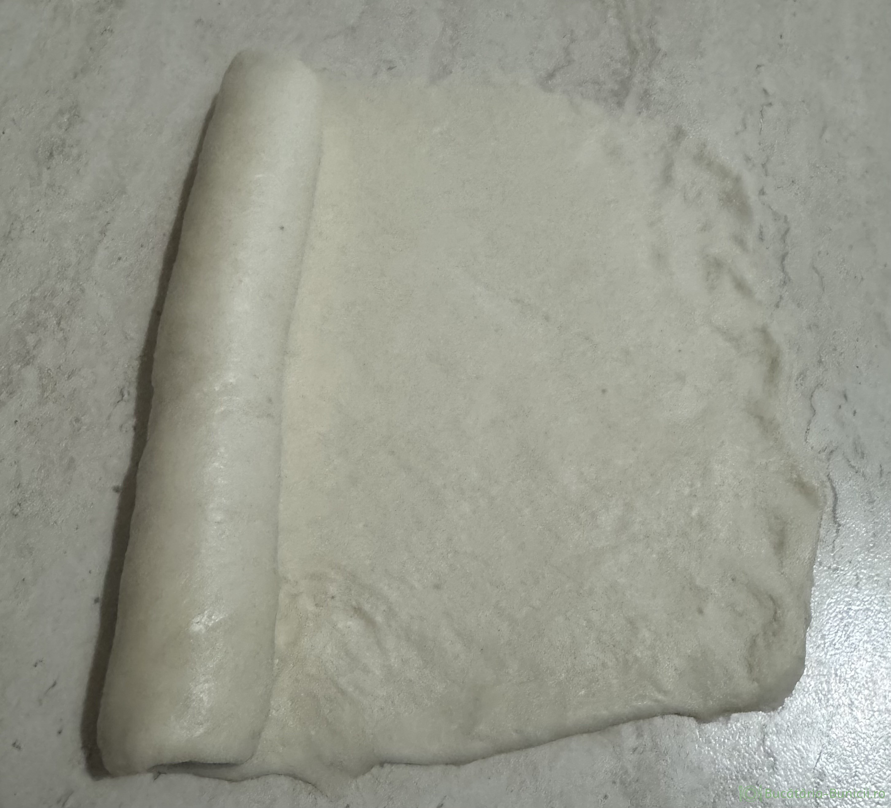 - Fiecare bilă se întinde sub forma unui dreptunghi de 13-14 cm lățime și 25-26 cm lungime. Se rulează partea mică a dreptunghiului, formând un rulou de 13-14 cm.