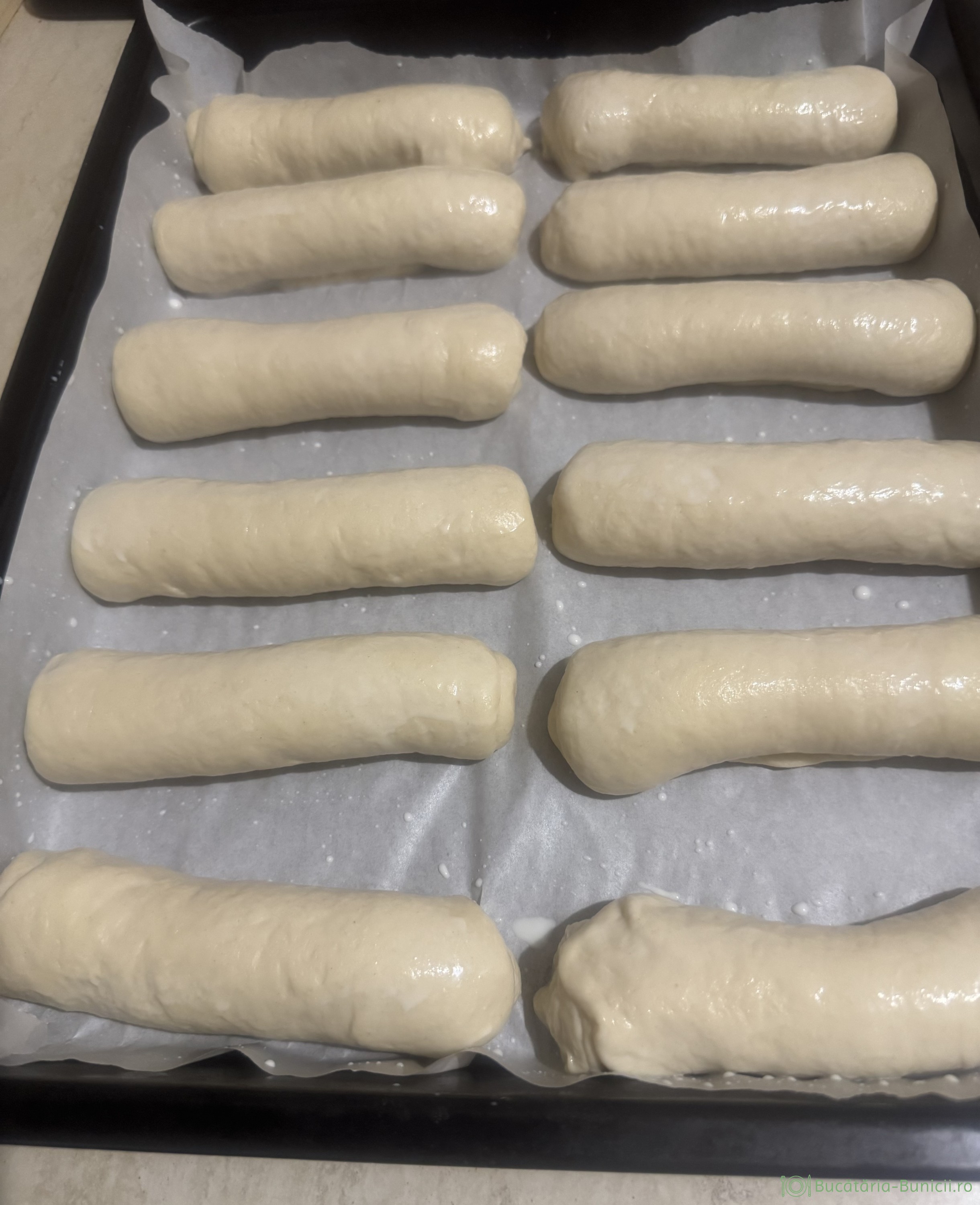 - Se așază rulourile în tavă cu hârtie de copt (eu am folosit tava mare a aragazului), se acoperă și se lasă la dospit 50 minute.