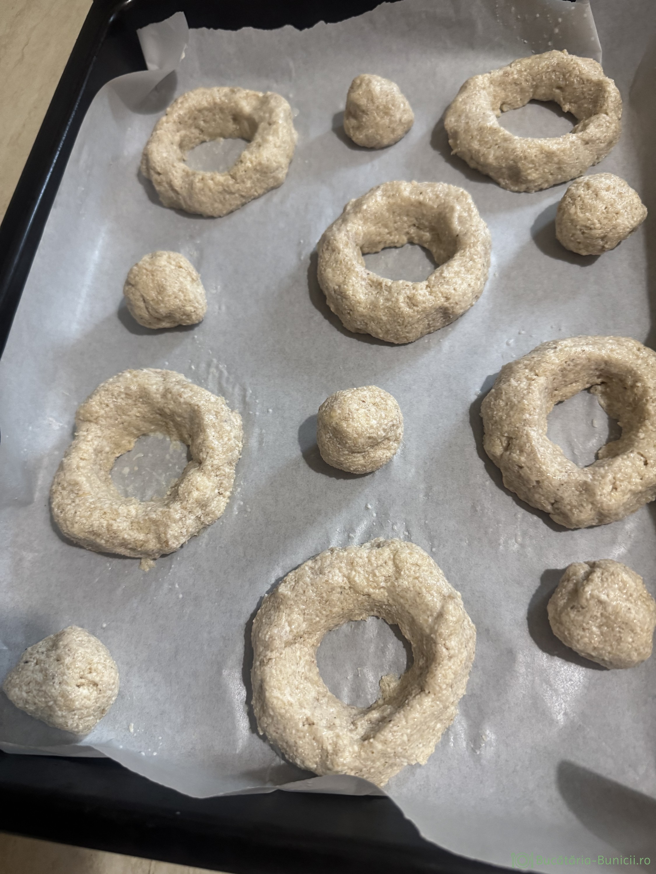 - Aluatul se împarte în șase bucăți, iar din fiecare bucată se modelează inelul și moțul papanasului, folosindu-ne de mâinile umezite cu apă. Inelul de aluat are tendința, să se rupă, dar folosind palmele umede, le vom modela direct pe hârtia de copt (vezi galeria foto).
