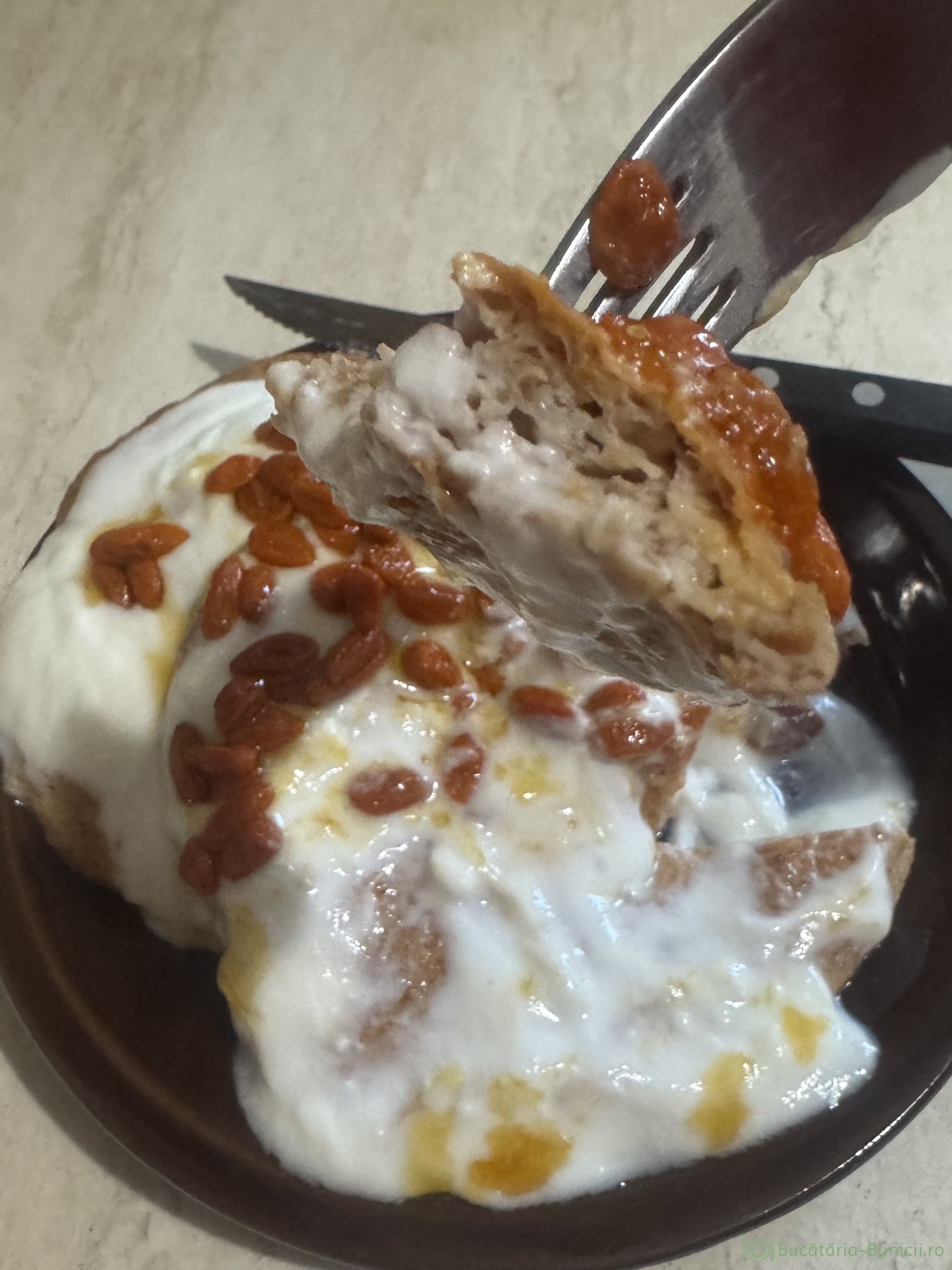 - Pentru topping folosim iaurt degresat și dulceață de goji. Aceasta se face fără îndulcitor, doar cat se consumă în 2-3 zile, punând fructele goji uscate la fiert cu apă, cat să le cuprindă și se fierbe 5-6 minute, până se umflă fructele, apoi se acoperă vasul cu prosop și se lasă așa, până se răcește complet.