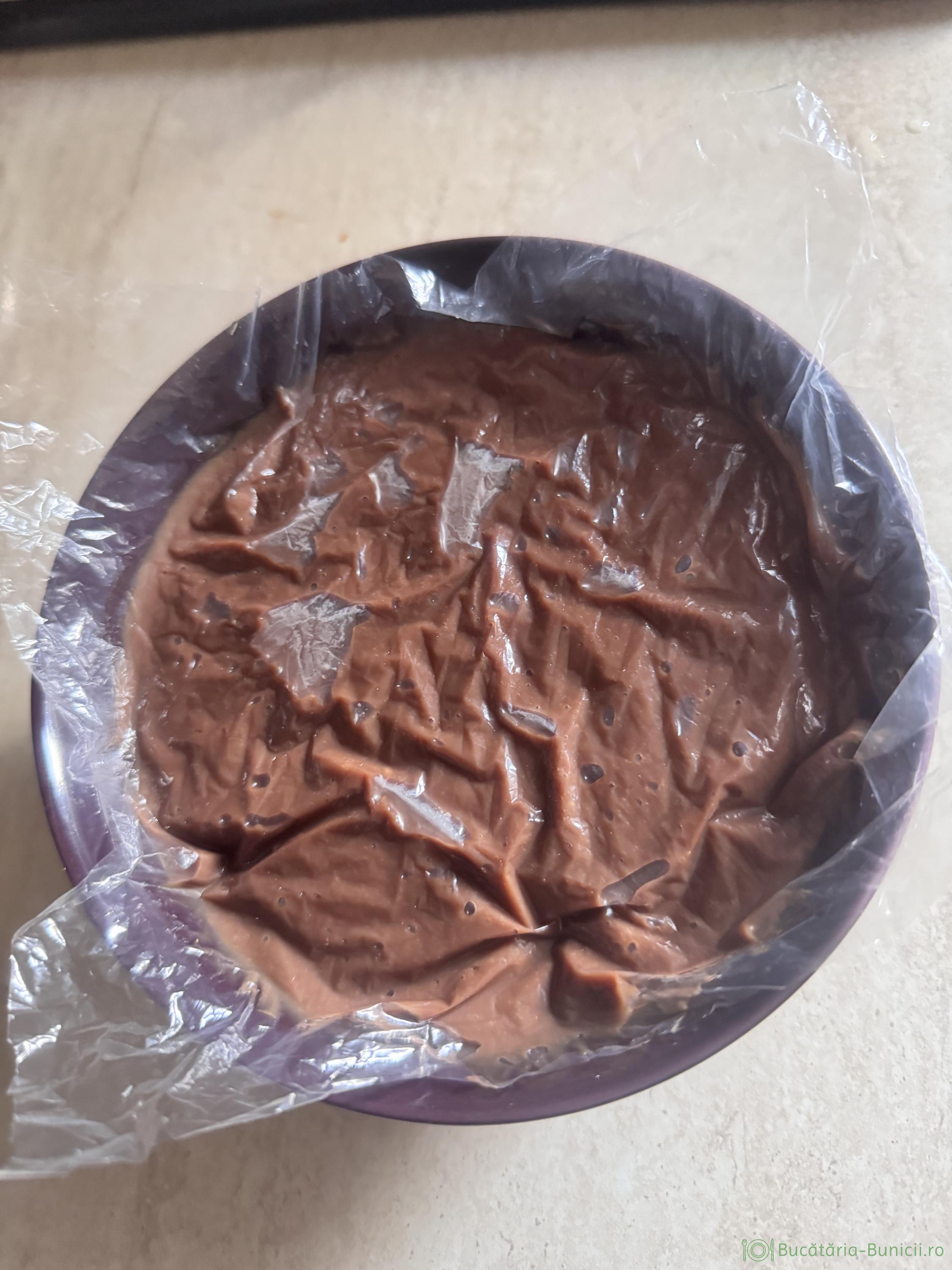 - Pregătim un ganas de ciocolată și anume: peste ciocolata ruptă bucăți se toarnă smântâna înfierbântată până la punctul de fierbere. Se lasă 4-5 minute, timp în care ciocolata se înmoaie de smântâna fierbinte, apoi se amestecă energic, până obținem un sos gros si uniform. Se acoperă cu folie alimentară, pusă direct pe sos, se lasă la temperatura camerei, să se răcească, apoi se dă la frigider câteva ore, până se întărește.
