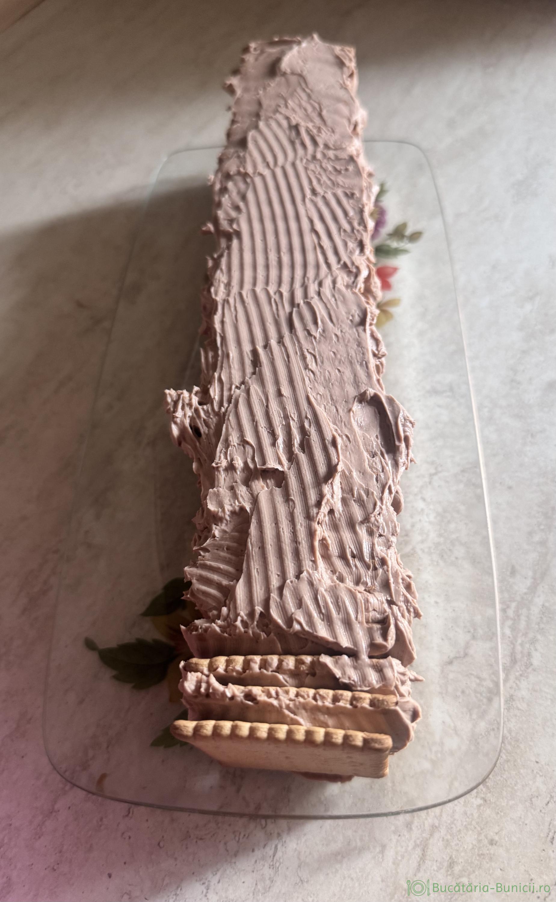 - Se lasă câteva ore într-o cameră răcoroasă, ca biscuiții să se înmoaie de la cremă, apoi se dă la frigider.