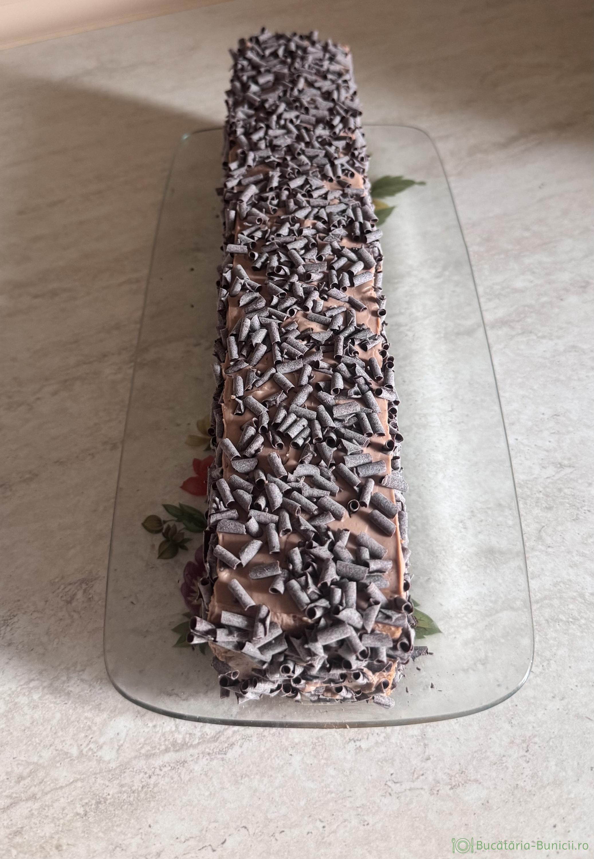 - Cu ajutorul unui cuțit se unge generos fiecare biscuite cu cremă, apoi se lipesc între ei, așezându-i în picioare. La final vom avea o prăjitură lungă, sub forma unui cub alungit.