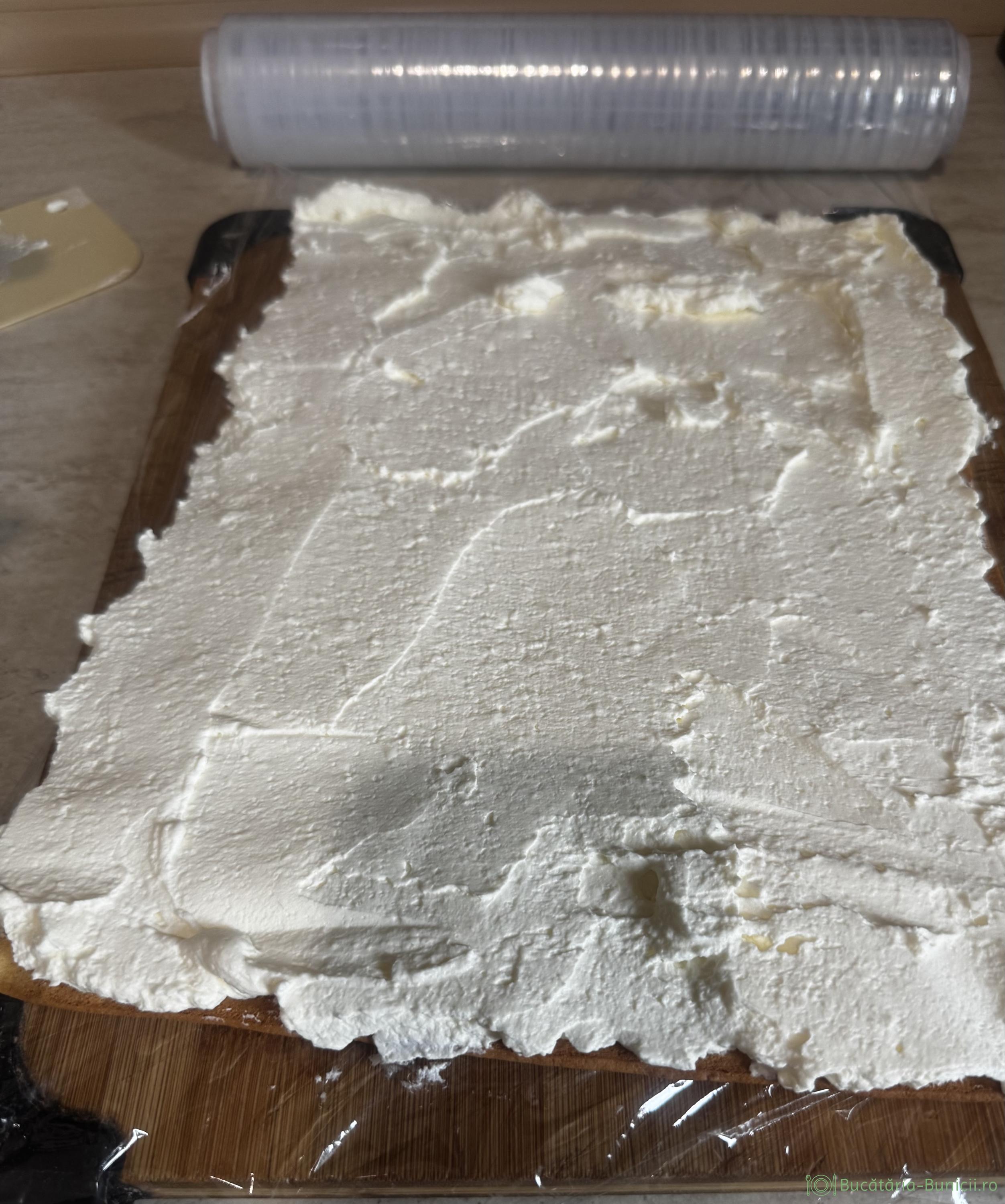 - Se îndepărtează folia alimentară, iar pe ultima foaie se întinde crema rămasă.