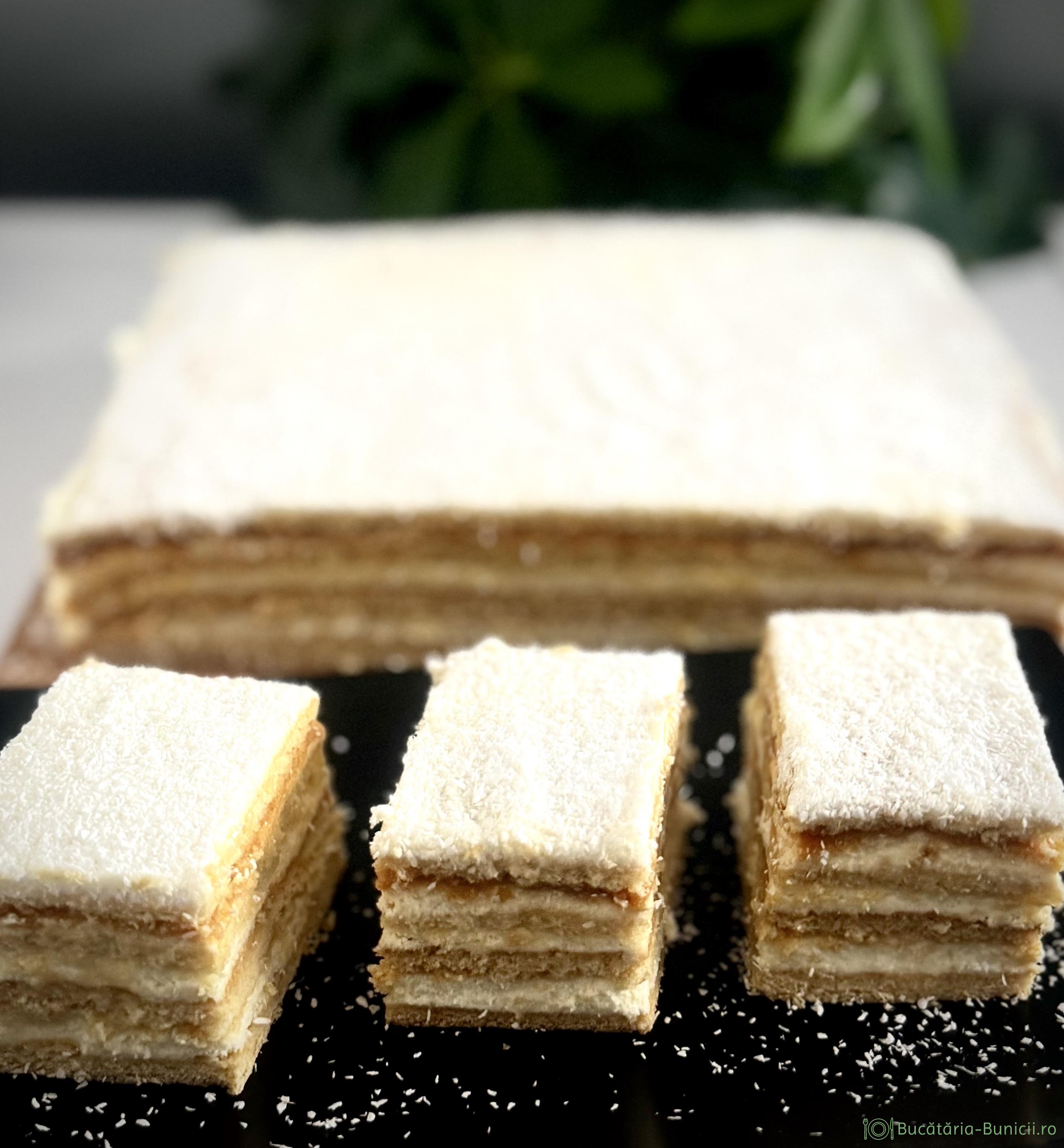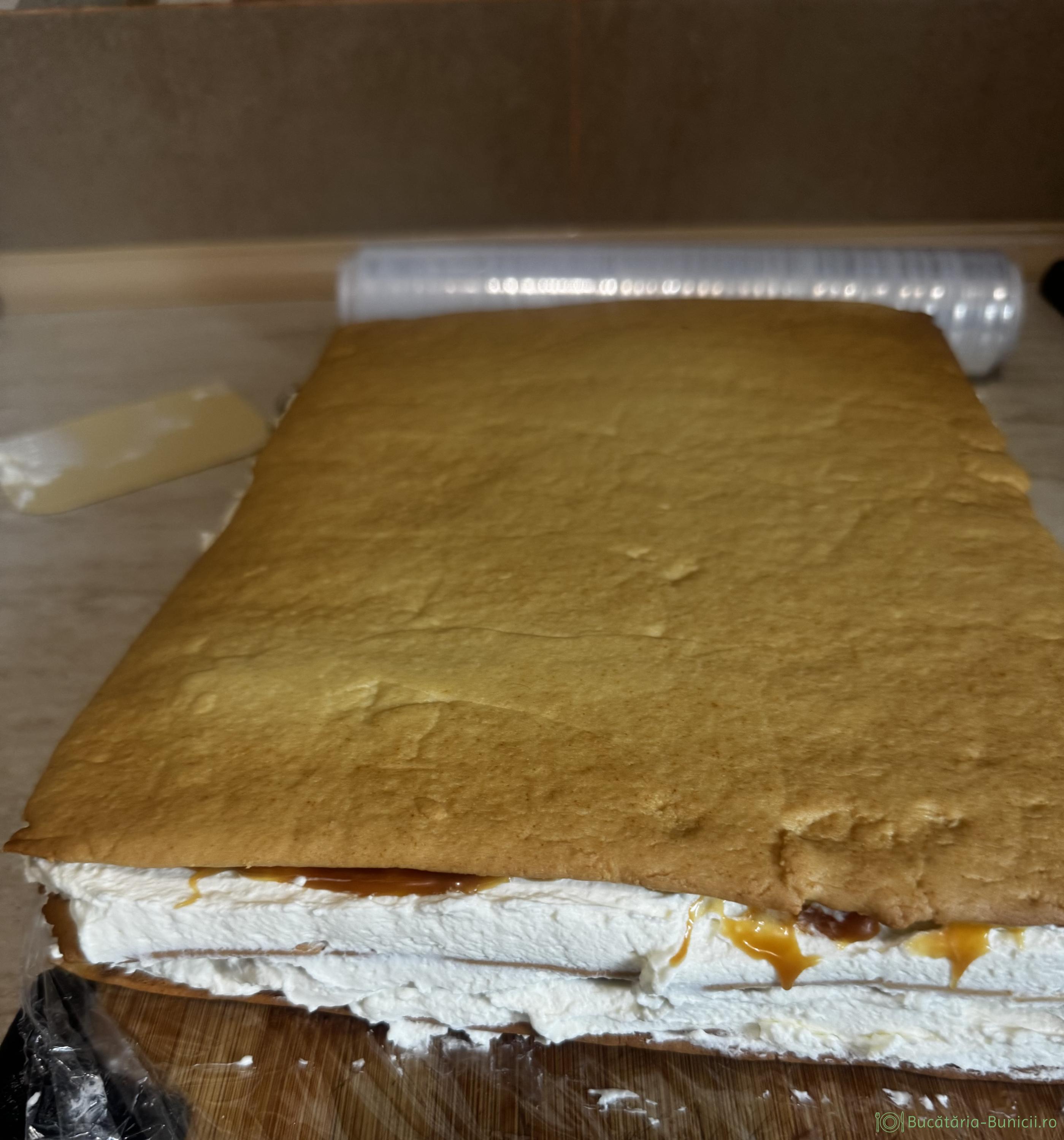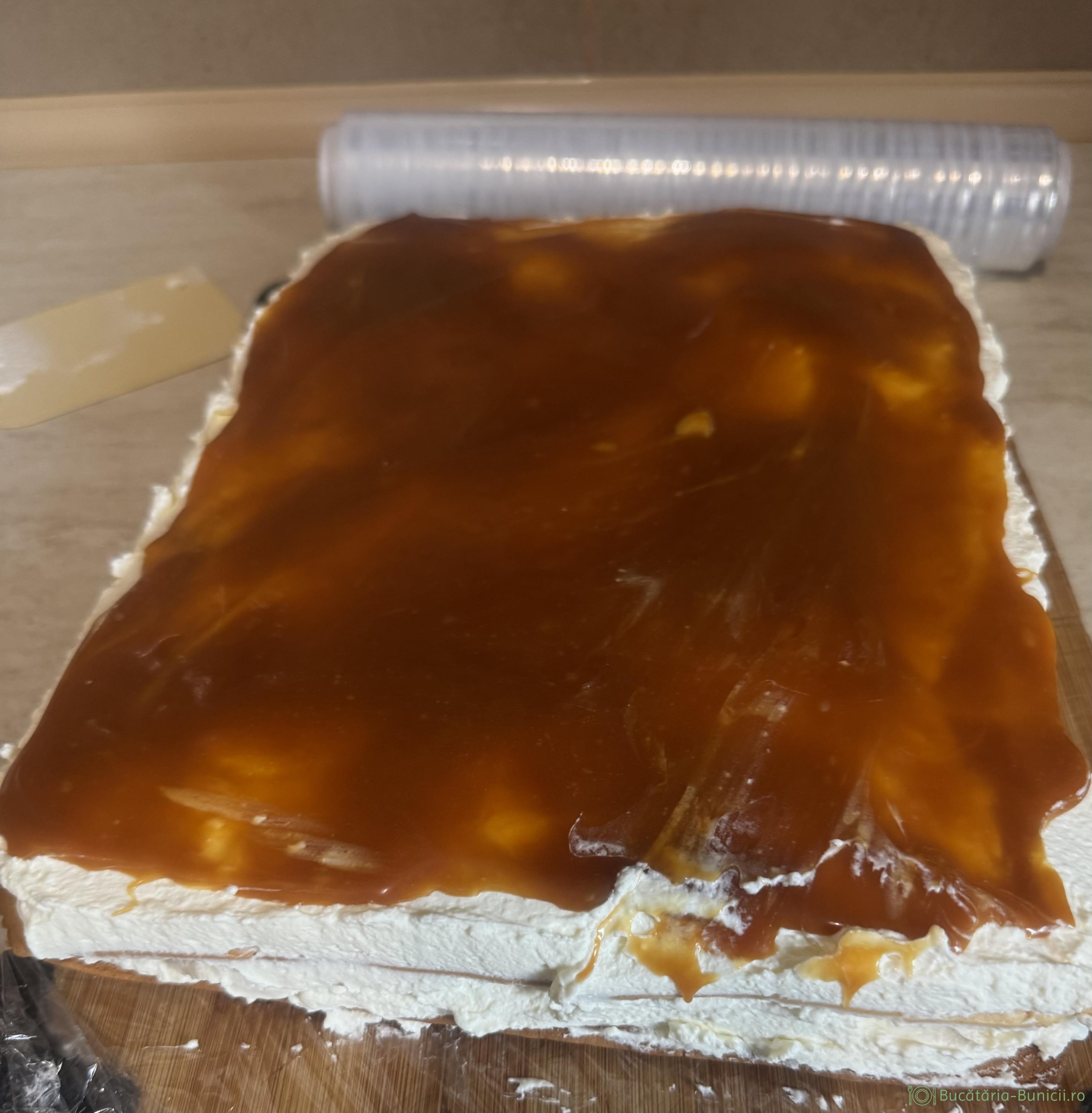 - Se așază o foaie, se întinde un sfert din crema, continuăm cu foaie, 1/4 din crema, foaie, 1/4 cremă, apoi strat de caramel și terminăm cu foaie.