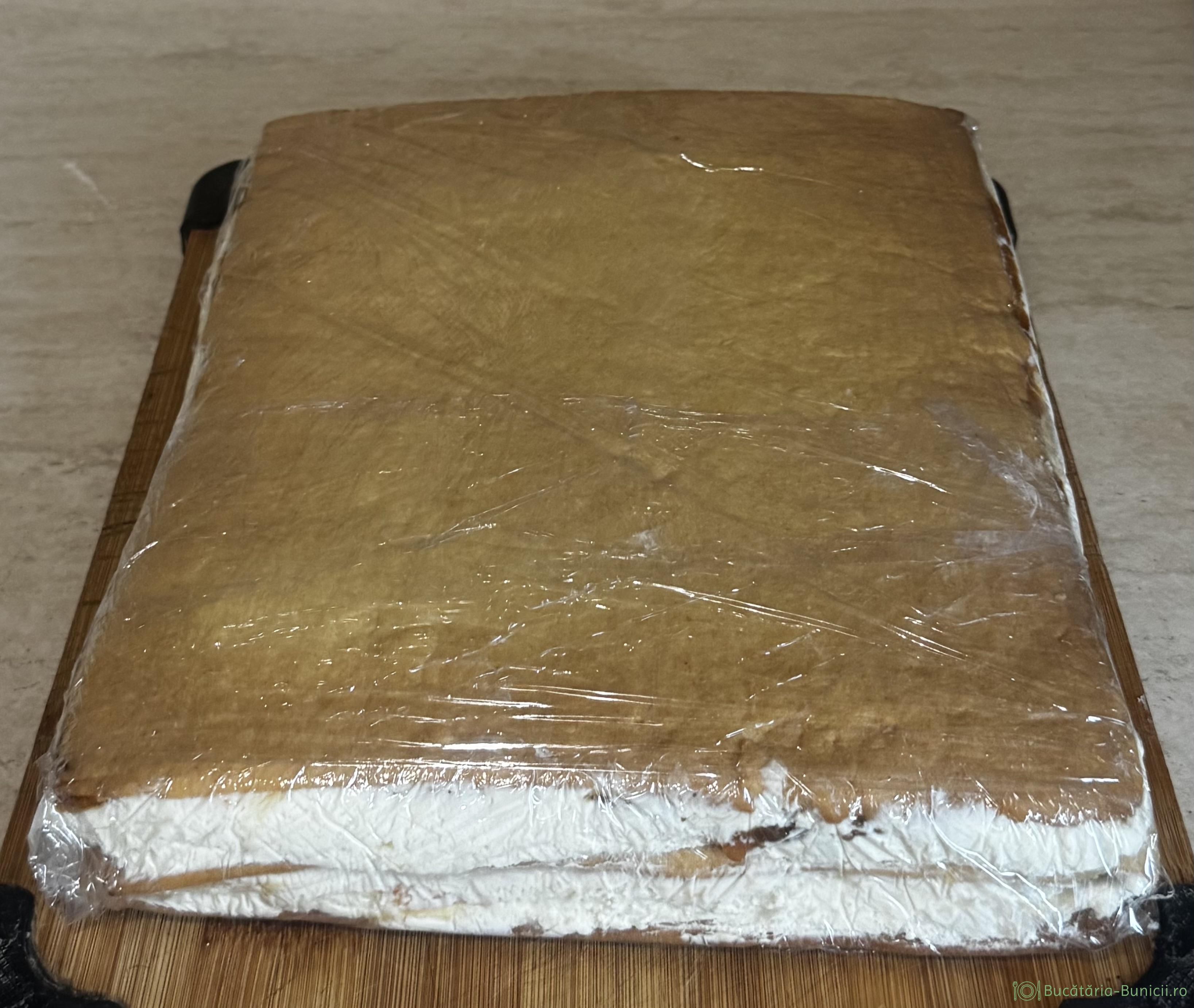- Prăjitura se învelește în folie alimentară, se pune într-un loc răcoros, dar nu la frigider, se așază o greutate pe ea și se lasă în acest fel o zi, sau peste noapte.