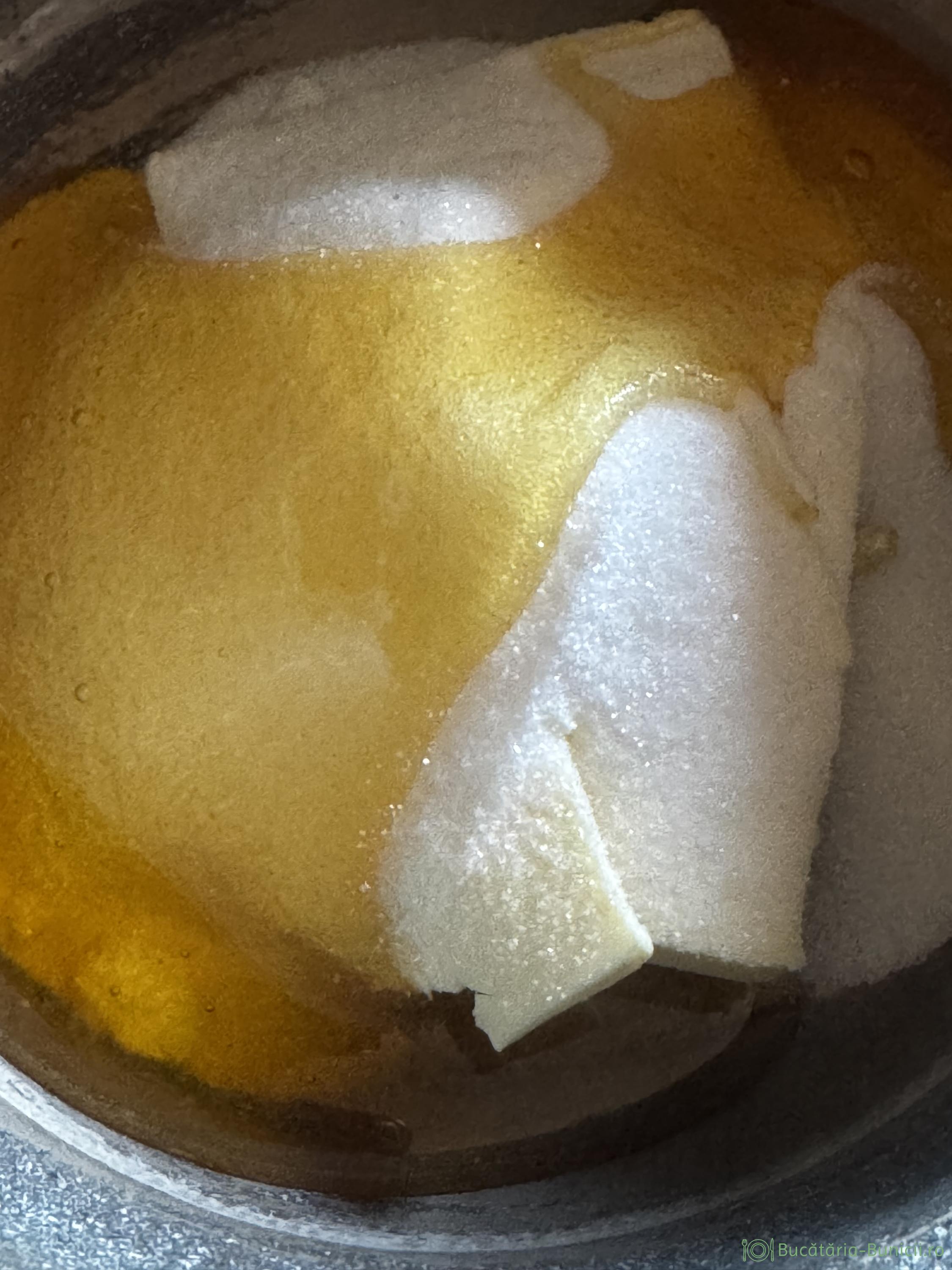 - Într-o crăticioară se pun la încălzit untul, mierea și zahărul, până se topește untul și se dizolvă zahărul (doar încălzim, nu fierbem compoziția).
