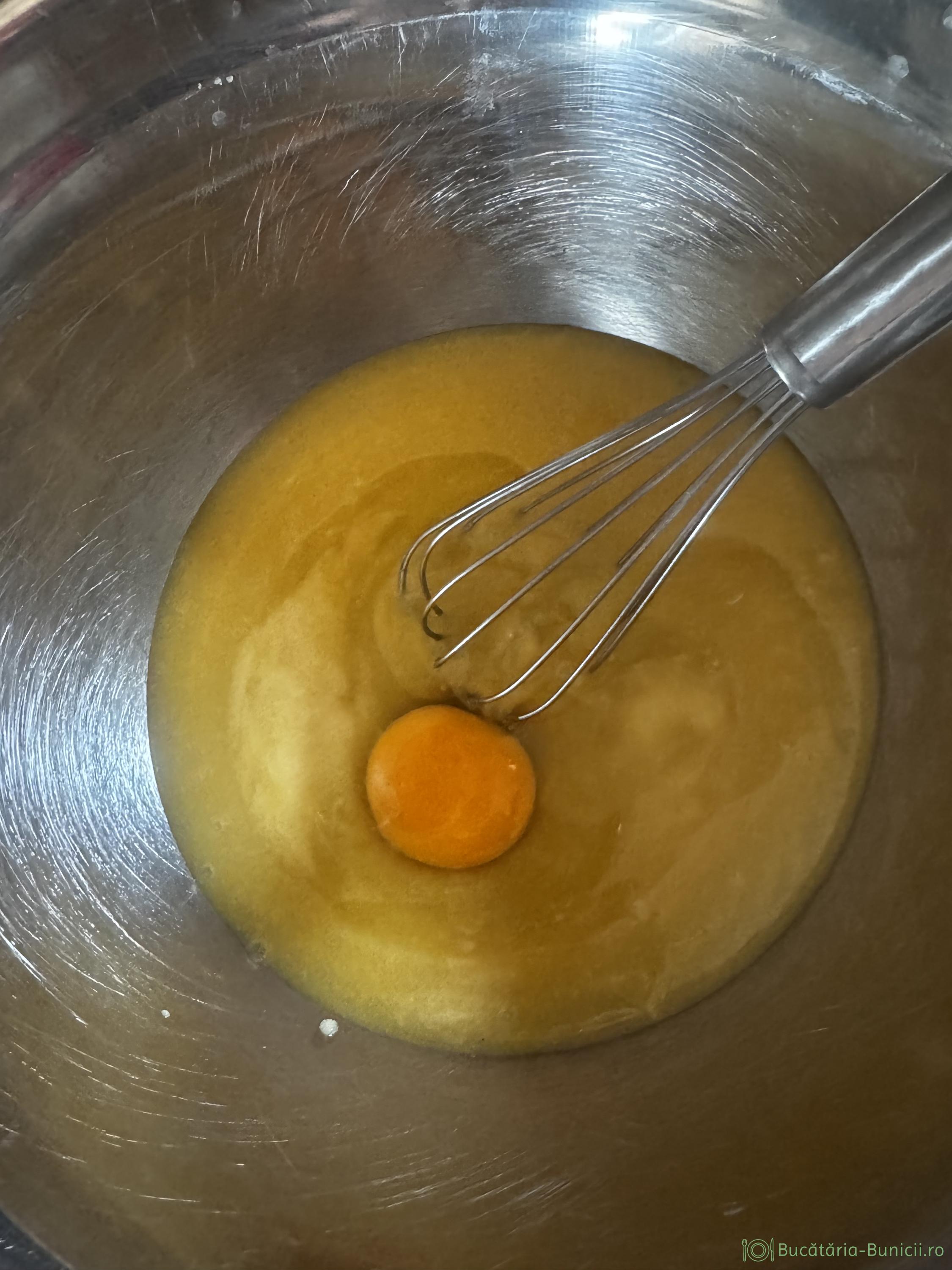 - Crema obținută se transferă într-un vas și se adaugă pe rând ouăle, amestecând cu telul, până se încorporează în cremă.