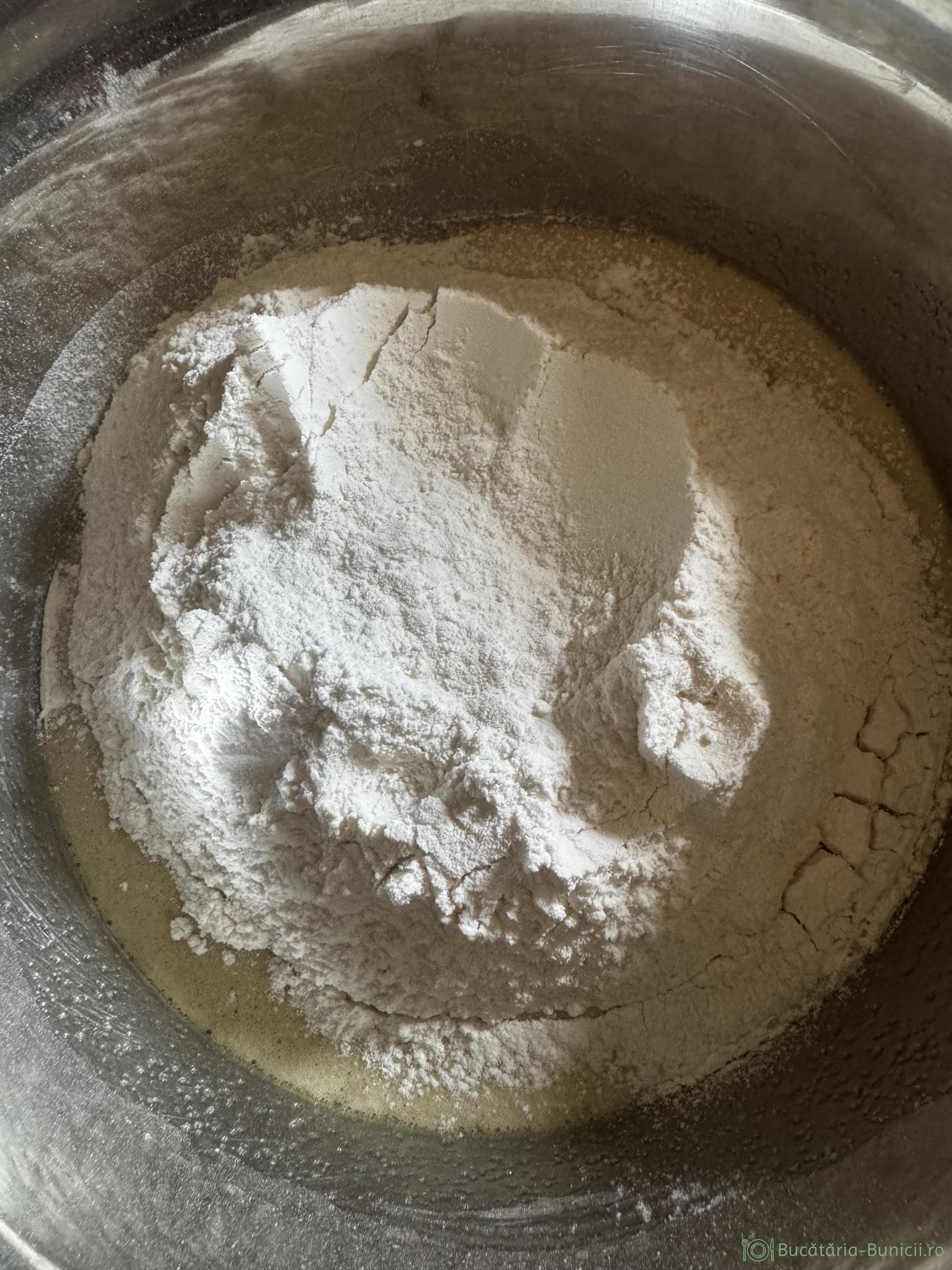 - Se adaugă făină, sarea, bicarbonatul de sodiu și se frământă un aluat, care se poate lucra cu el. La cantitatea inițială de făină, eu am adăugat încă 100 grame, până când aluatul a devenit nelipicios.