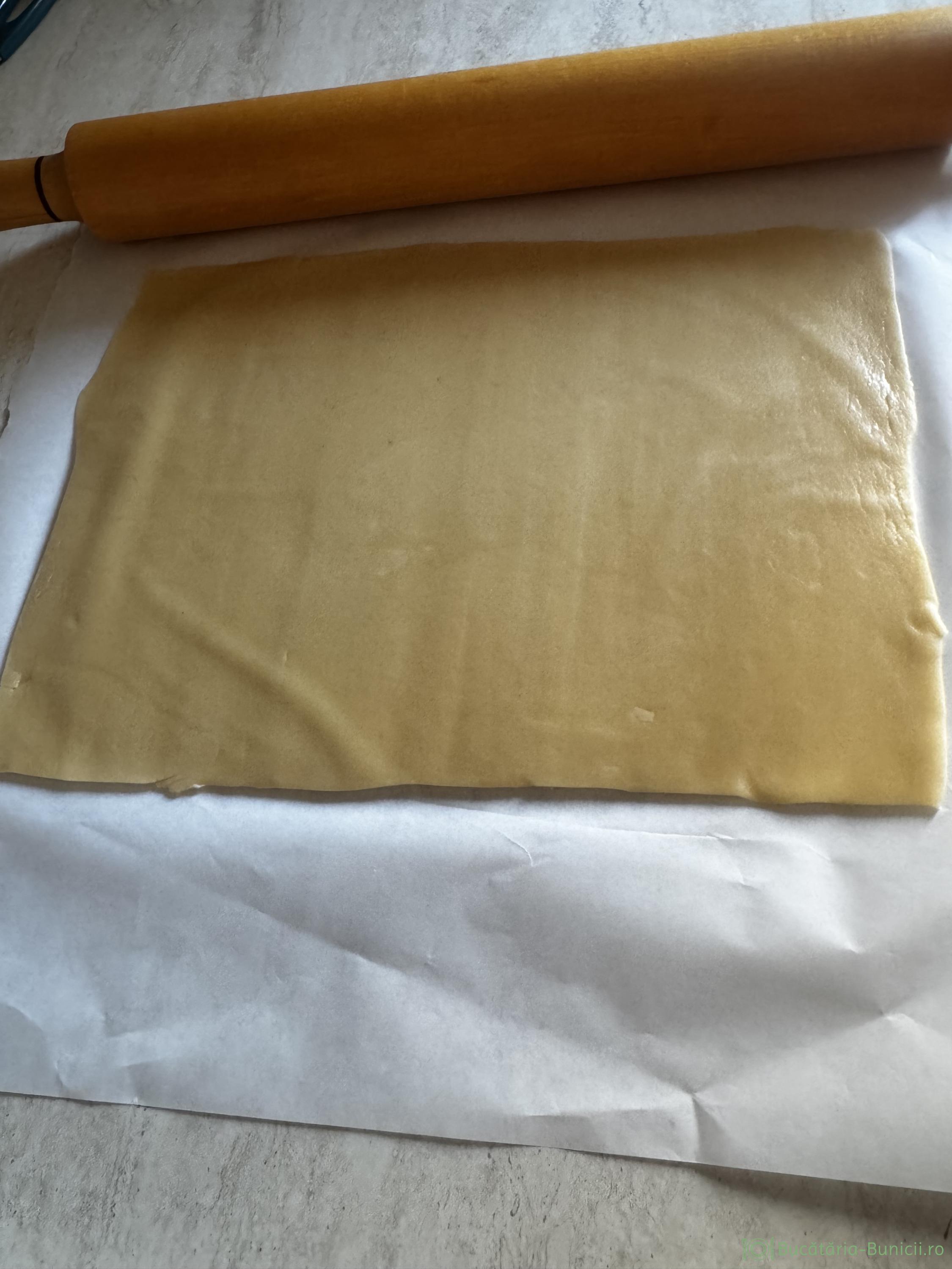 - Fiecare bucată se lucrează separat. Se întinde cu sucitorul, direct pe hârtie de copt, într-un strat subțire de 2-3 mm și diametru de 20/30 cm, sau mai mare dacă se poate (21/32 cm am reușit să întind aluatul). Se lucrează greu, ca are tendința, să se rupă, dar nu este imposibil.
