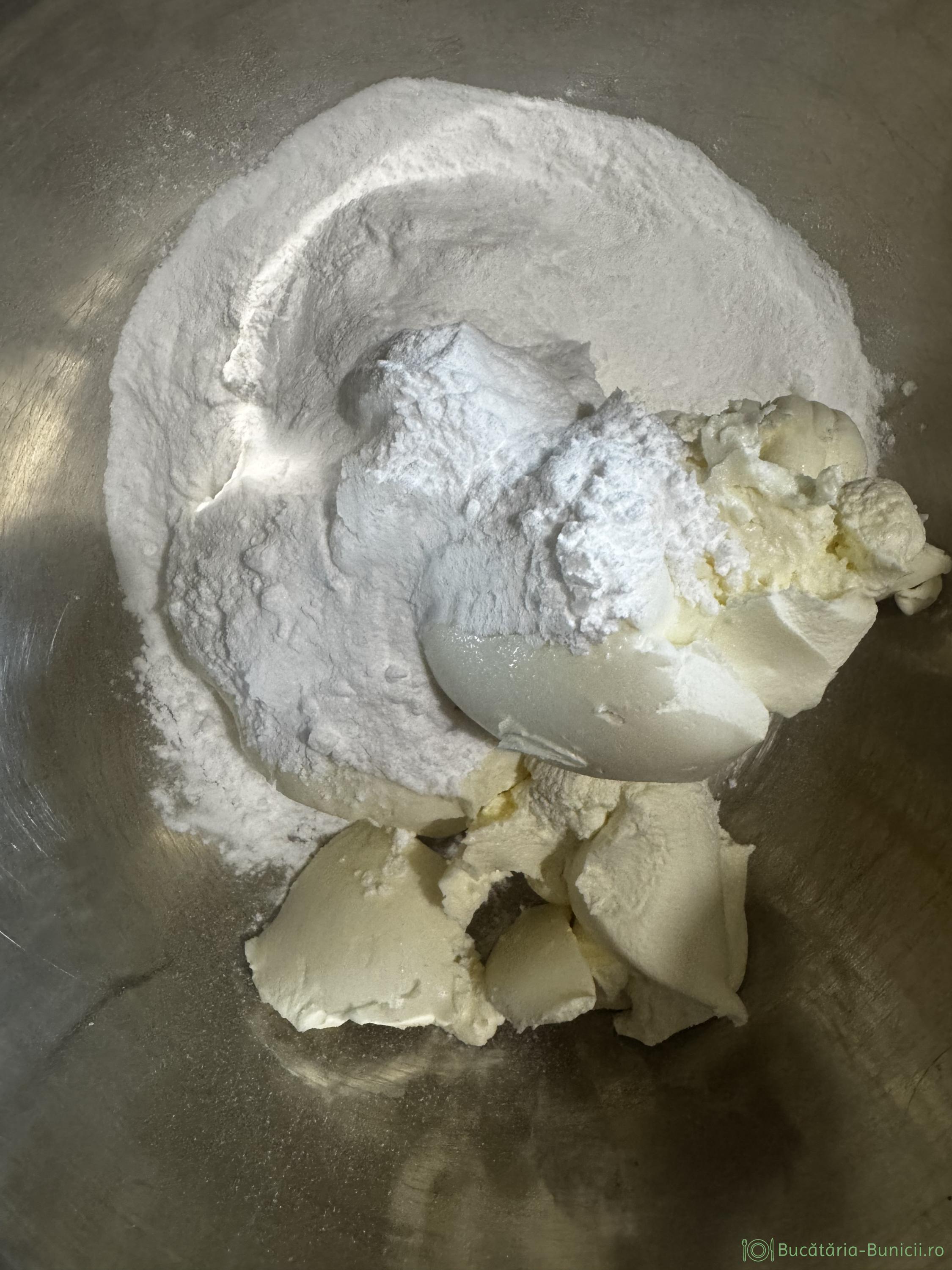- Mascarpone se mixează cu zahărul pudră, până devine cremos, apoi se încorporează frișca în trei tranșe, folosind un tel, sau spatulă.