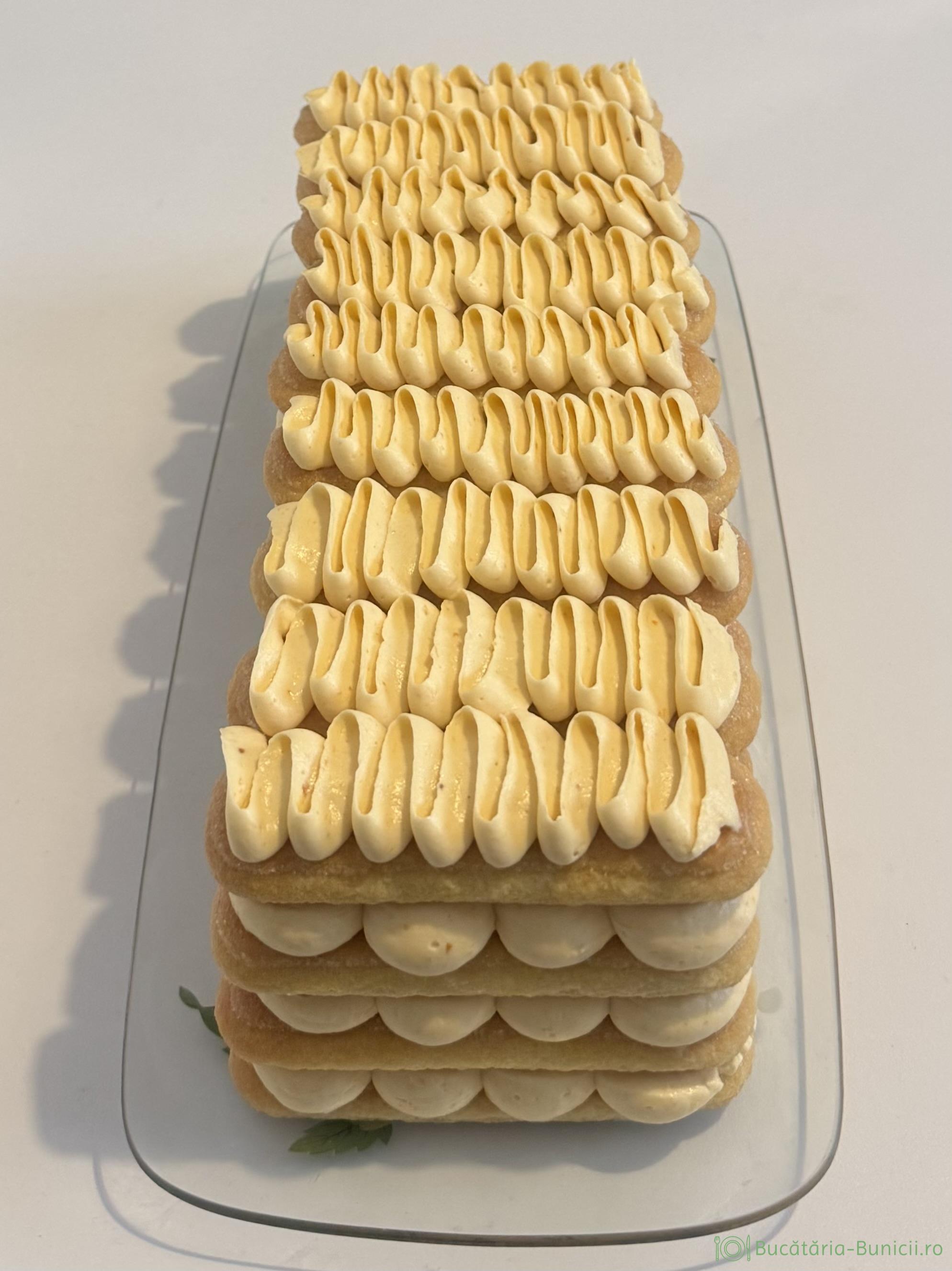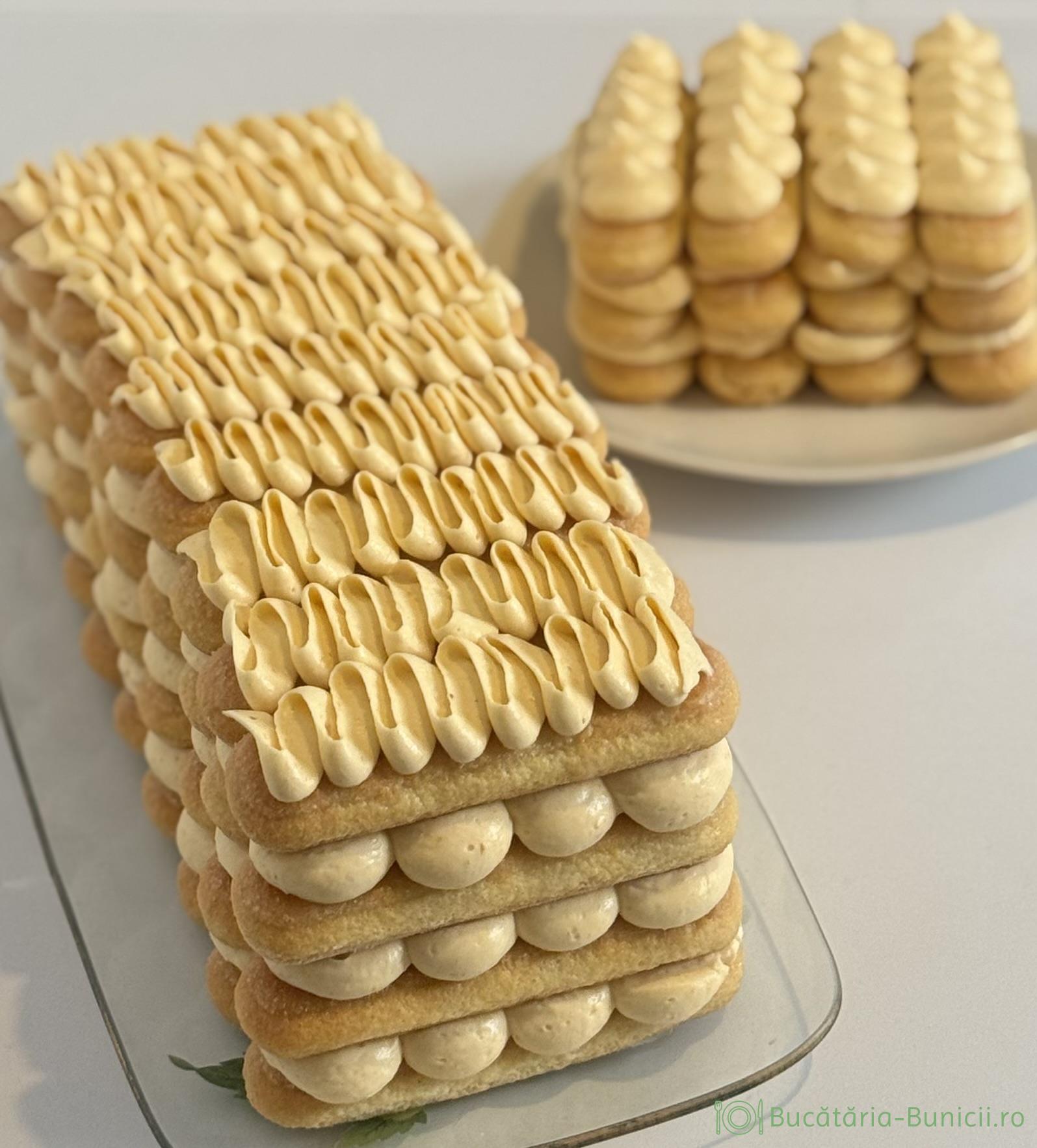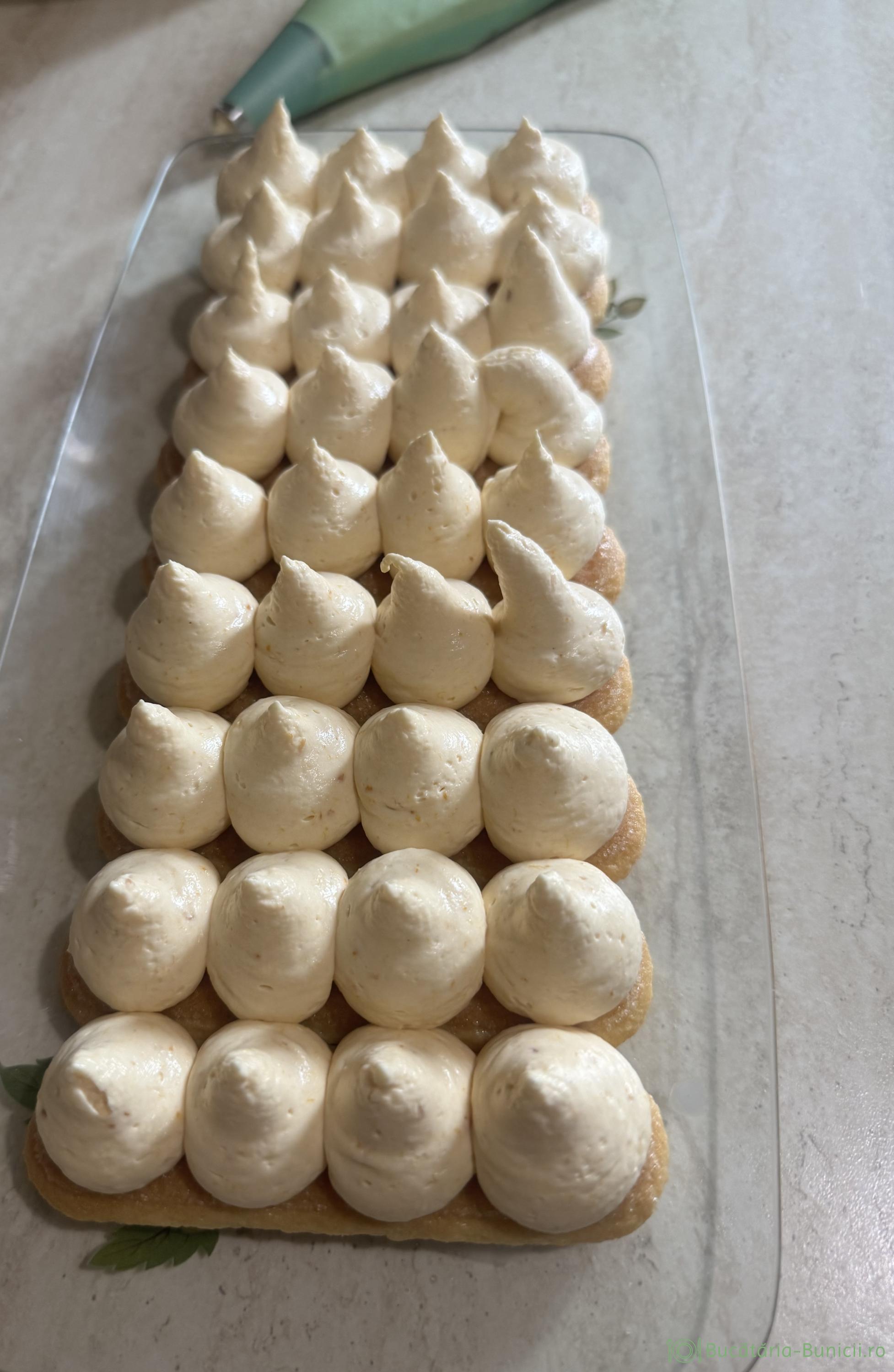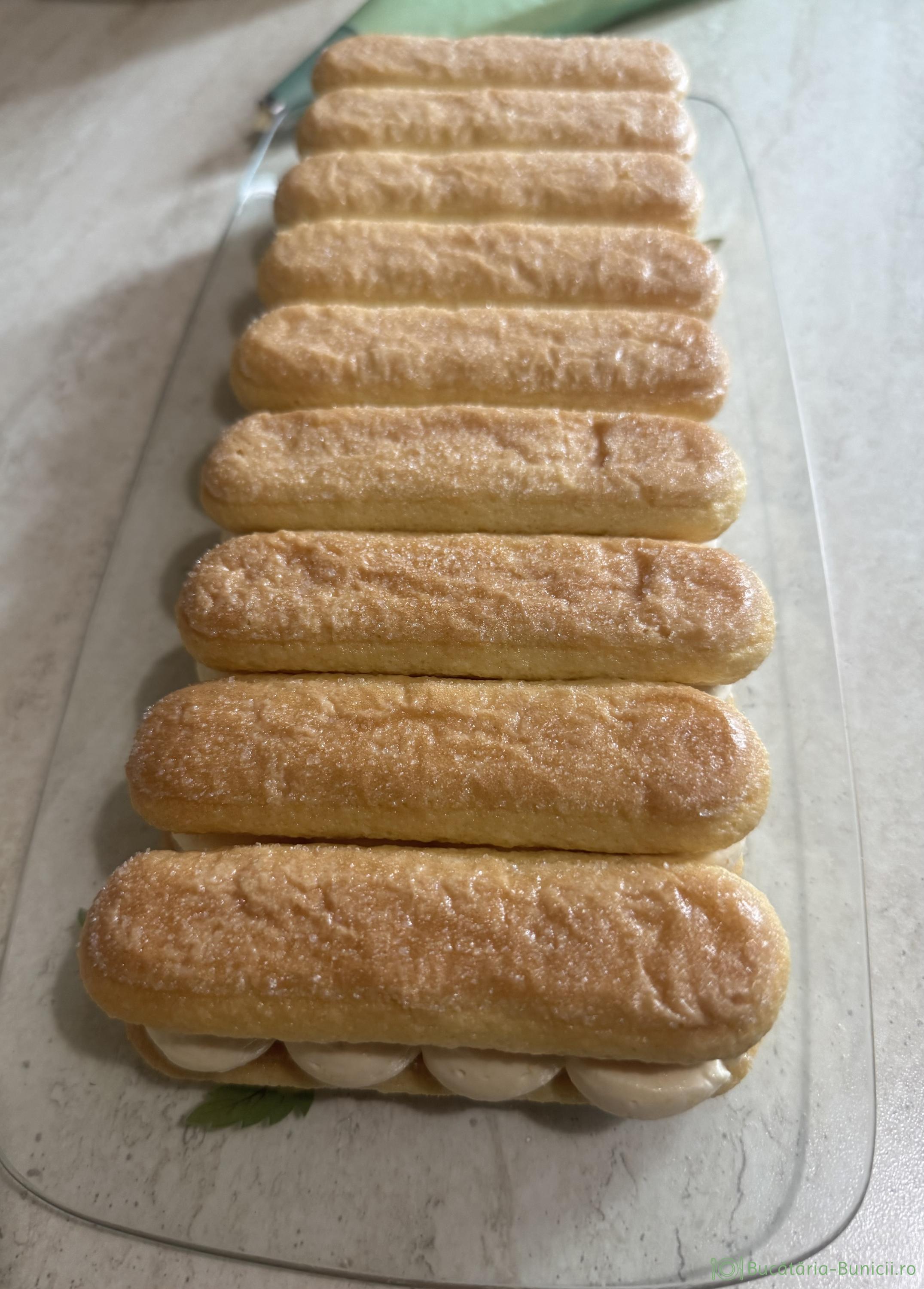 - Se așază al doilea rând de pișcoturi exact peste primul rând, dar de această dată pișcotul se trece prin lapte doar partea cu zahăr, pentru ca, rândul de pișcot este între două rânduri de cremă și au cu ce se înmuia pișcoturile.
