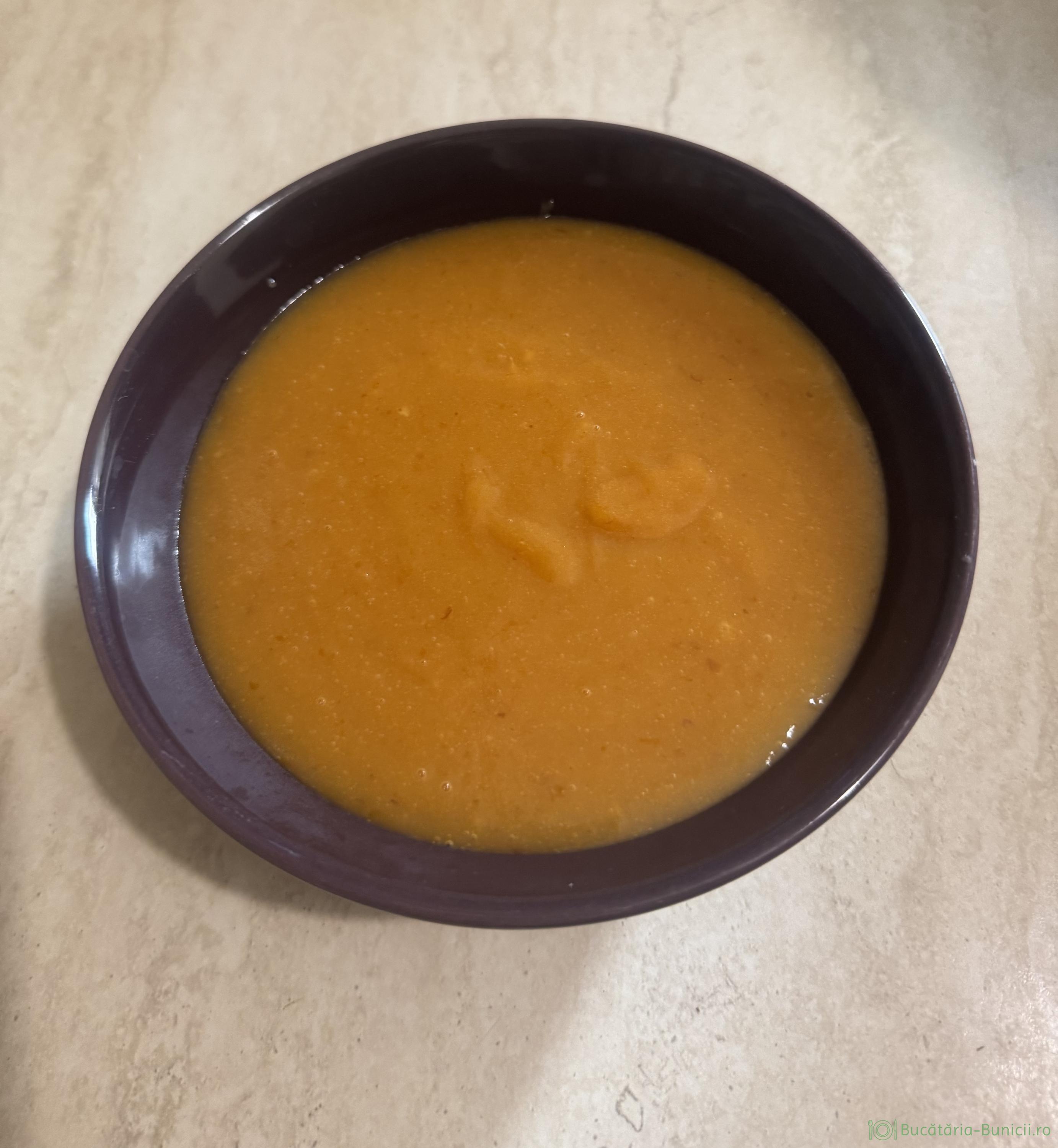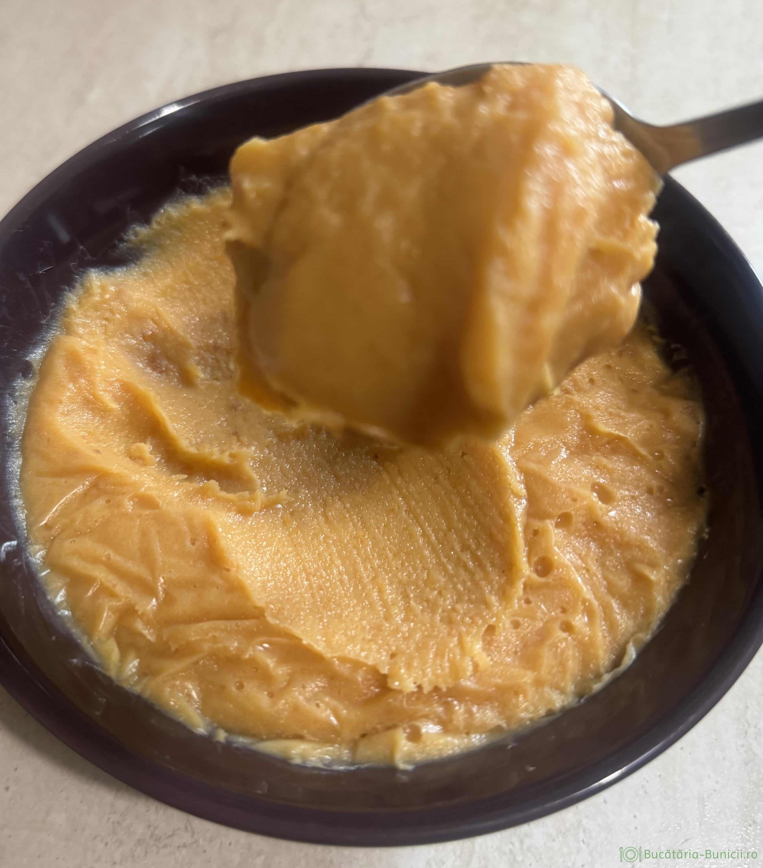 - Se lasă ciocolata, să se înmoaie cateva minute in piureul fierbinte, apoi se amestecă energic, până obținem o cremă moale și uniformă. Se pune folie alimentară direct pe cremă, se lasă la răcit la temperatura camerei, apoi se dă la frigider minim 6 ore, până se întărește.