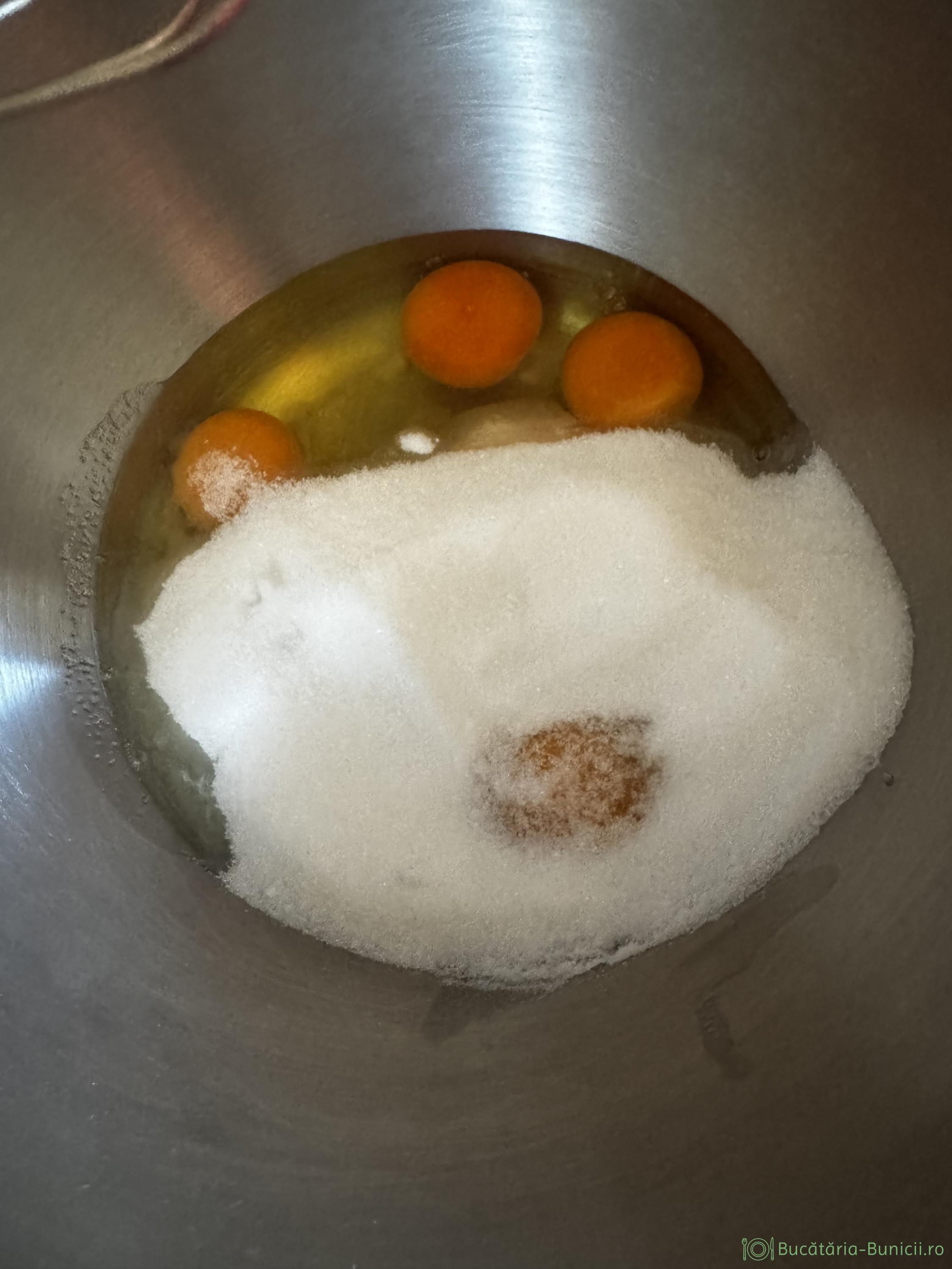 - Într-un bol se mixează ouăle cu zahărul, minim cinci minute, până obținem o cremă deschisă la culoare și crescută în volum.