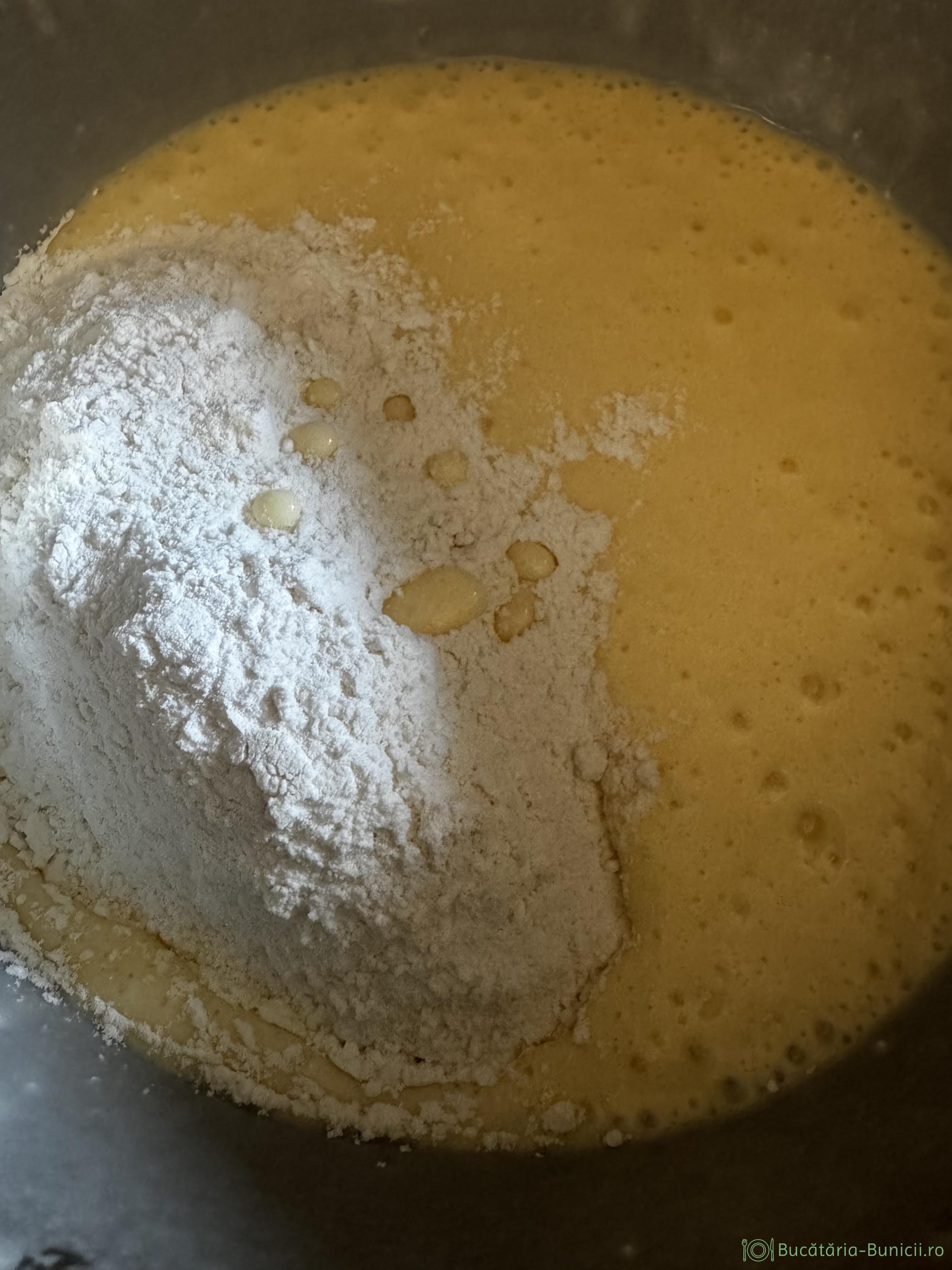 - Se adaugă făina și praful de copt, mixând doar cat obținem o compoziție omogenă.