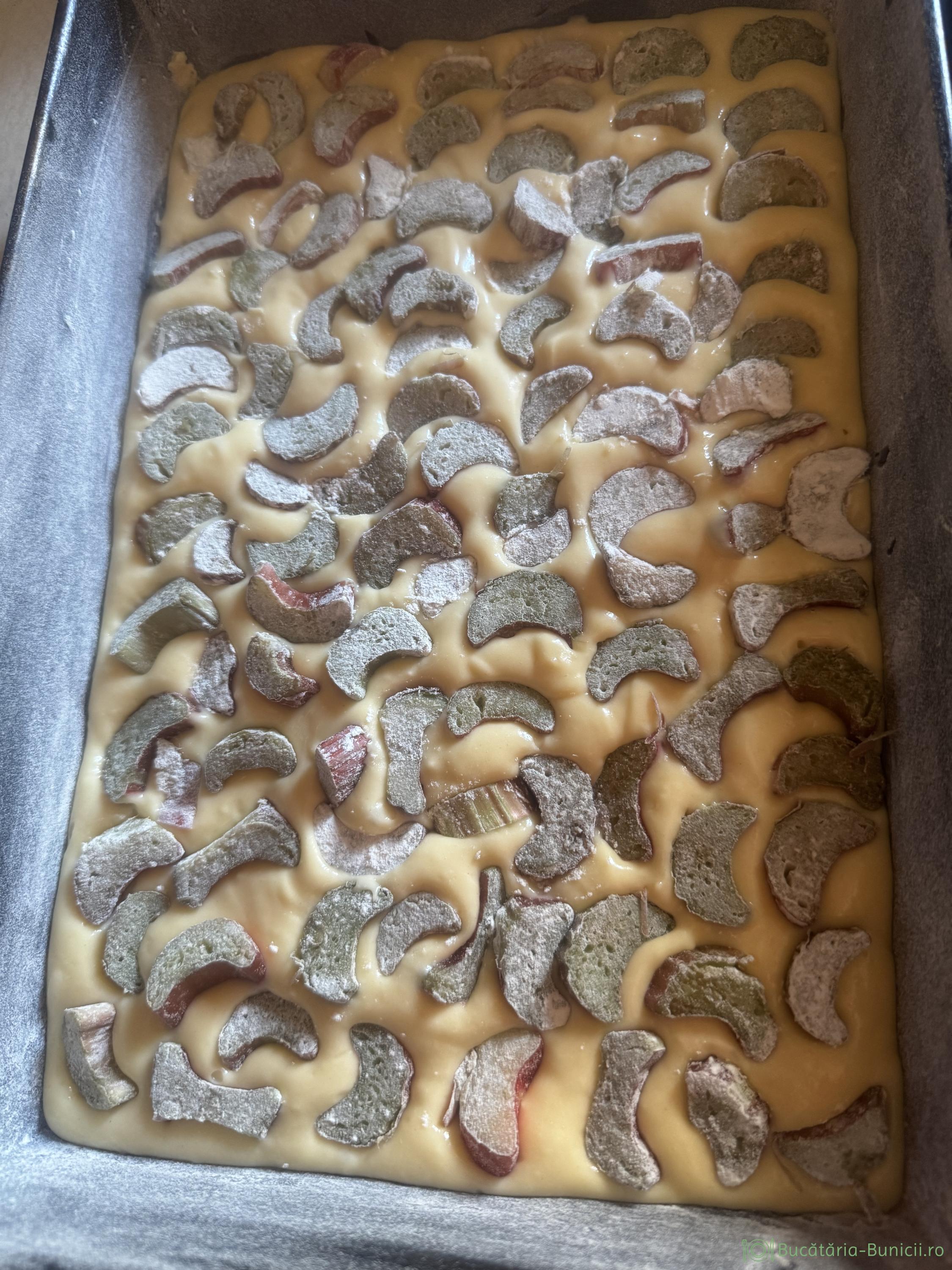 - Peste bucățile de rubarba se pun două linguri de făină, se scutură vasul, să intre făină prin toate bucățile de rubarba, apoi se așază în tavă, deasupra, apăsând ușor, să se afunde in compoziția.