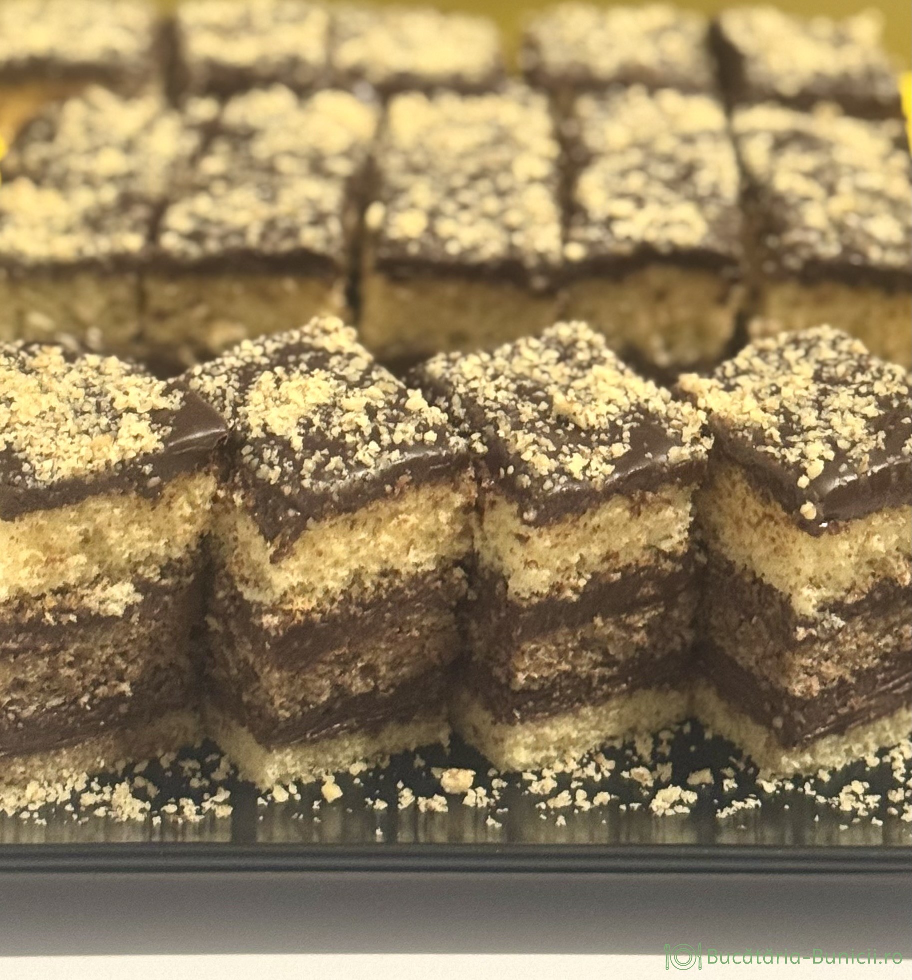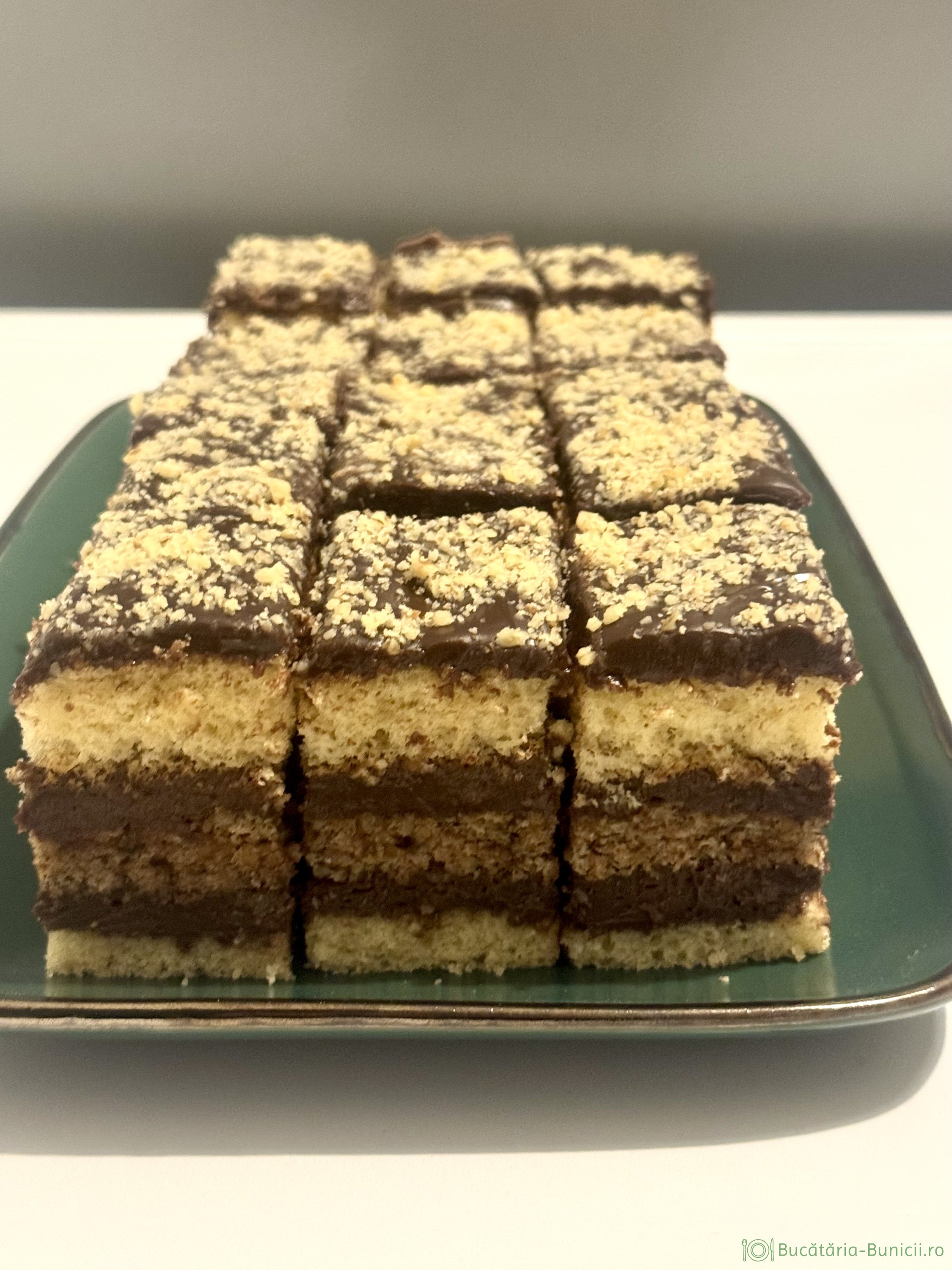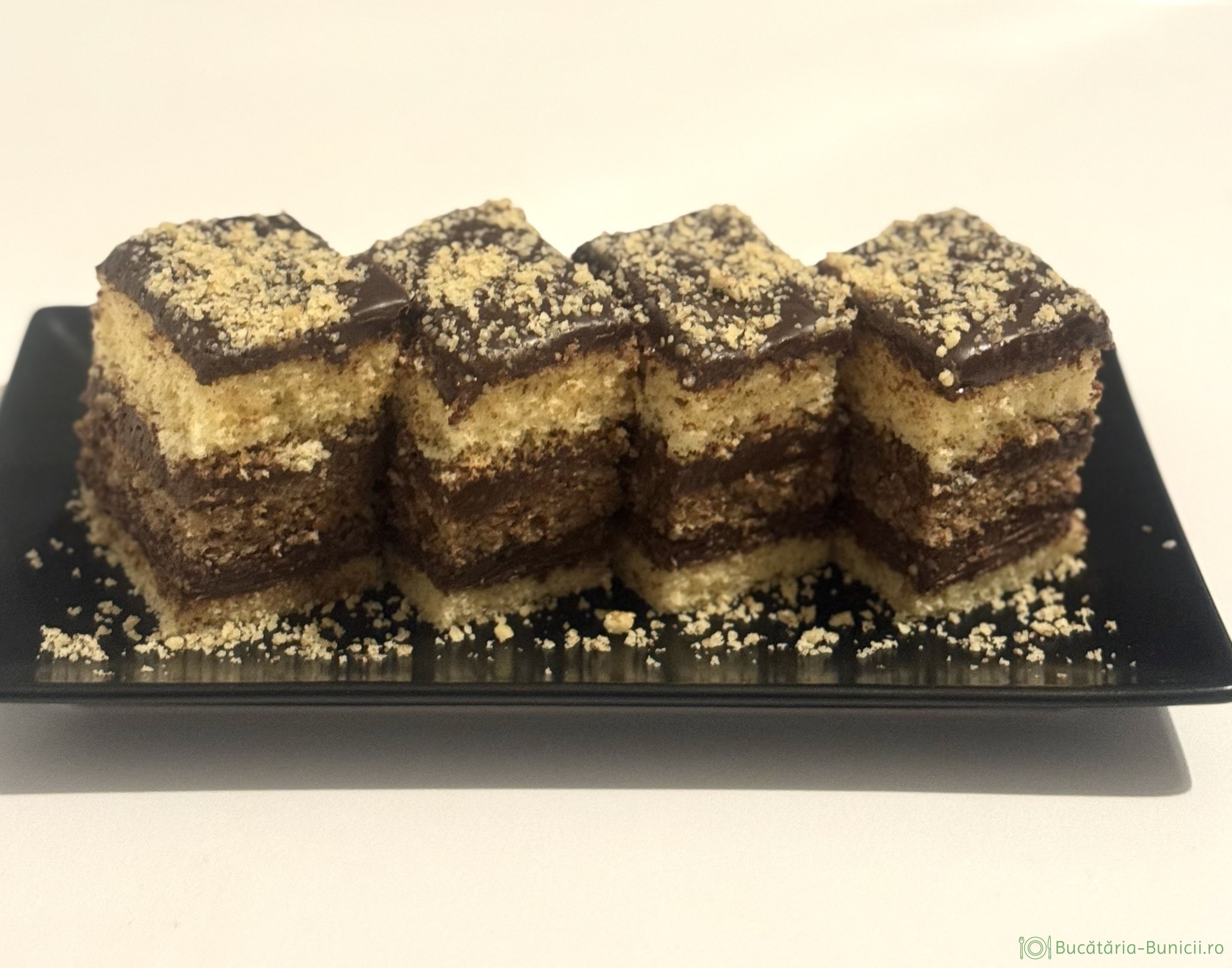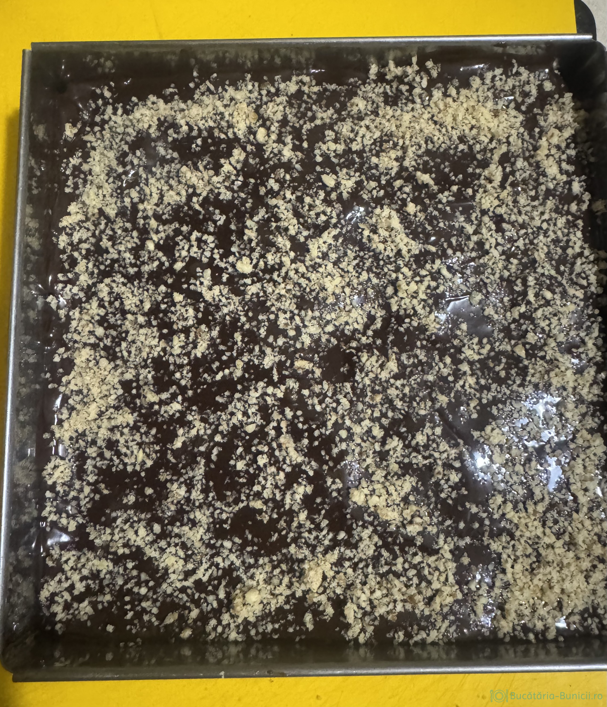 - Se așază în formă în ordinea următoare: blat galben, 1/2 din cantitatea de cremă, blatul de bezea cu nucă, restul de cremă, iar deasupra se pune al doilea blat galben.
