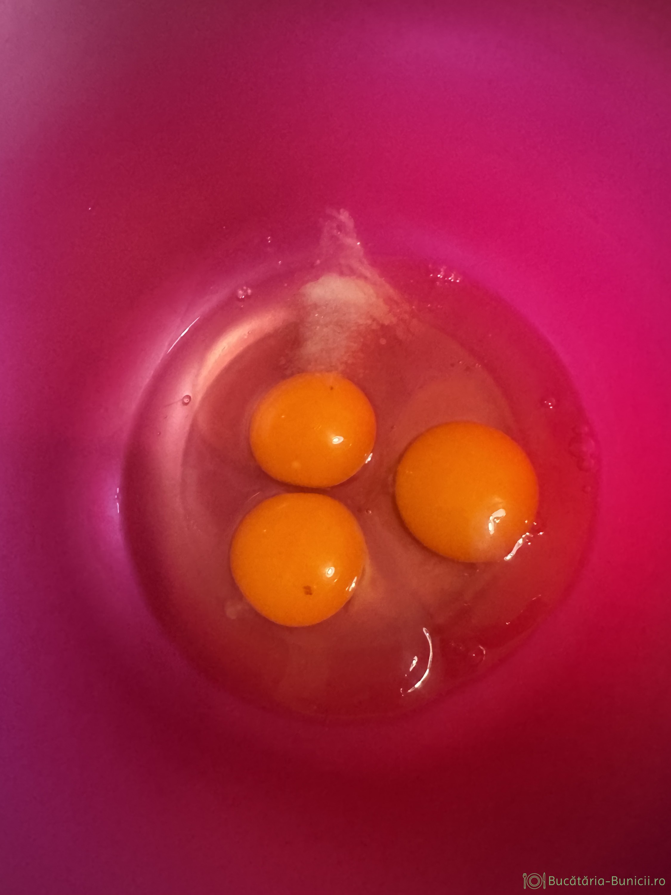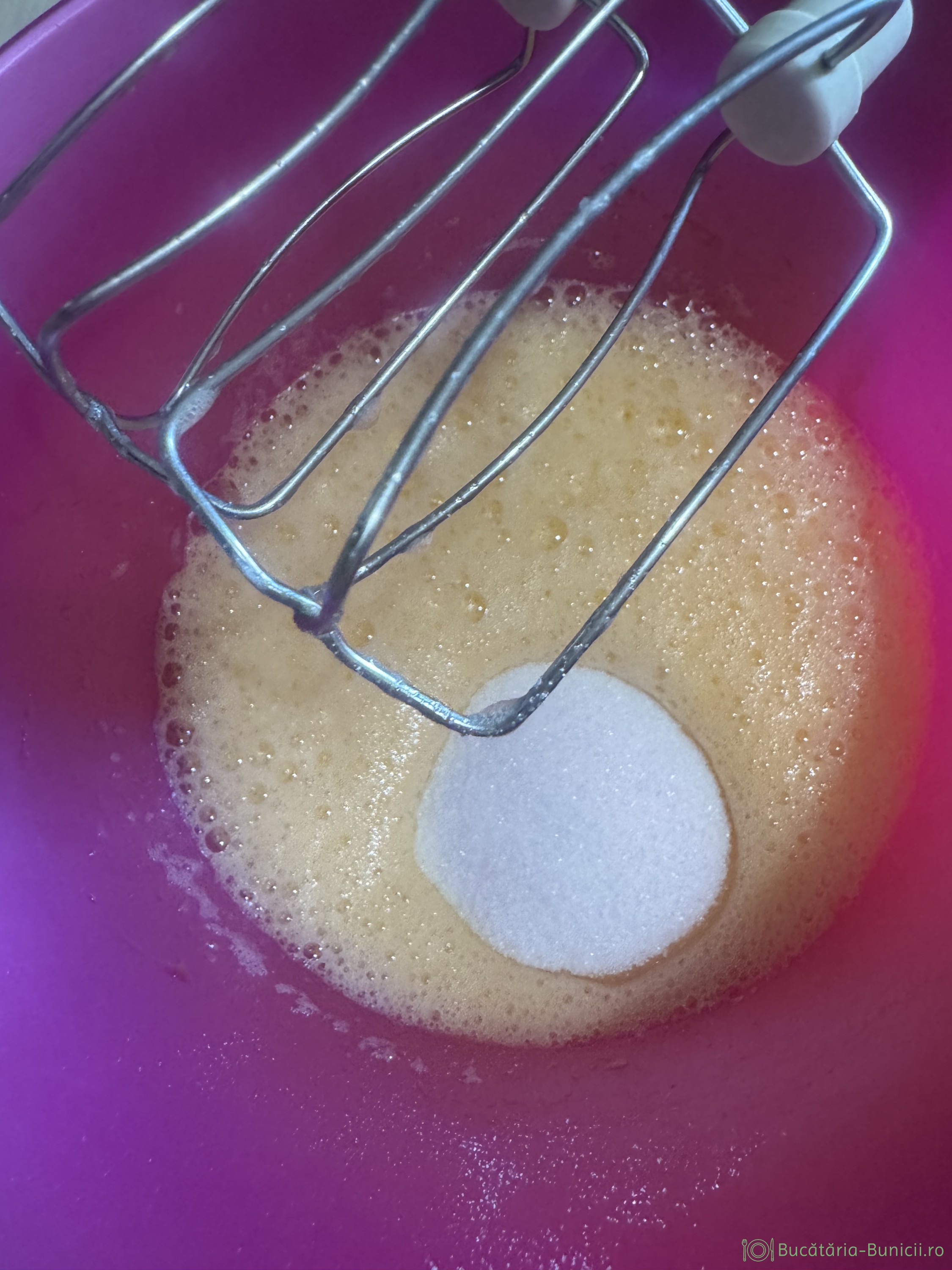 - Ouăle se mixează cu un praf de sare și zahăr, până își triplează volumul.