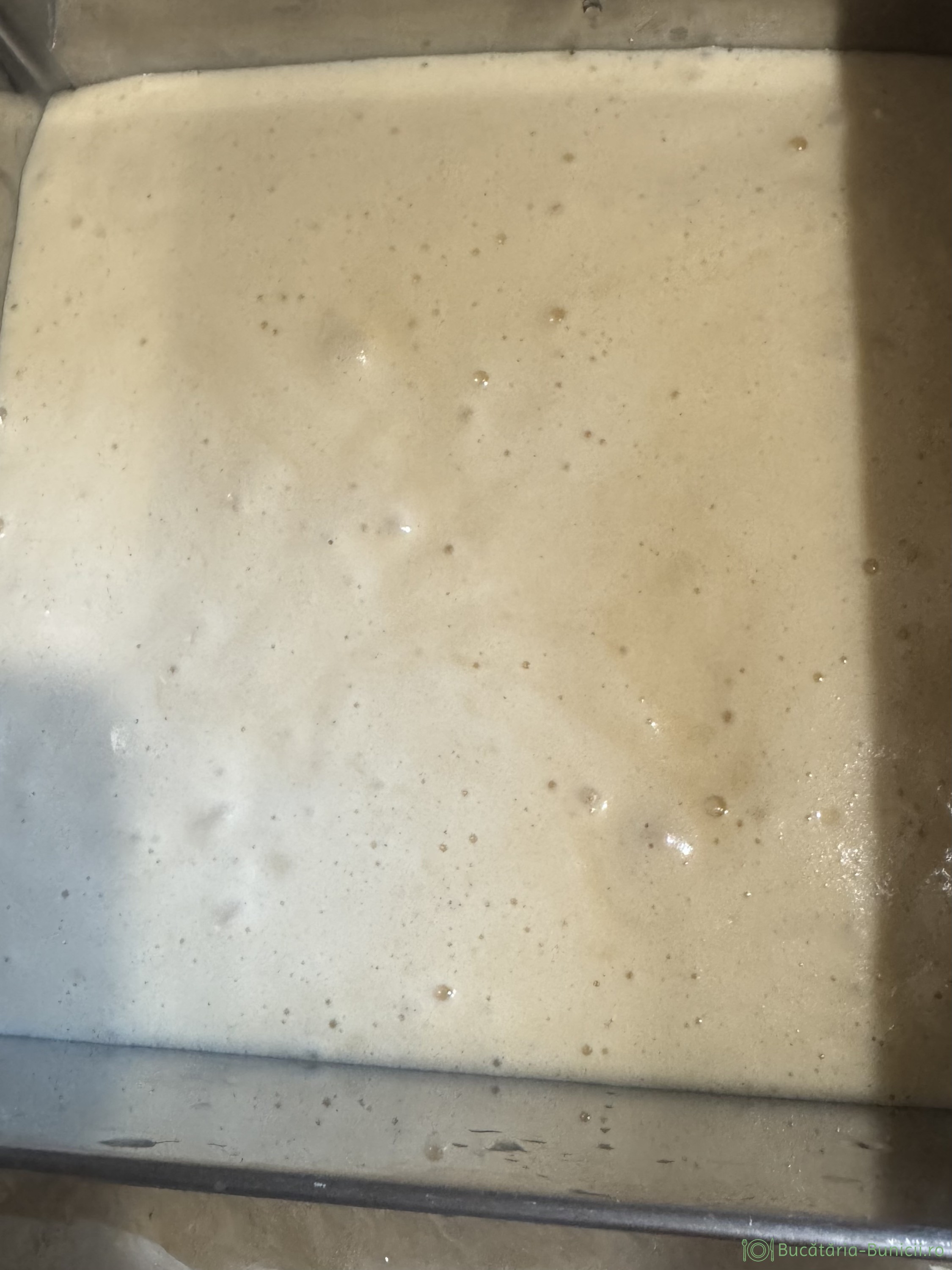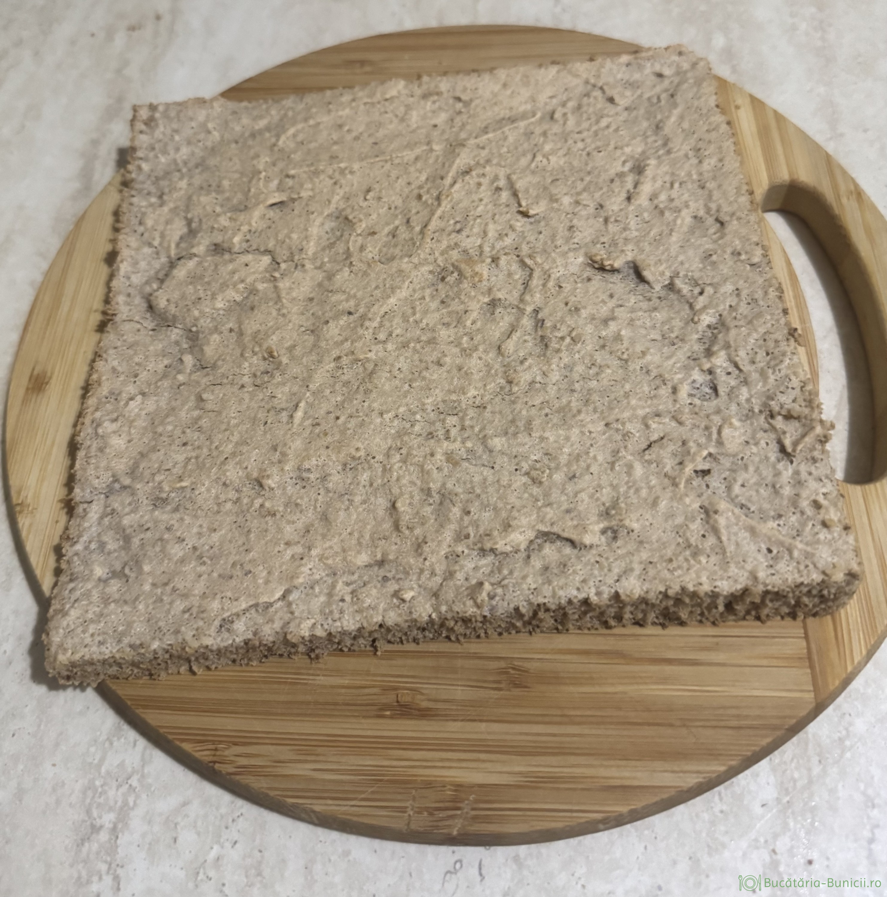 - Compoziția se toarnă în formă de 20/20 cm, care se tapetează la baza cu hârtie de copt.