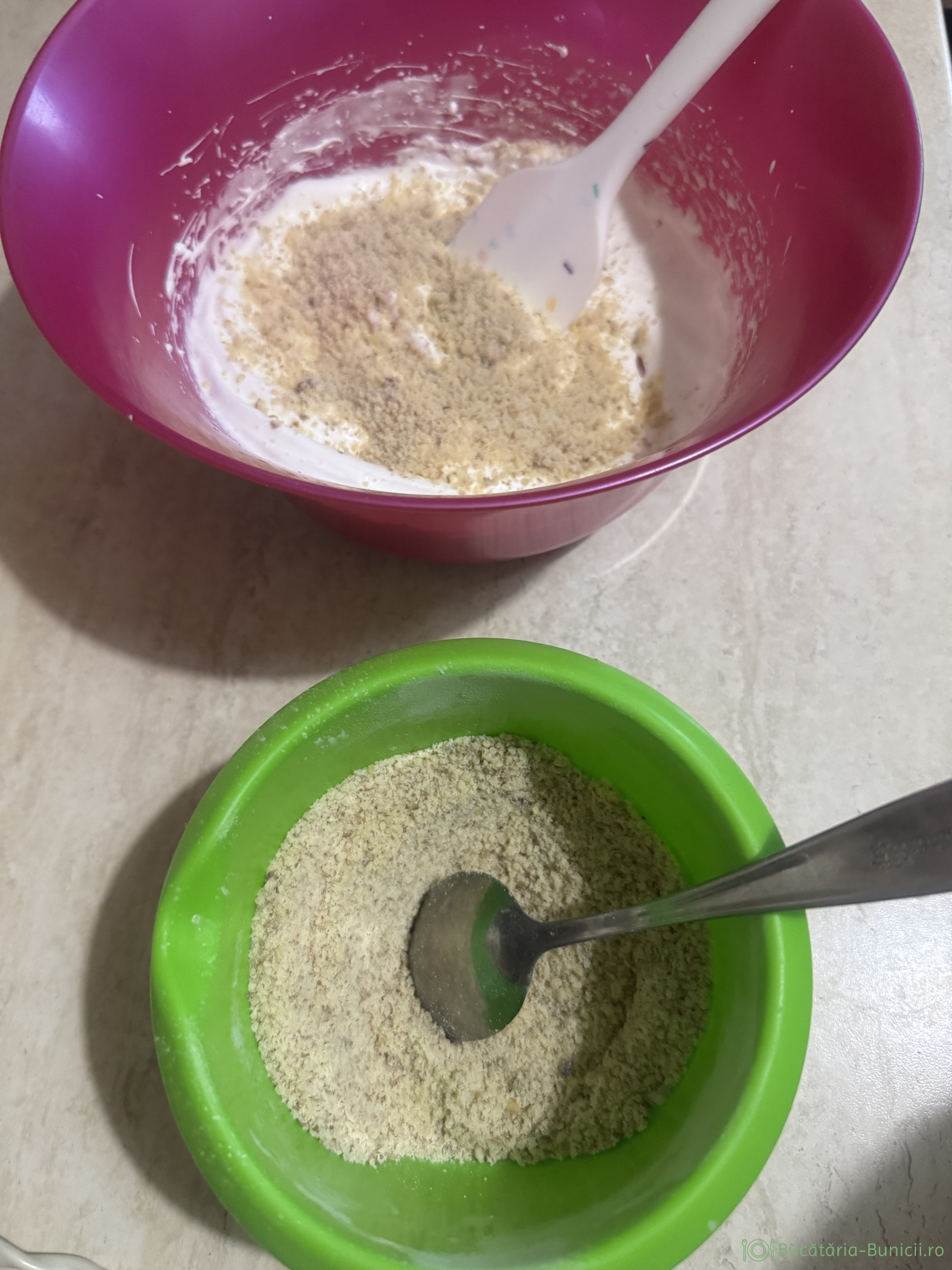 - Făina, praful de copt și miezul de nucă măcinat se amestecă împreună, apoi se încorporează treptat în bezea, amestecând ușor cu spatula.