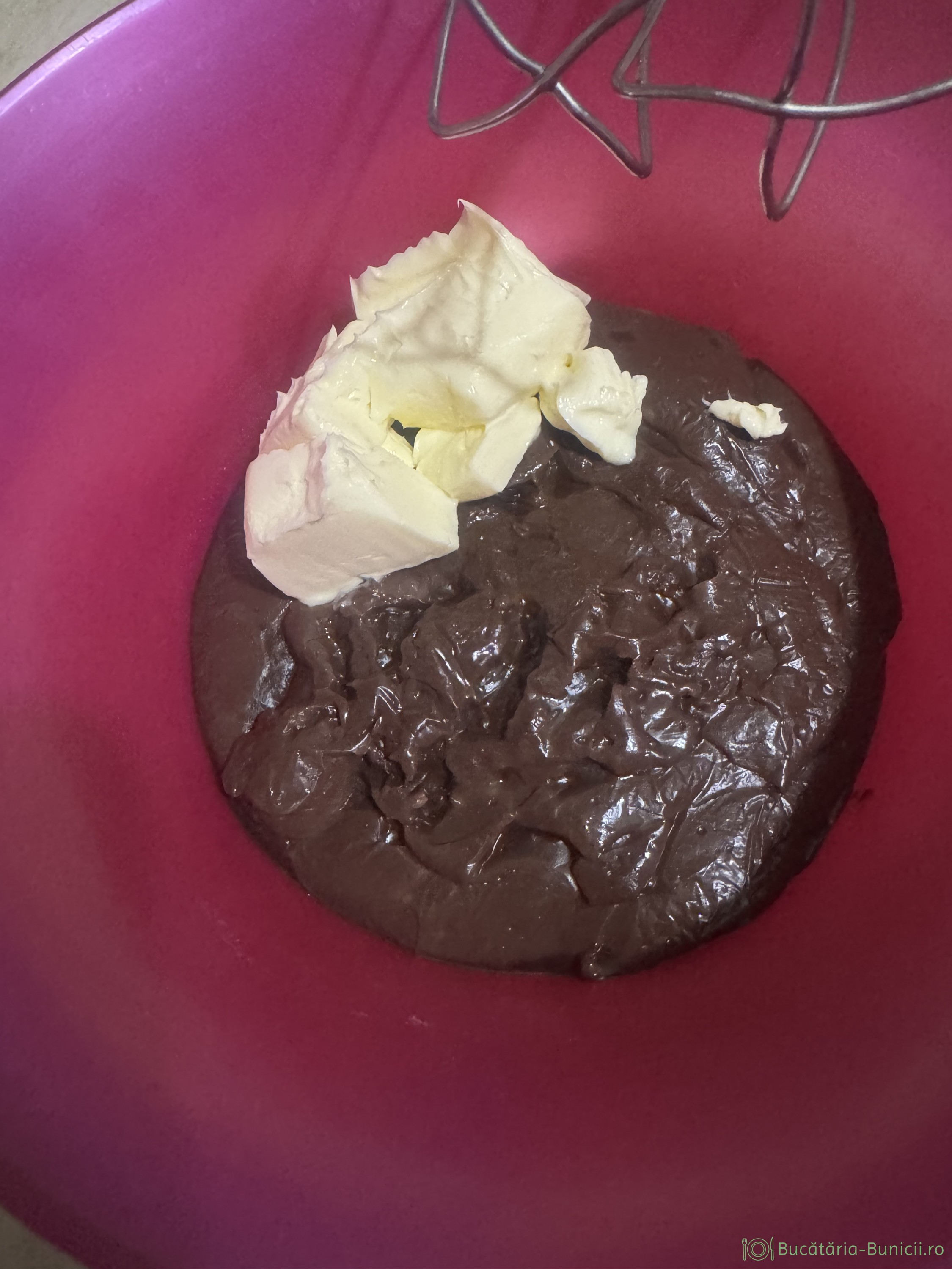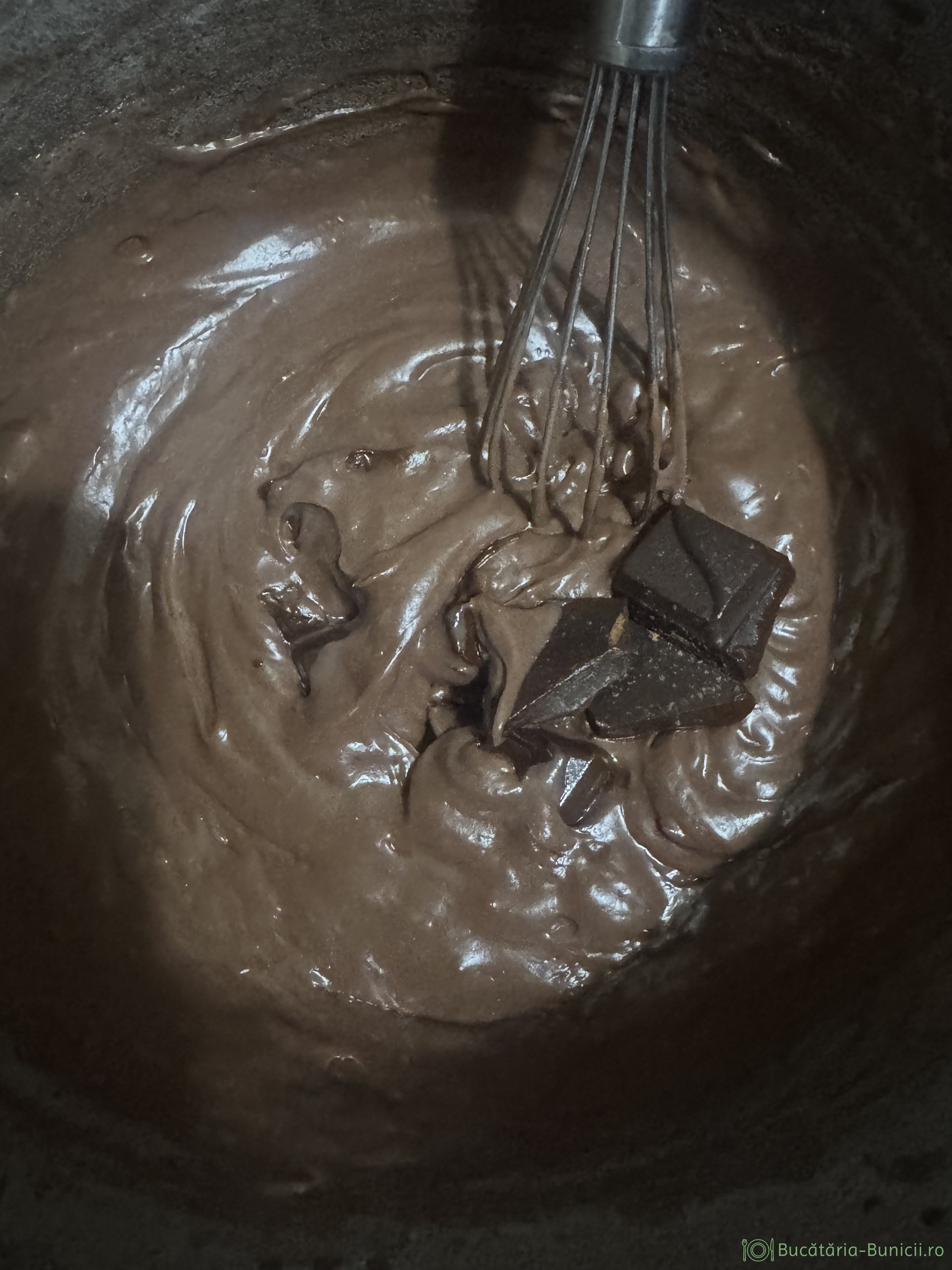 - Când crema s-a îngroșat, se oprește focul și se pune ciocolata ruptă bucăți. Se amestecă, până se topește ciocolata și este încorporată în cremă.